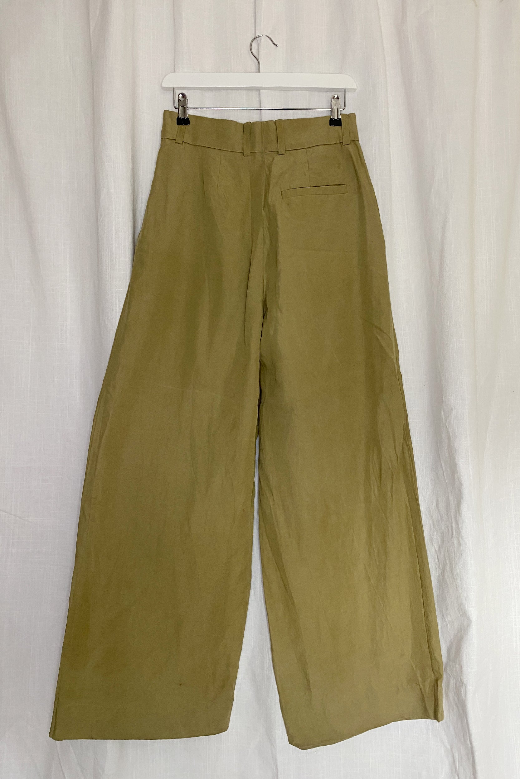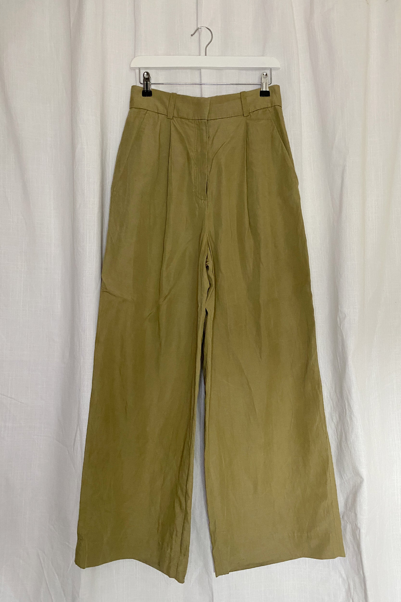 Crafted from a blend of Lyocell and breathable linen, these khaki-green high-waisted trousers feature pleats through the front to elongate the wide legs. The full-length hems pool elegantly at the floor. Features: belt loops, hook-and-bar closure with a fly zipper and welt pocket detail on the back.