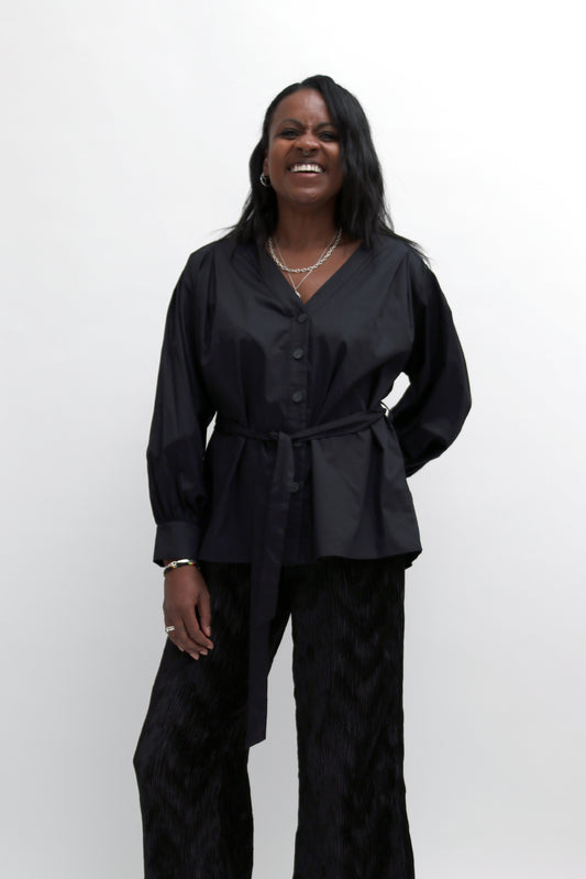 Sold outBUTTON FRONT TIE-WAIST BLOUSE
