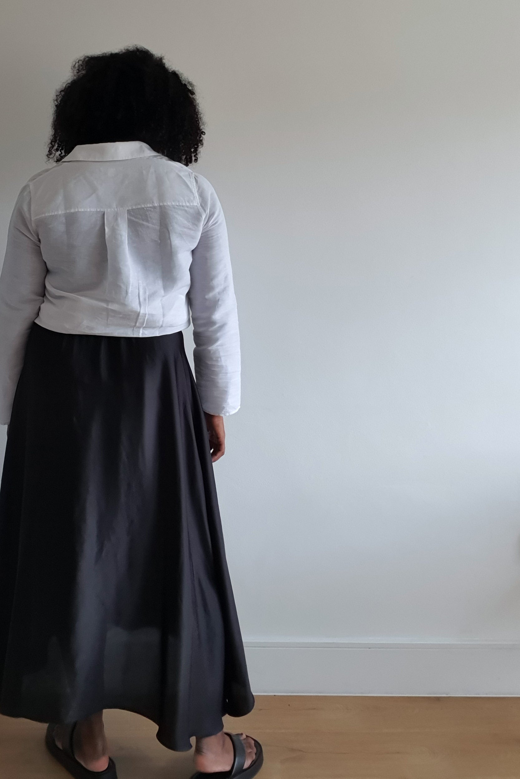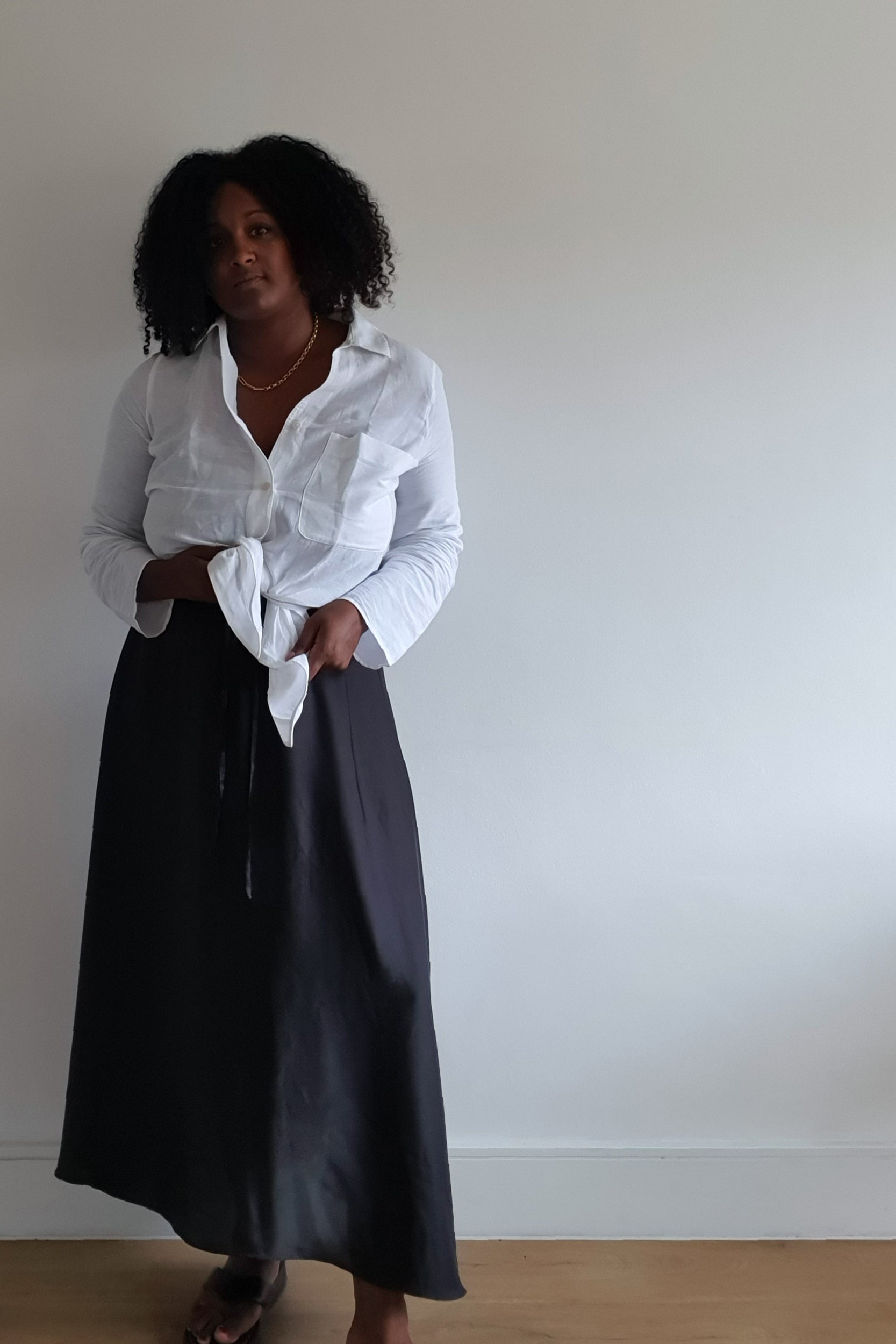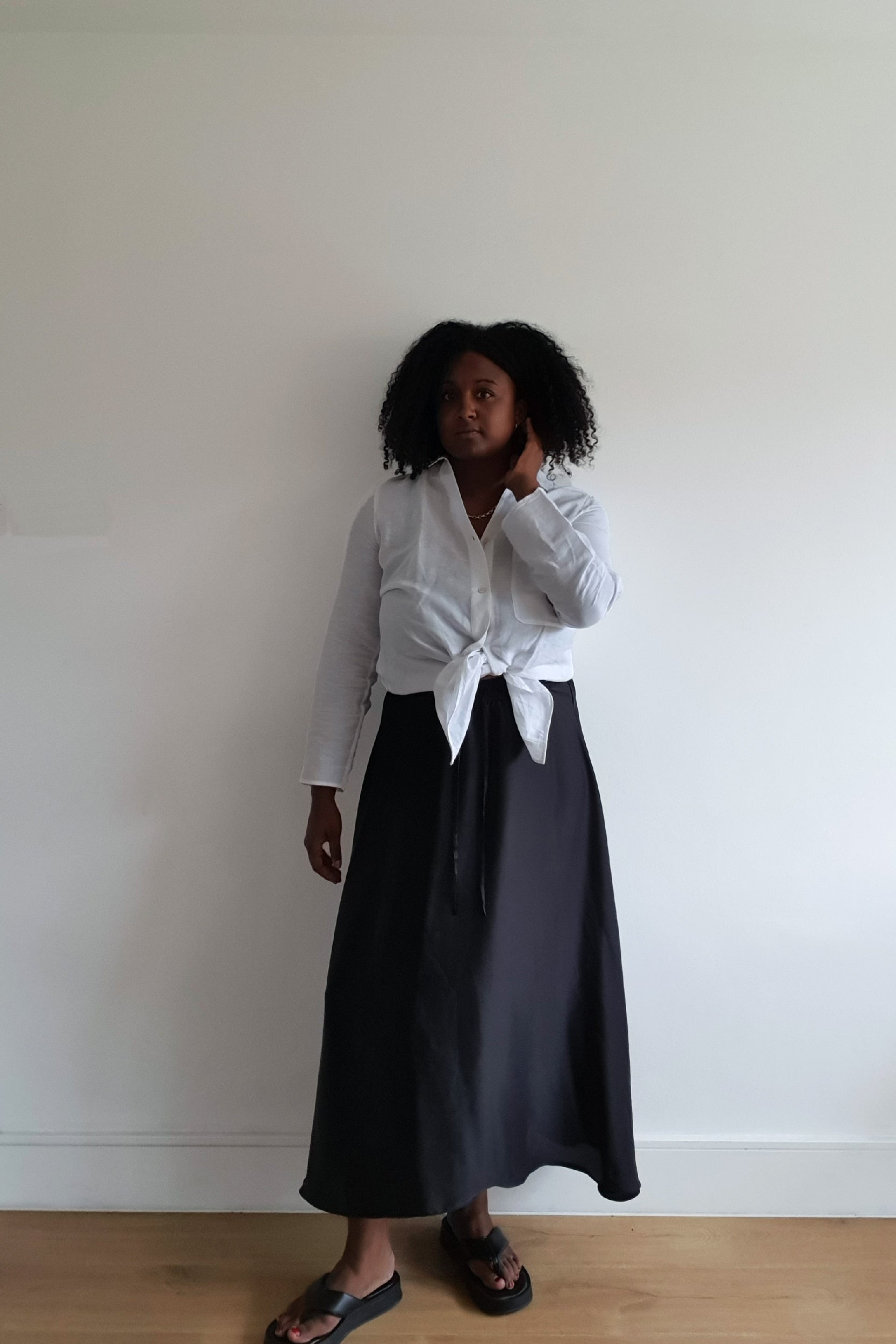 Fit Notes: Adjustable drawstring on waist, with draped volume through the skirt. Shown here on Victoria, who is 5'7" and usually wears a UK 14