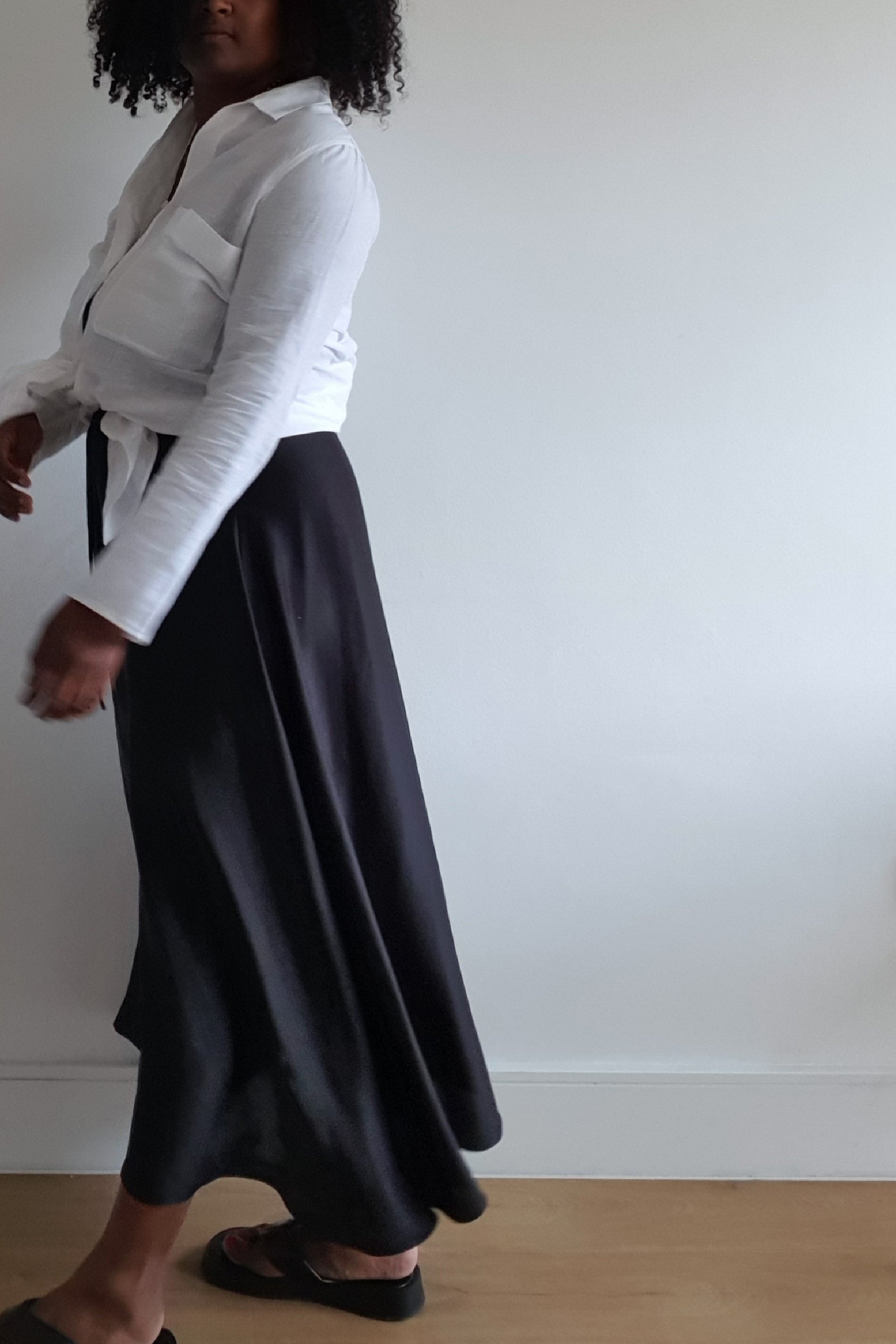 This pre-loved Arket midi satin skirt is truly an any season staple, with an easy-to-wear elasticated waist. Made from recycled polyester, the skirt is cut to drape beautifully, with an asymmetric waterfall hemline which is cut to a mid-calf length.