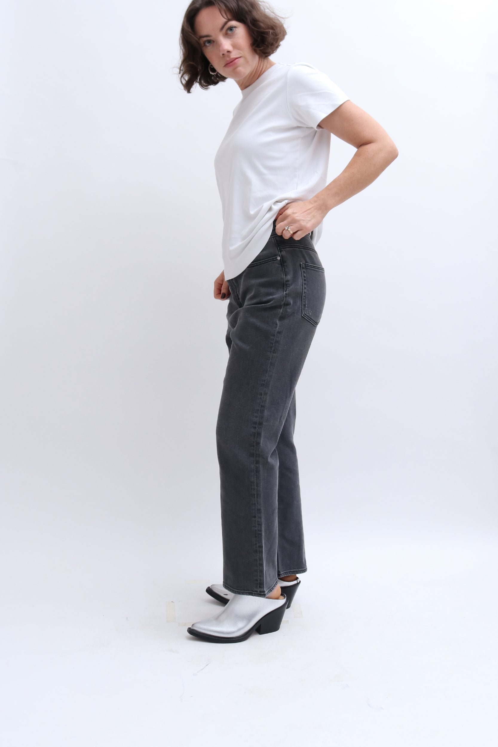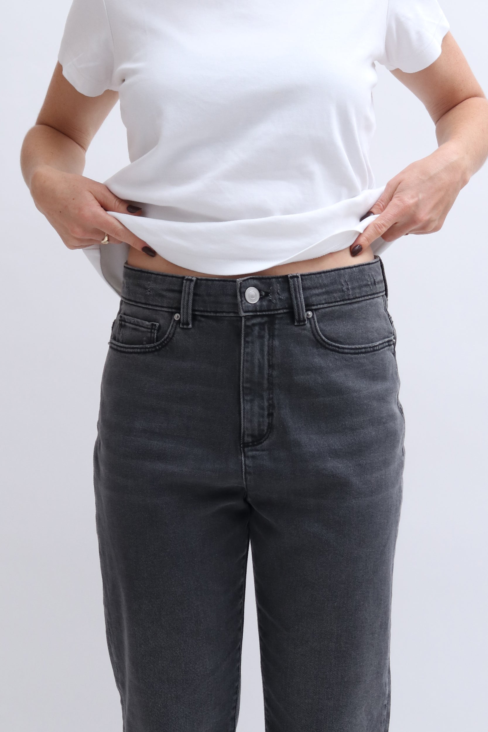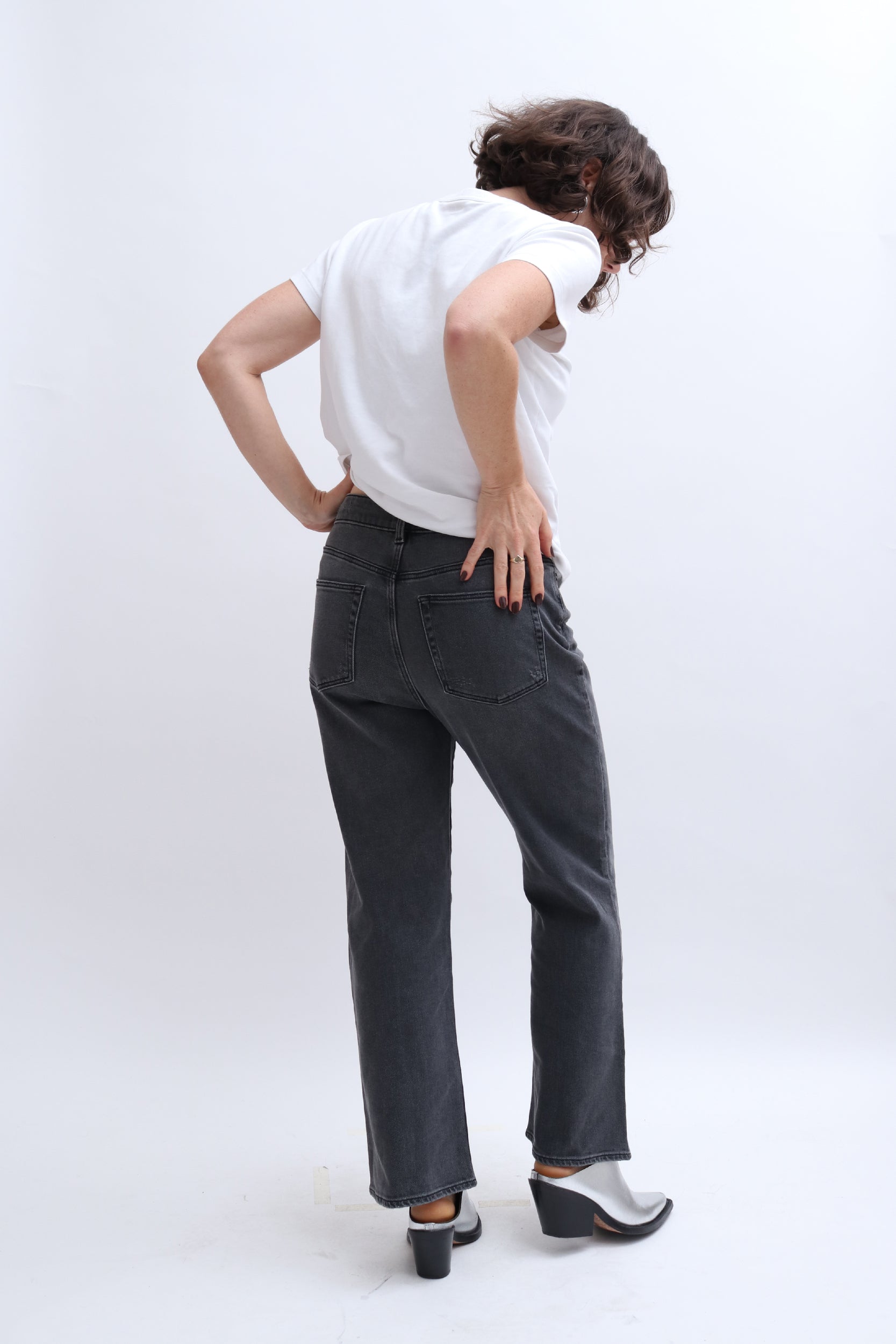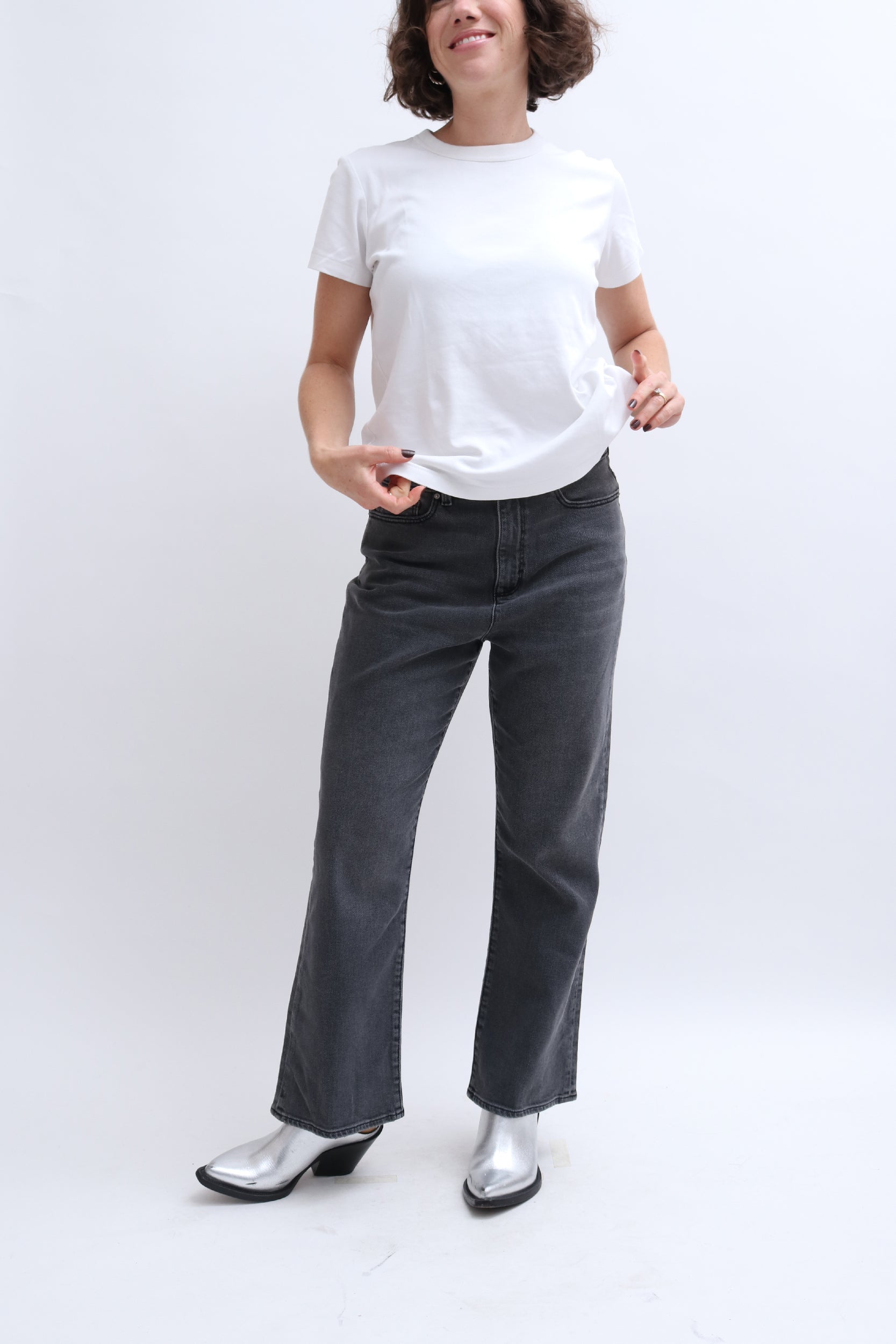 We love these charcoal cropped kick flare jeans. Cut from a cotton elastane blend, making them a comfortable option for everyday wear, they are designed to fit high waisted and have a subtle kick flare.