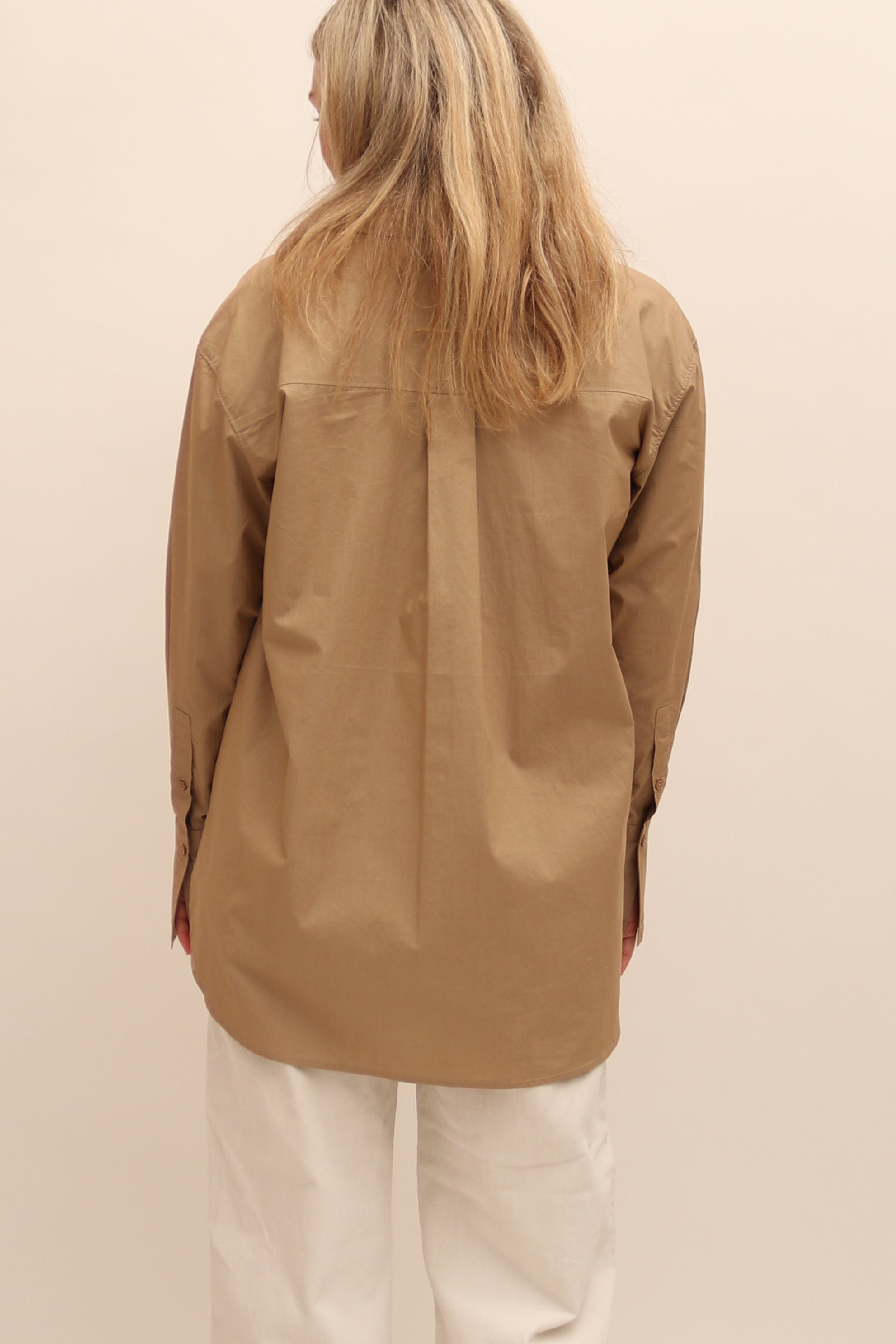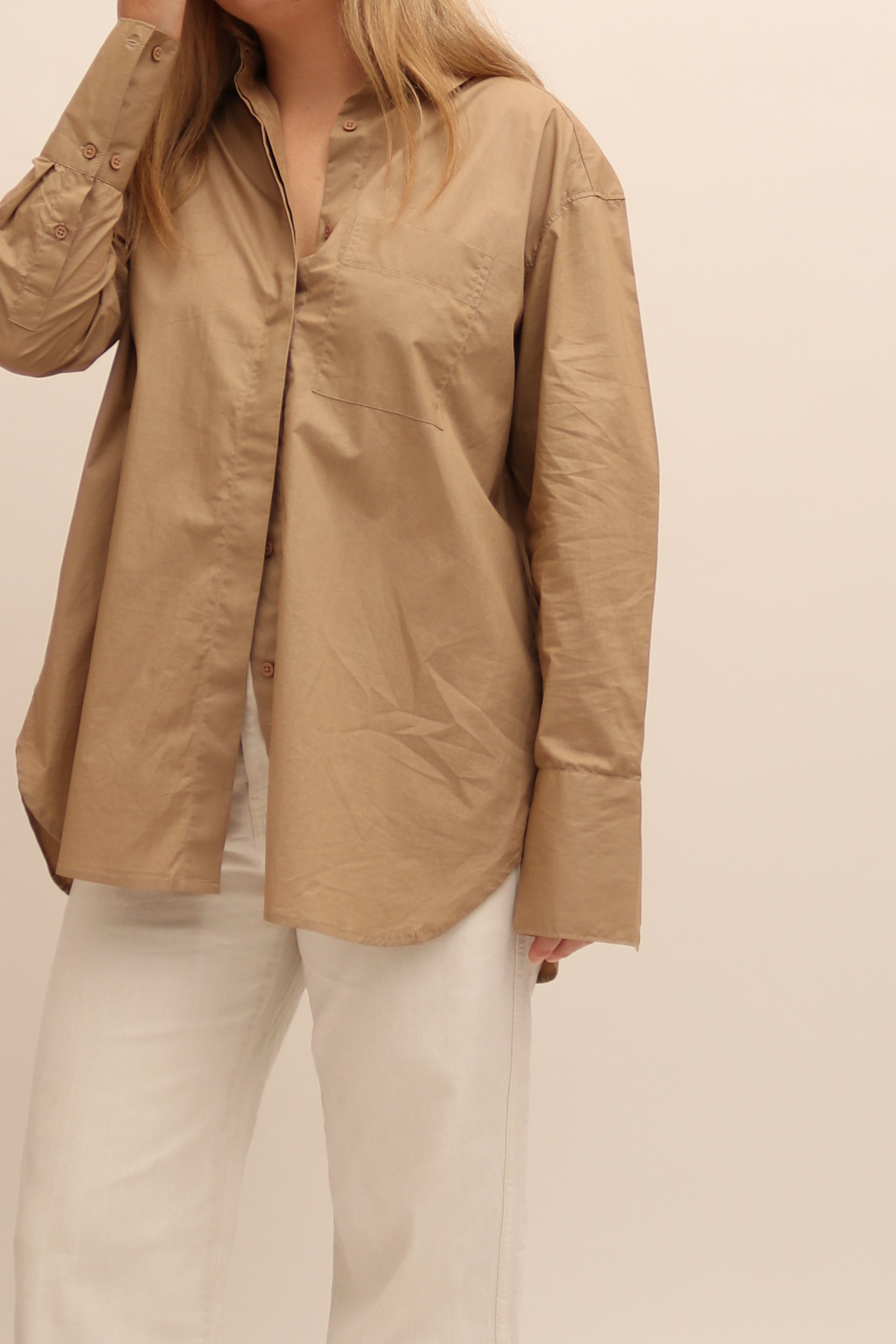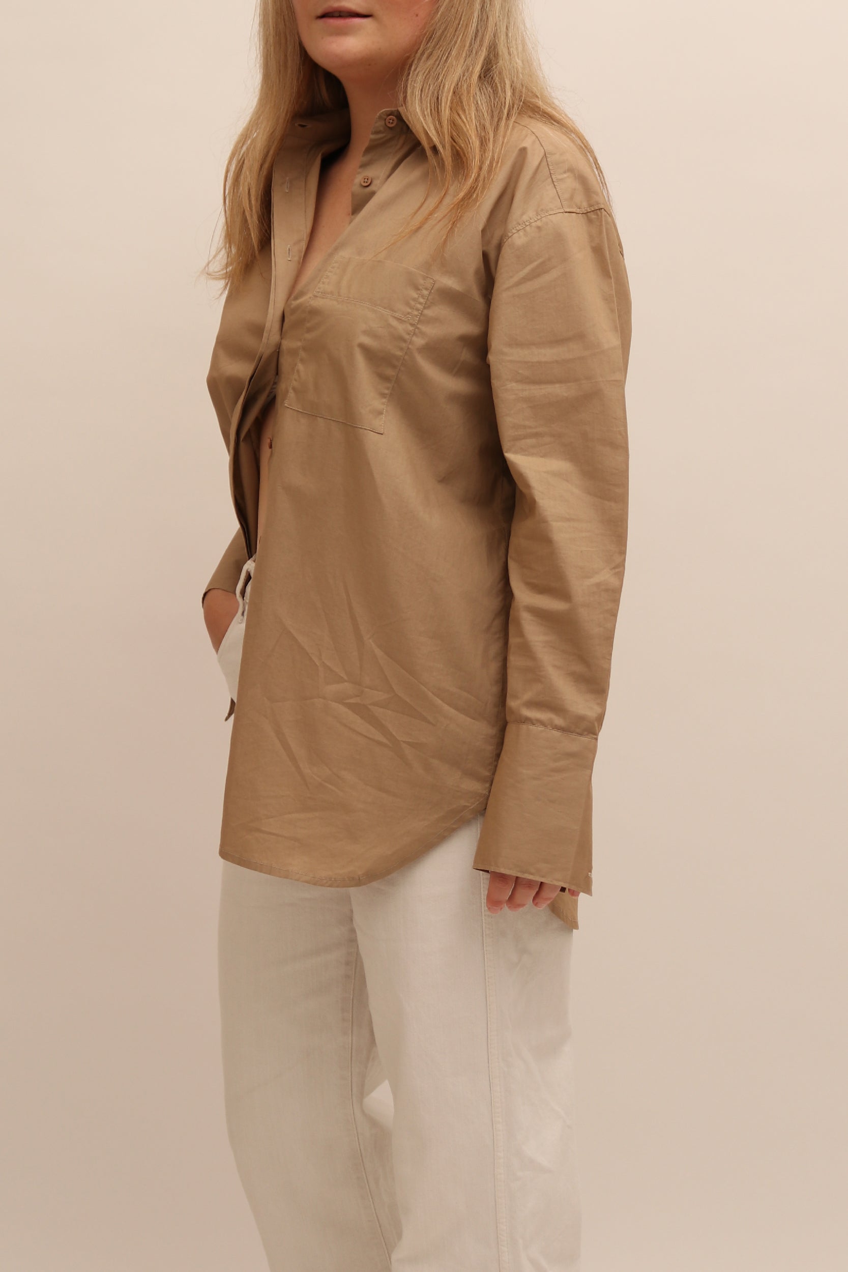 This relaxed fit cotton blend shirt is a contemporary take on a classic shape in a butterscotch hue. Featuring design details such as concealed buttons and one front pocket, the shirt has been cut for an oversized fit.
