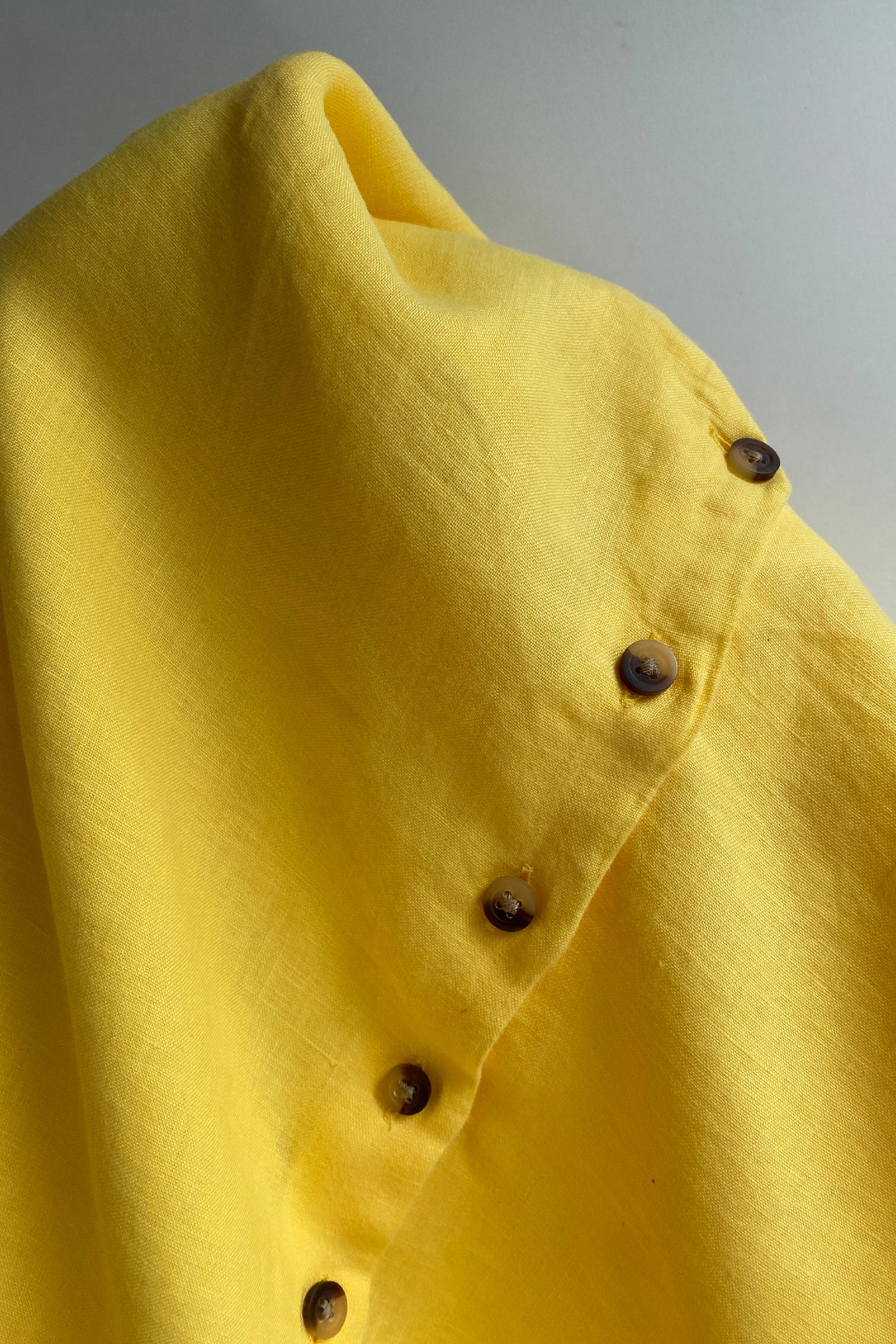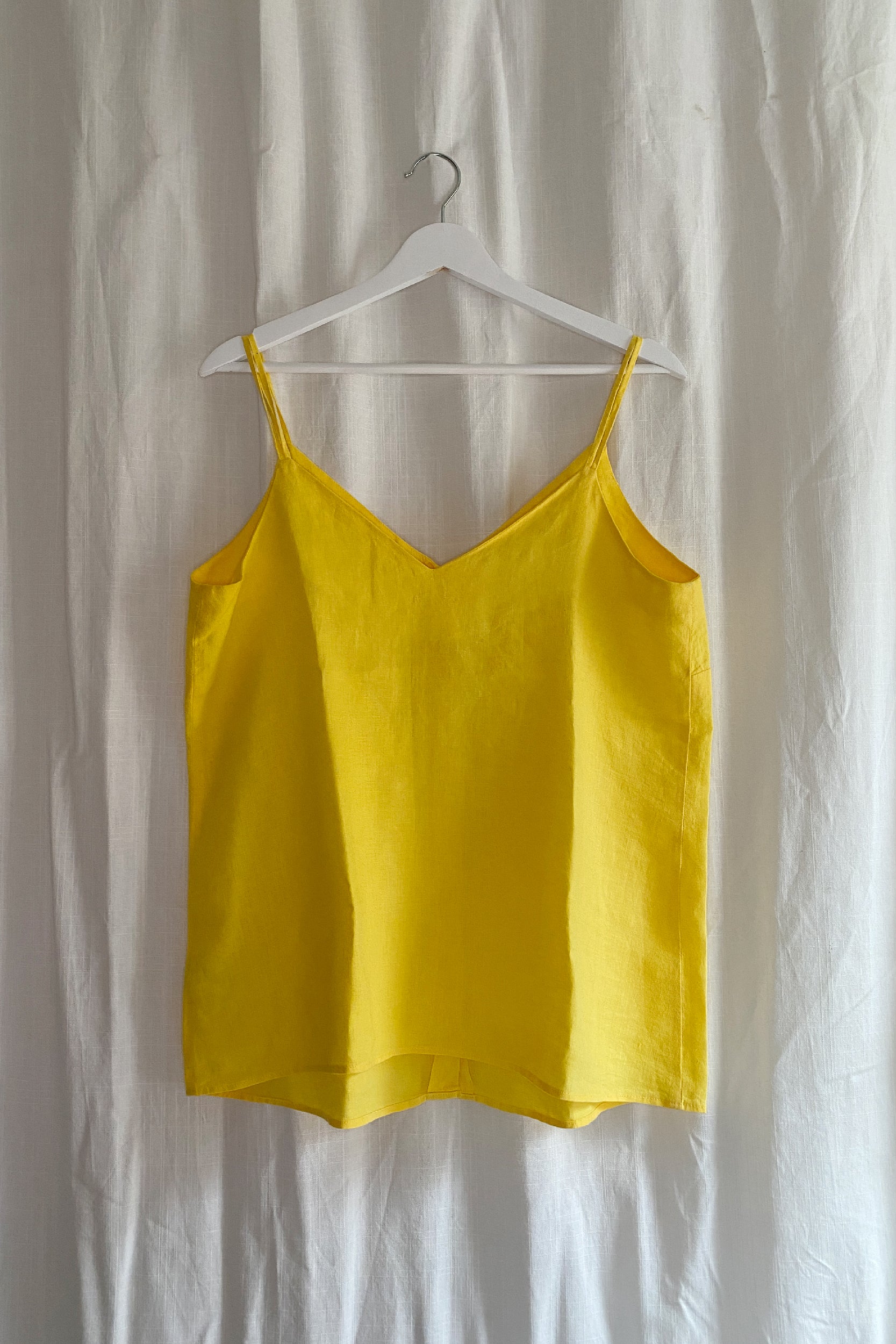 Easy wear, linen cami. This sunflower yellow linen piece features a soft v-neck, double spaghetti strap and button-through detail. We like to style this at the back, however the piece is cut in a way that will allow it to be worn either way.