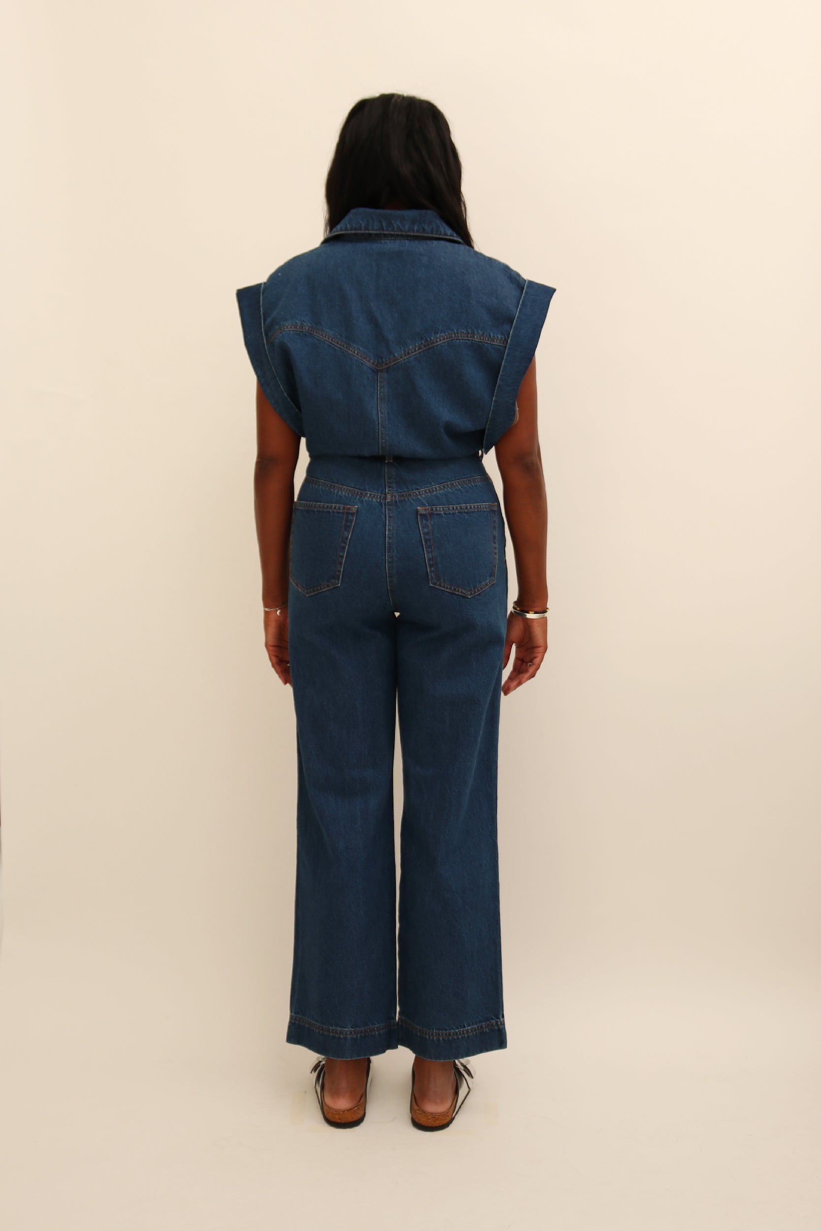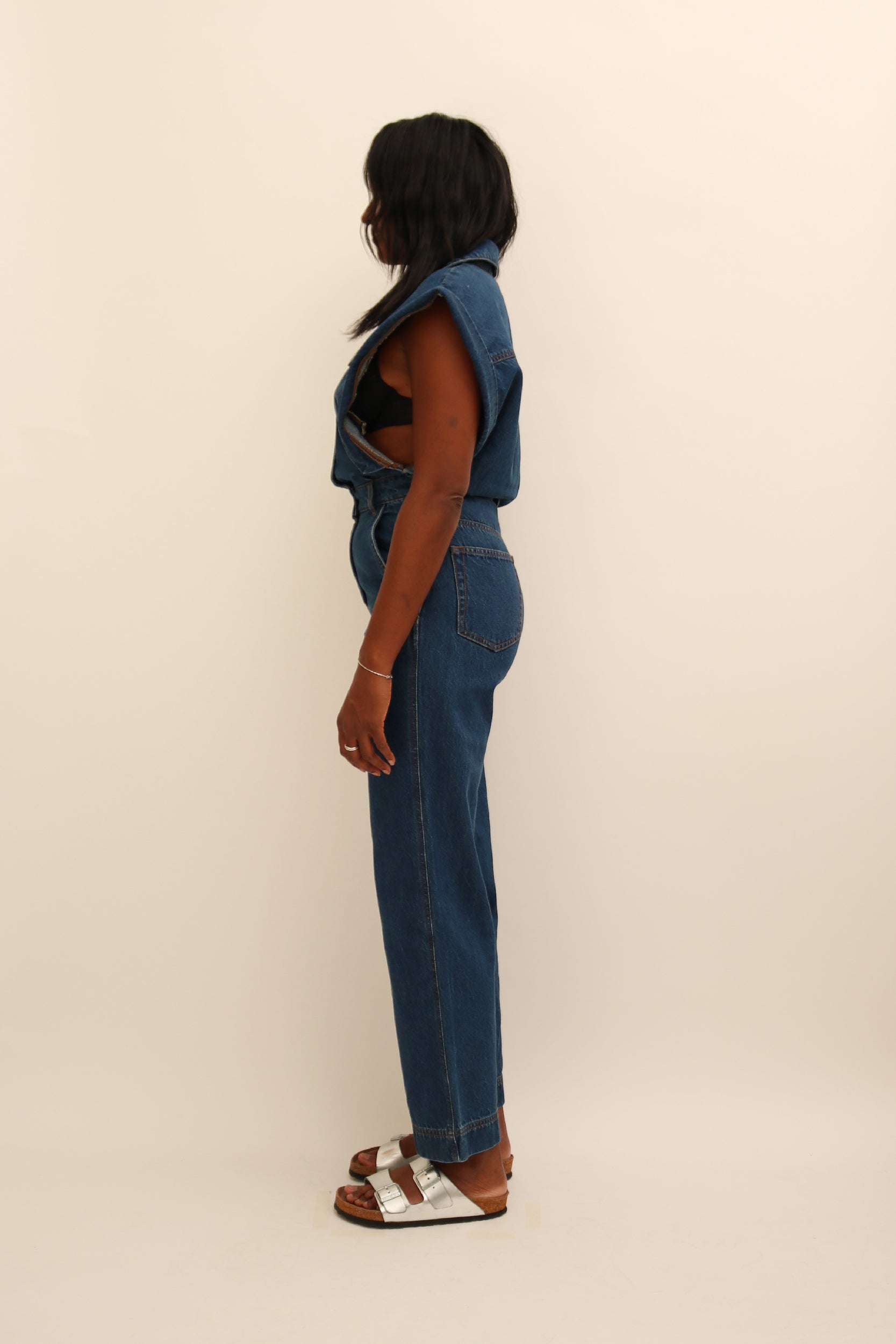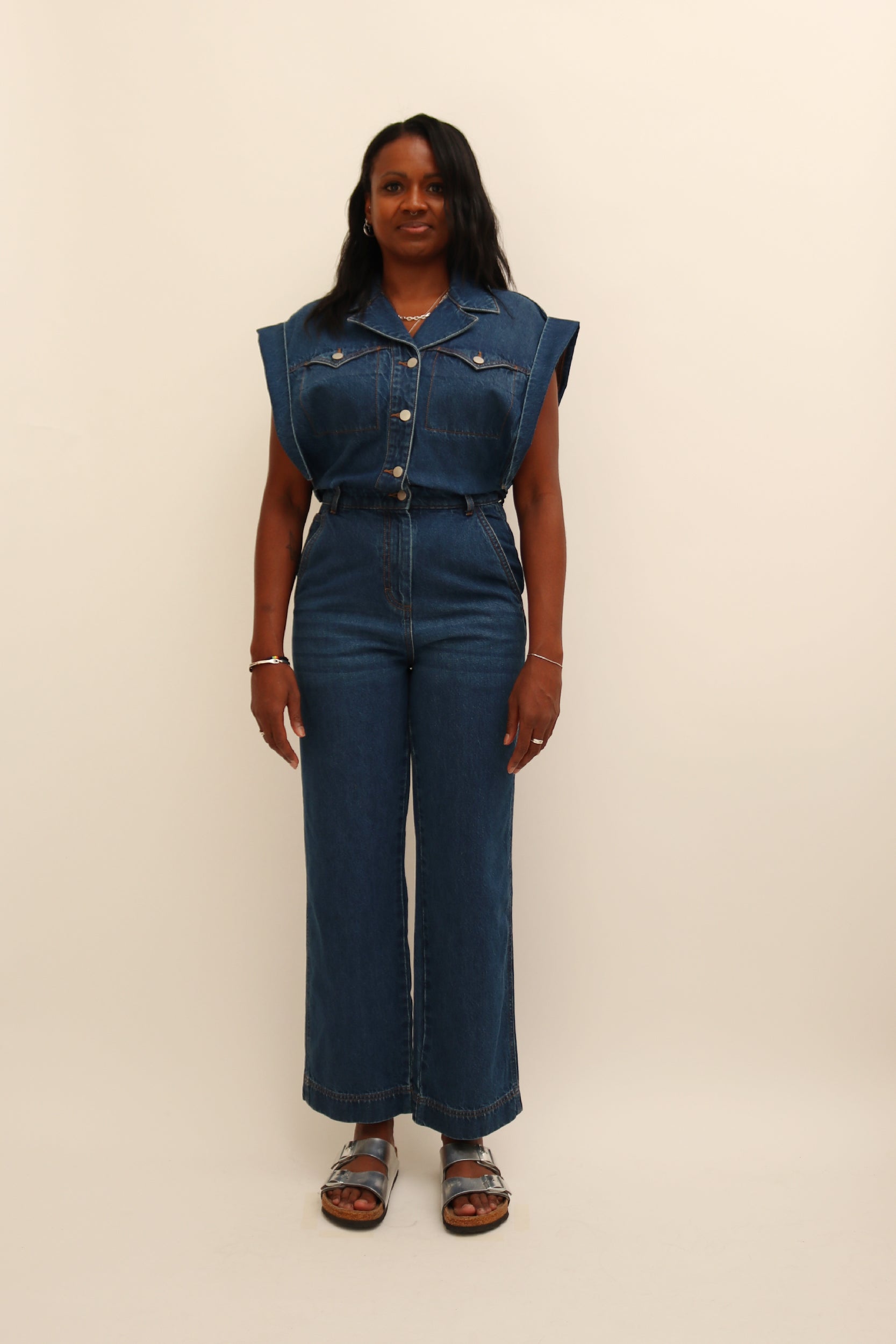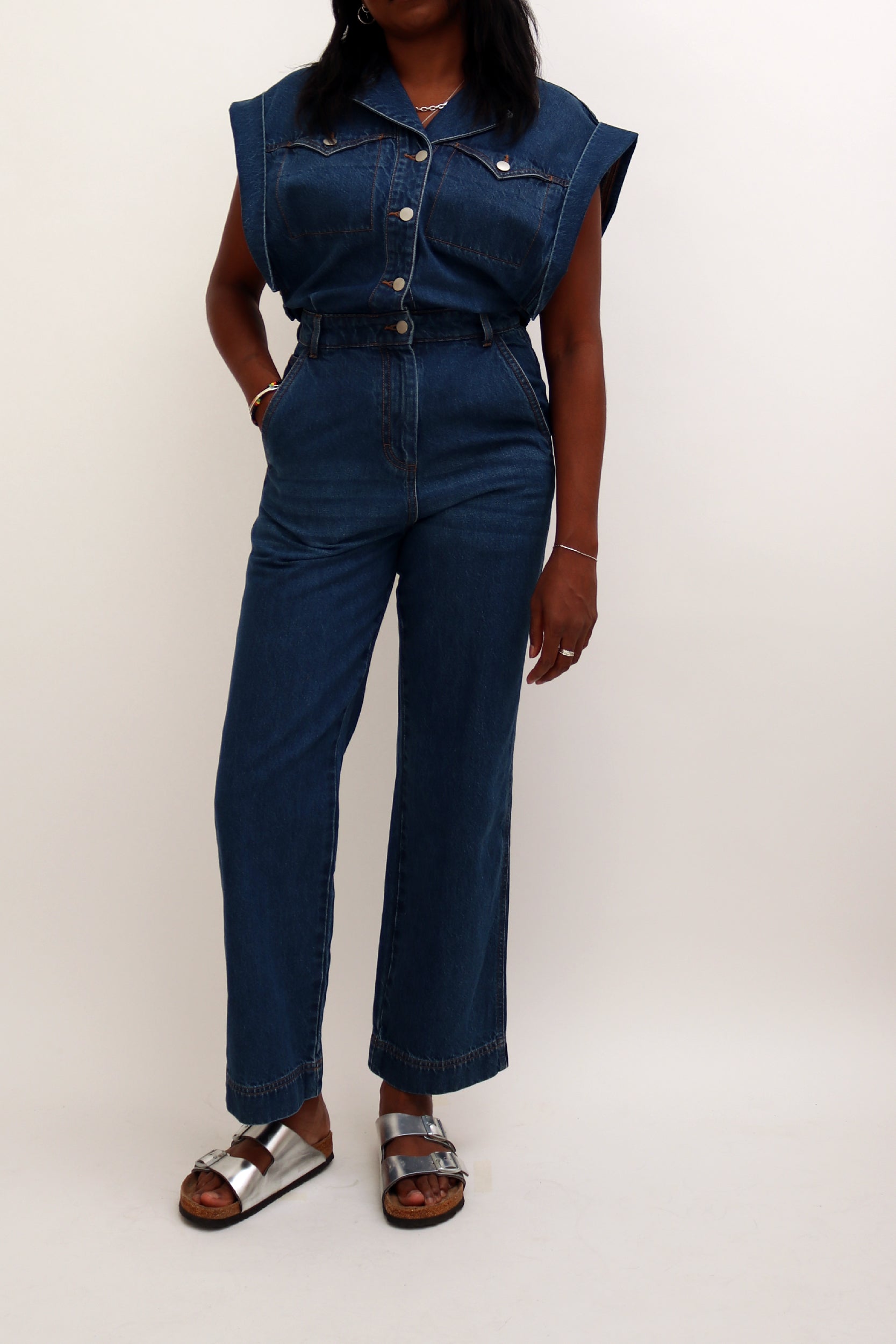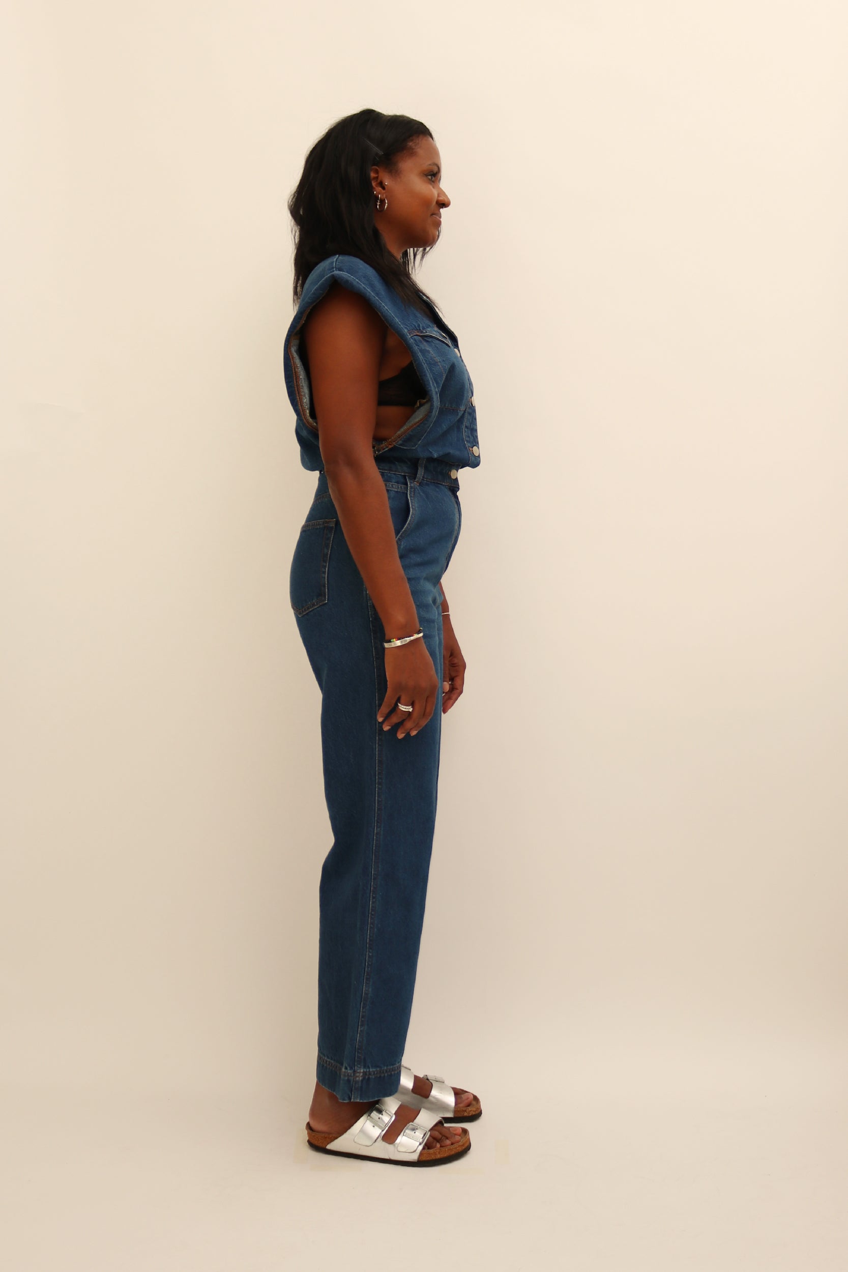 This denim jumpsuit is the perfect transitional wardrobe piece. Its contemporary design will make you feel elevated with minimal effort and lends itself to the changing temperatures of the season. It’s designed with a fitted waist and a straight leg all in a rich vintage blue denim.