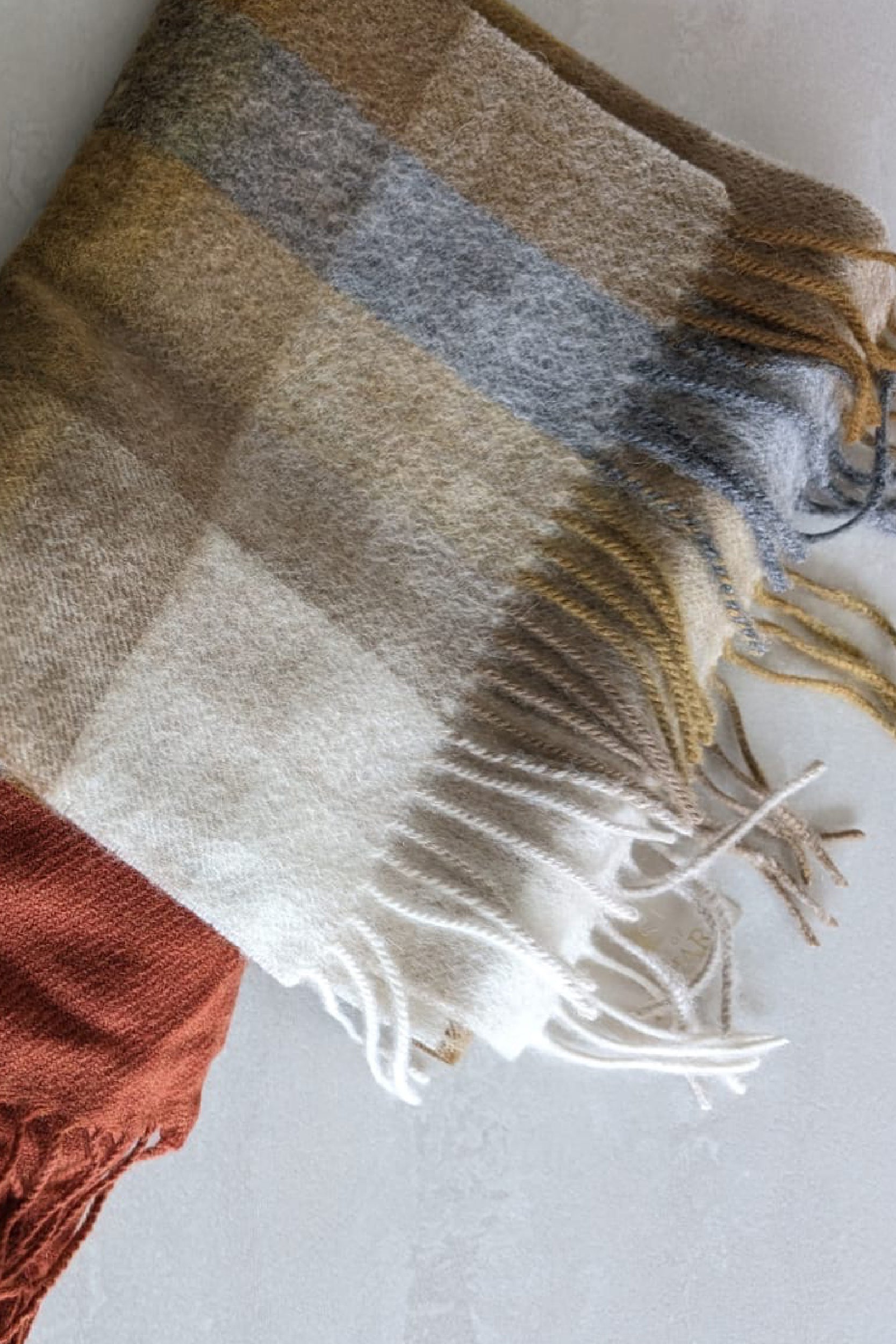 A classic lambswool scarf in easy-to-style, neutral toned check.