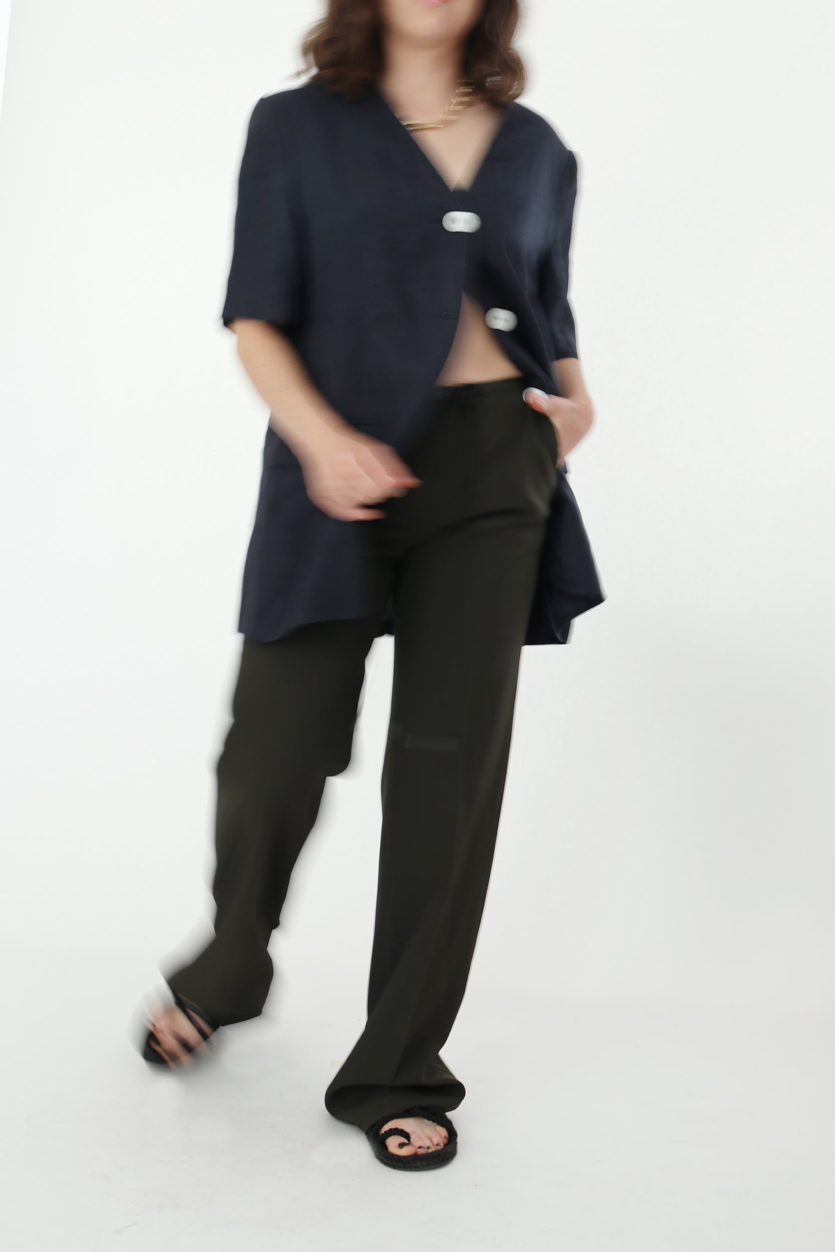 These vintage khaki tailored trousers are a pair that need be seen on - because they are showstoppers. Designed for a low rise, the trousers are adorned with tie detail and crafted from lightweight material making them a comfortable option for summer and beyond. .