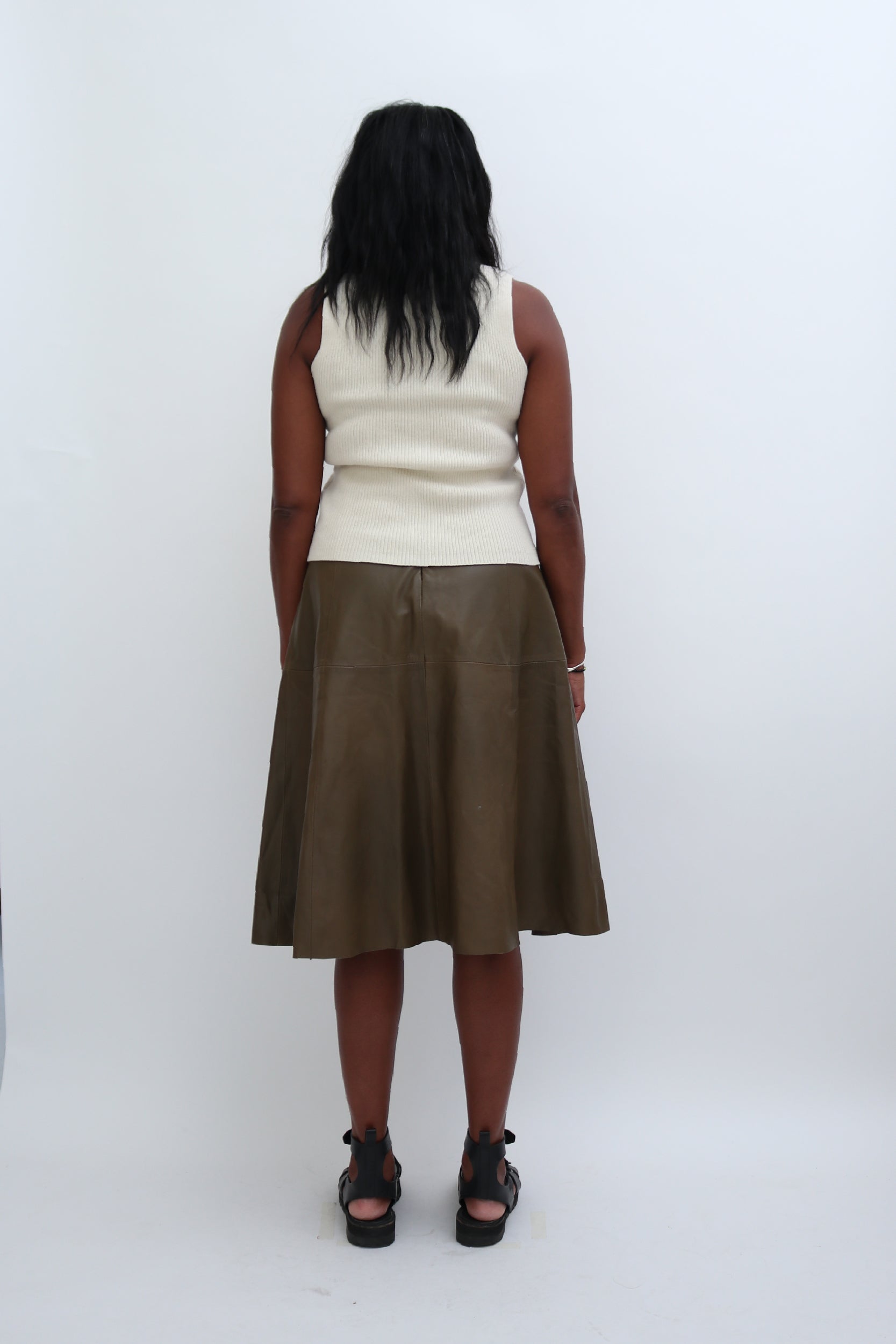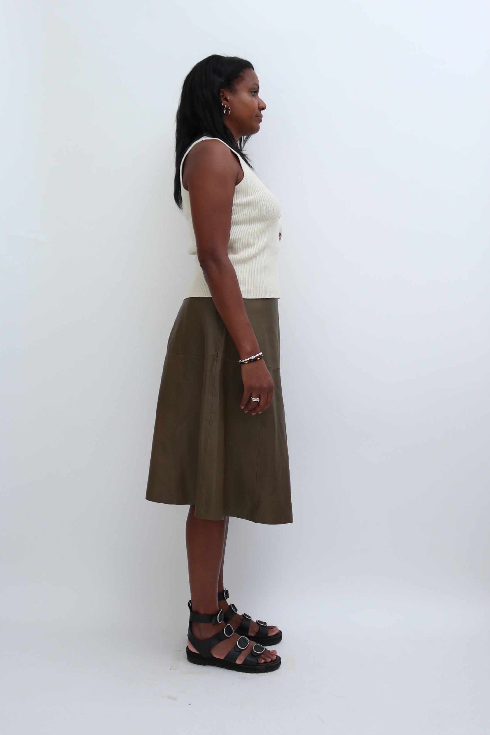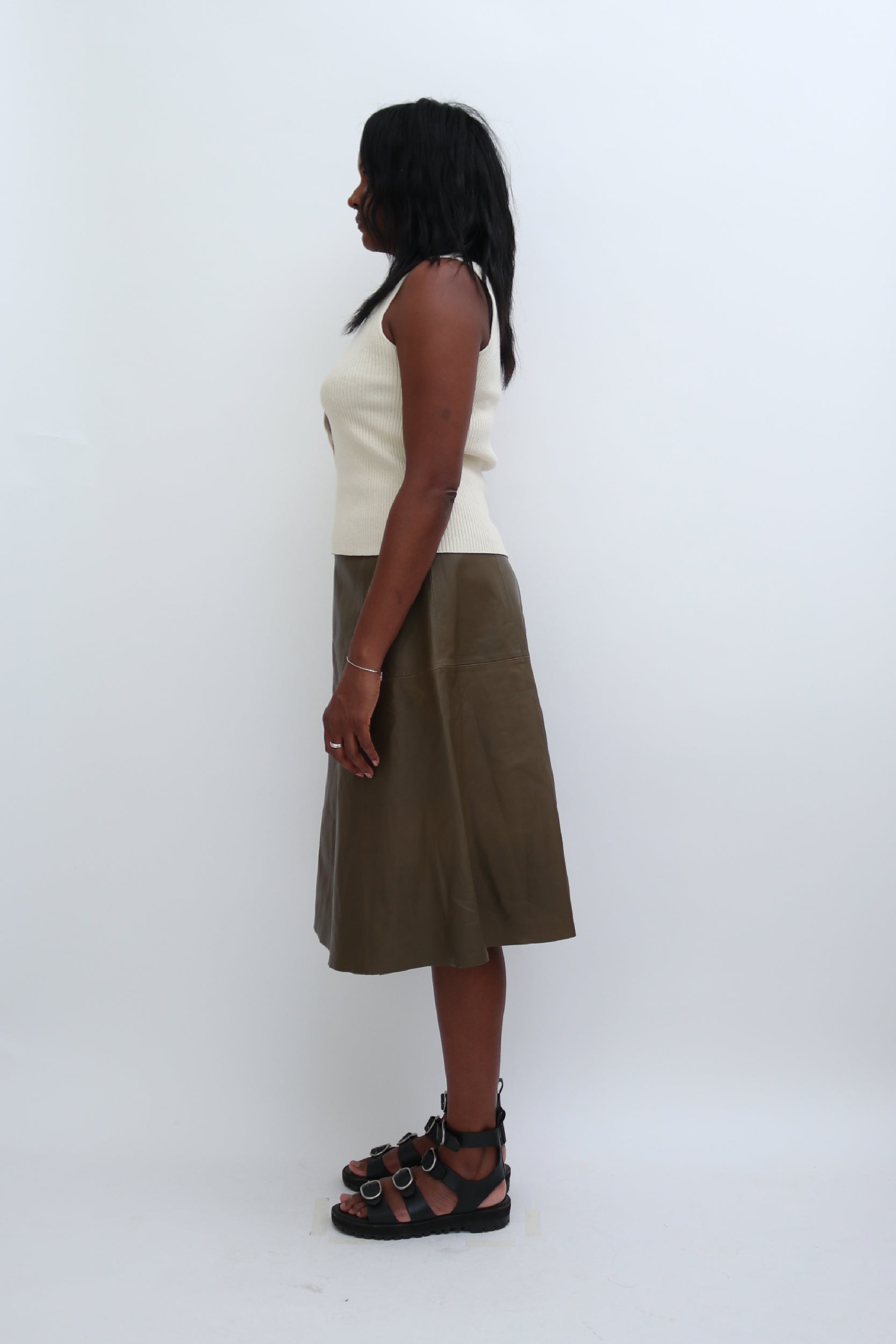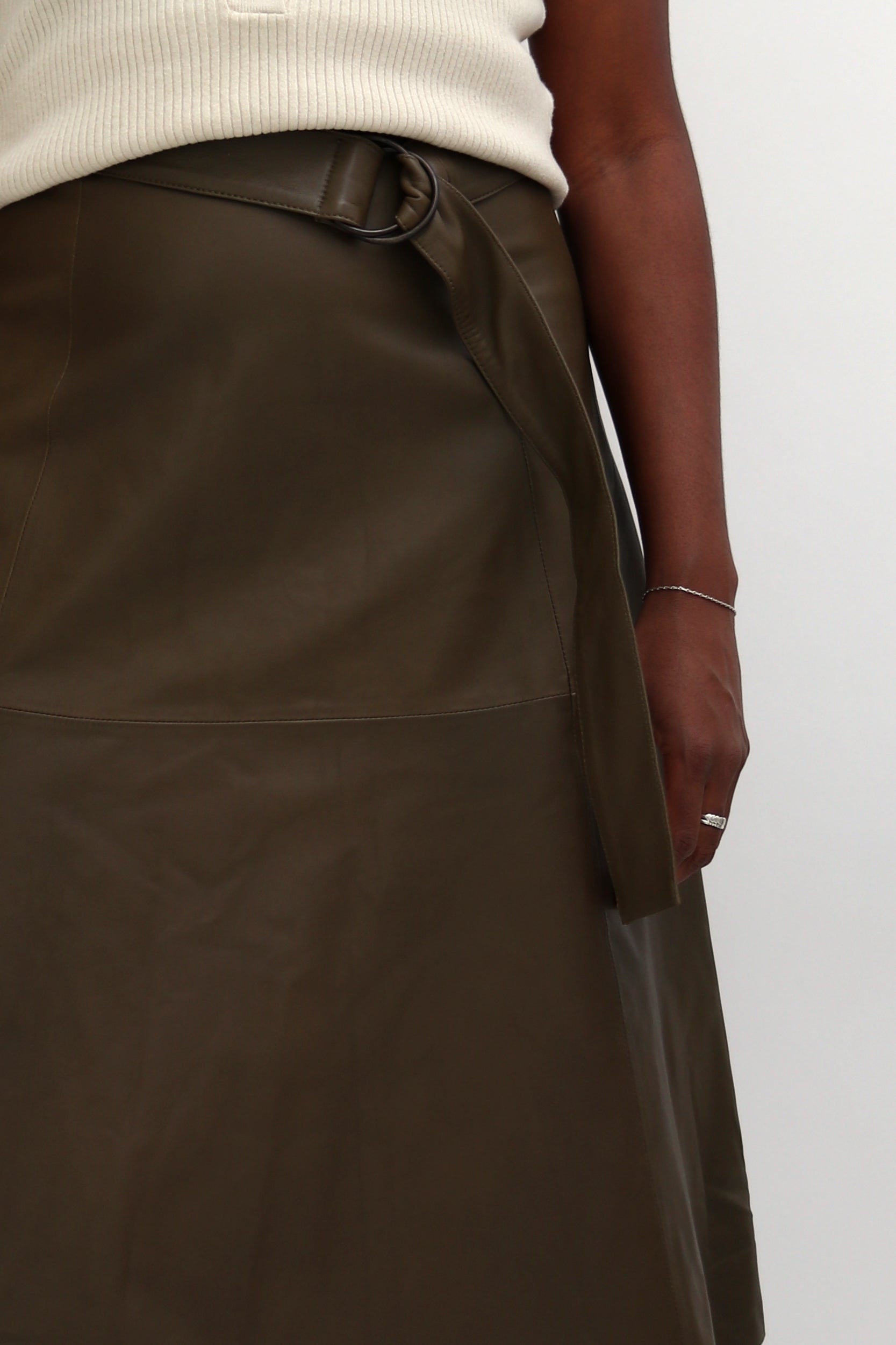 This leather midi skirt is an easy way to add texture into your wardrobe. Crafted from supple leather in an autumnal olive hue, it’s cut to create a gentle a-line shape and can be worn with or without the additional belt.