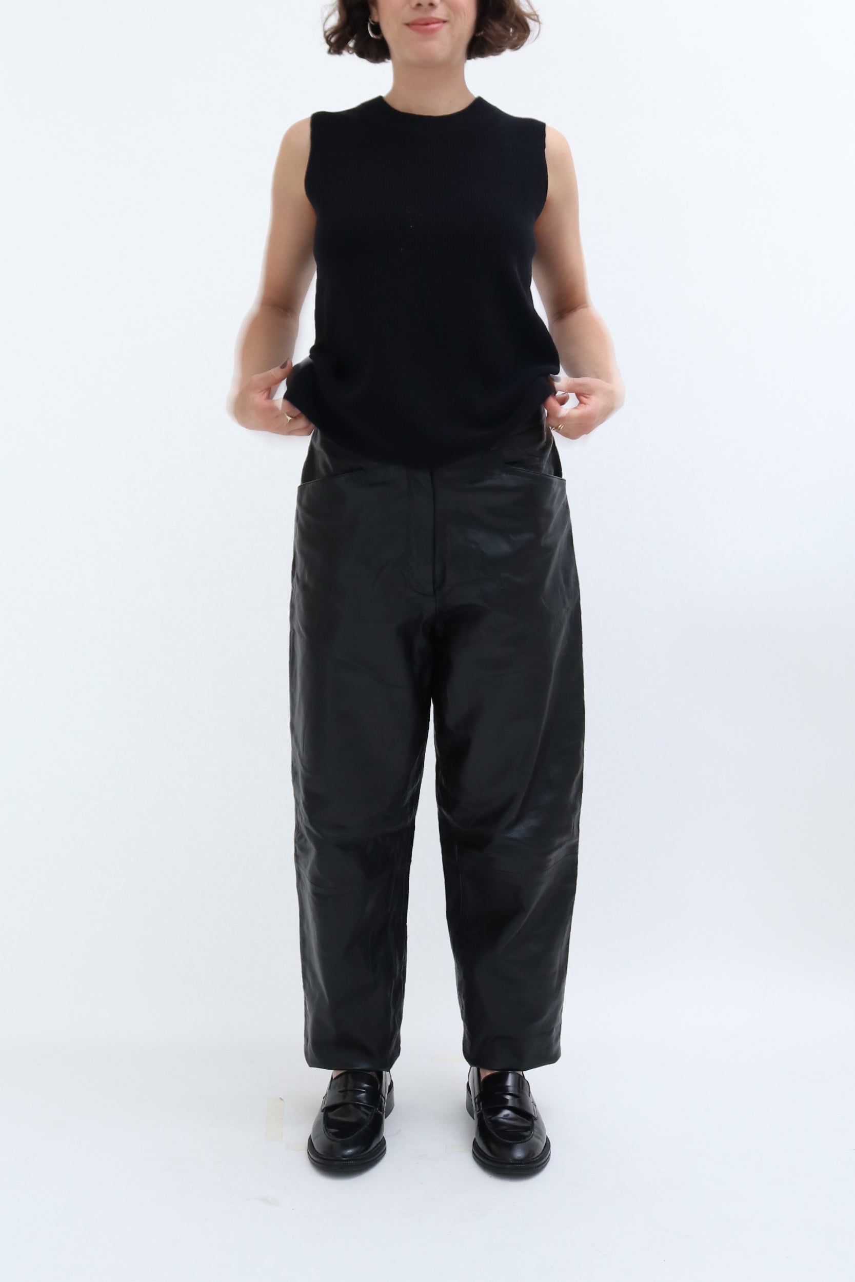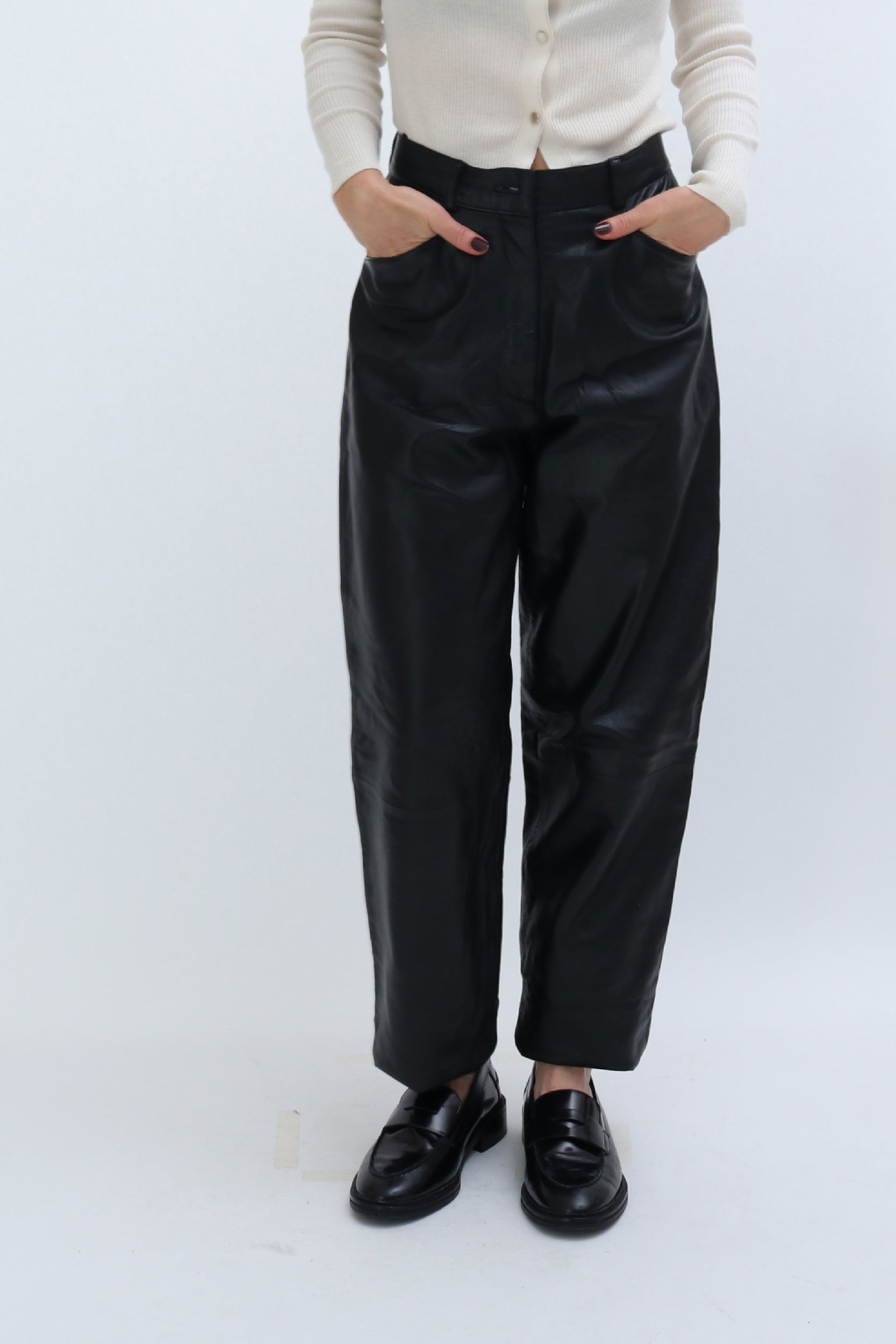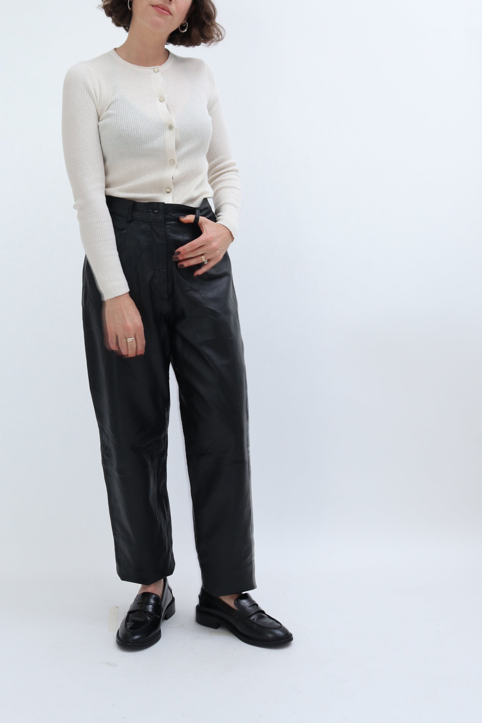 Style Notes: These tapered leather trousers look great paired with knits. Try teaming with our pre-loved Cos Sleeveless Vest, Cream Ribbed Cardigan or Vintage Argyl Jumper with our Vintage Khaki Trench. as shown in our product images.