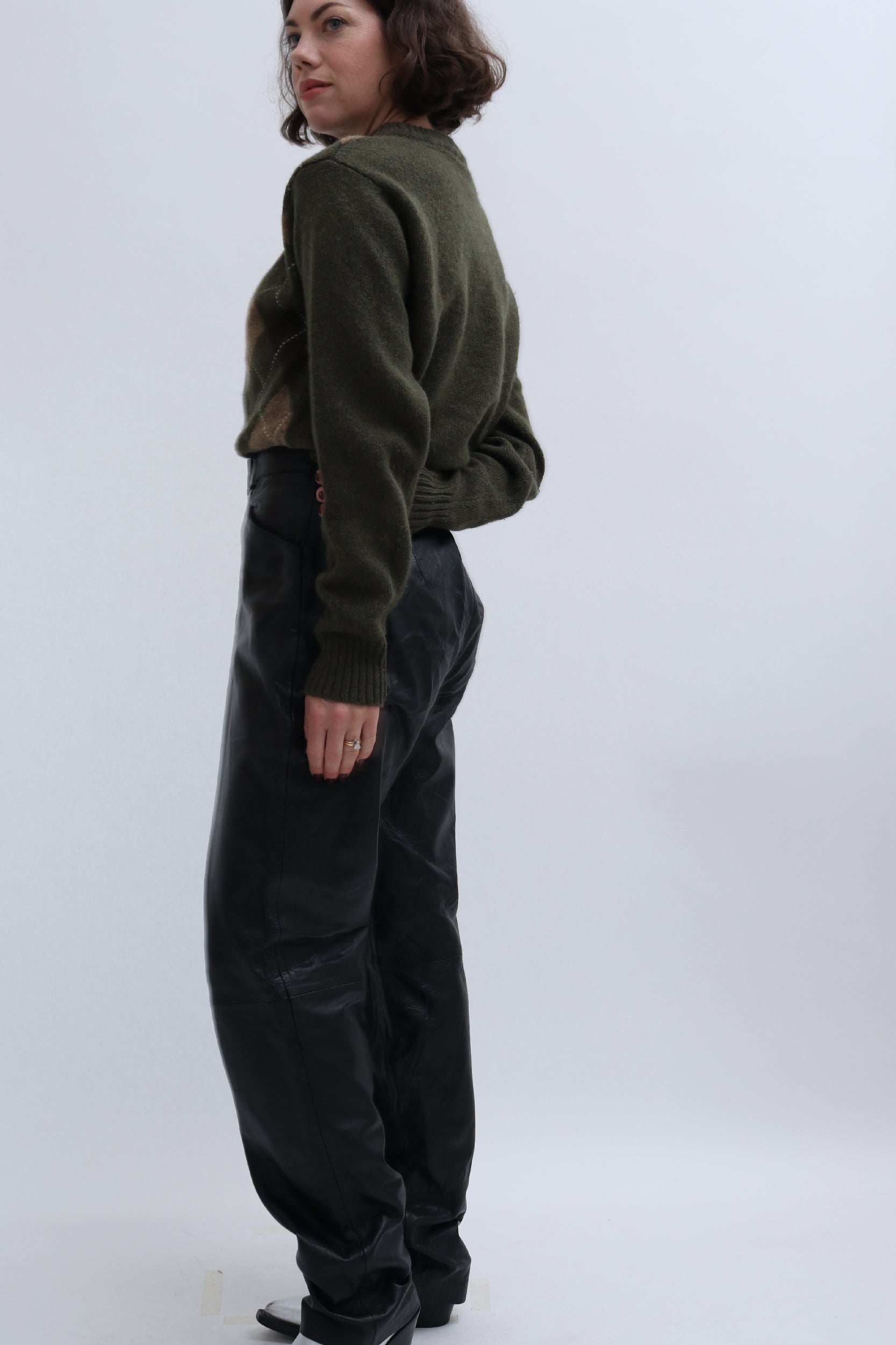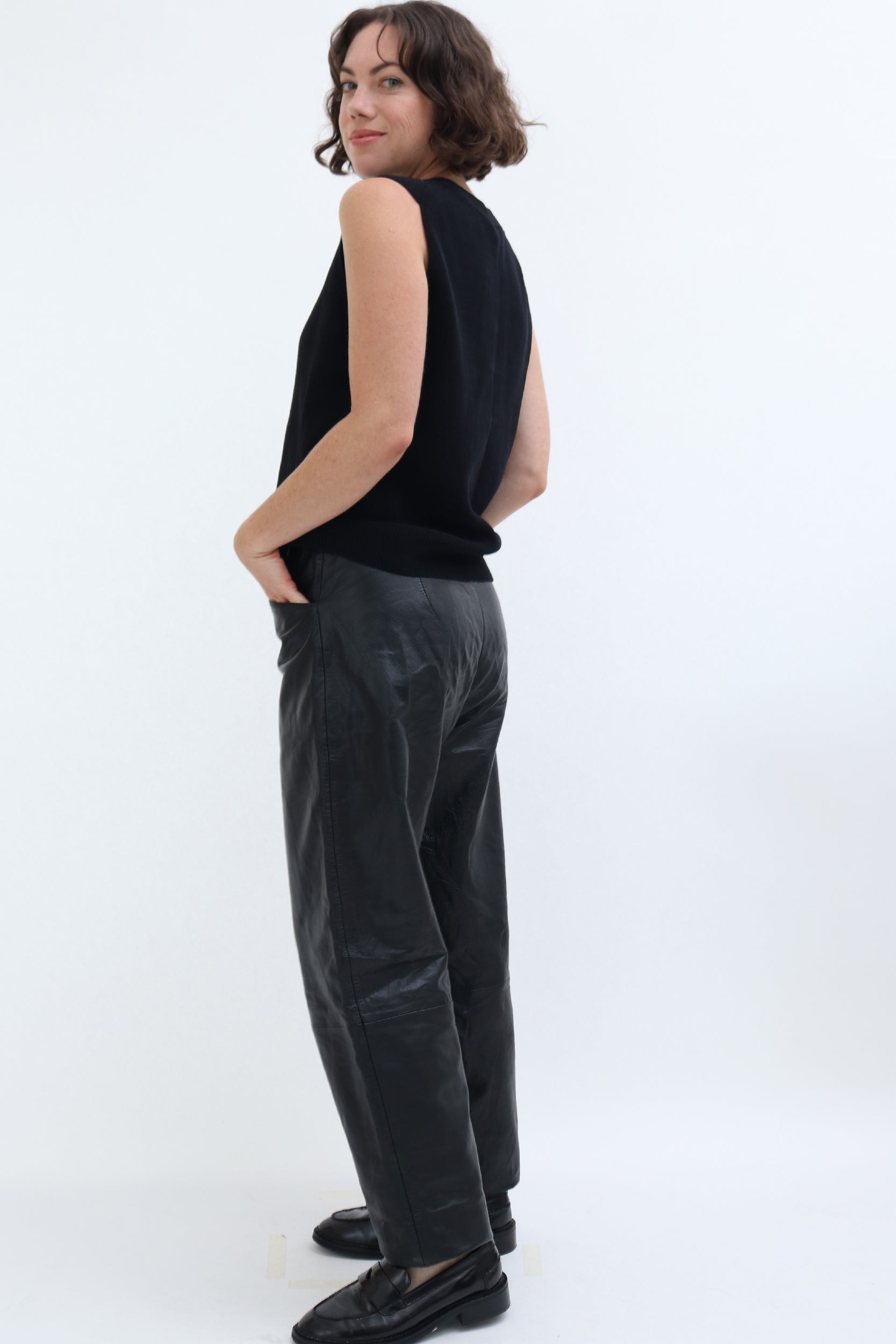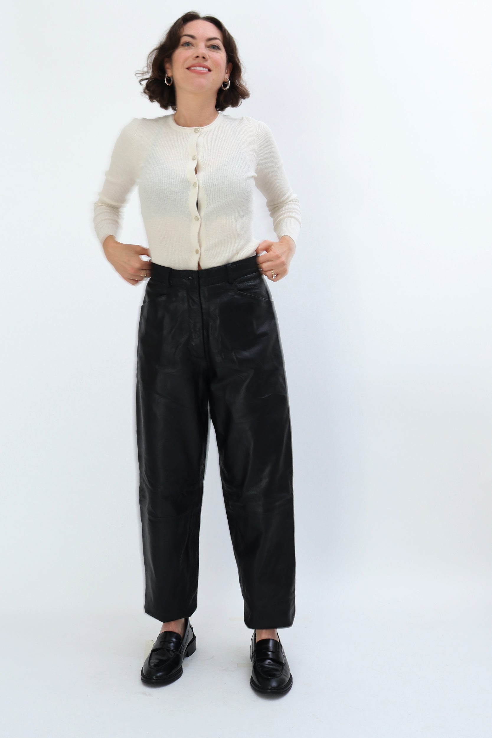 Style Notes: These tapered leather trousers look great paired with knits. Try teaming with our pre-loved Cos Sleeveless Vest, Cream Ribbed Cardigan or Vintage Argyl Jumper with our Vintage Khaki Trench. as shown in our product images.