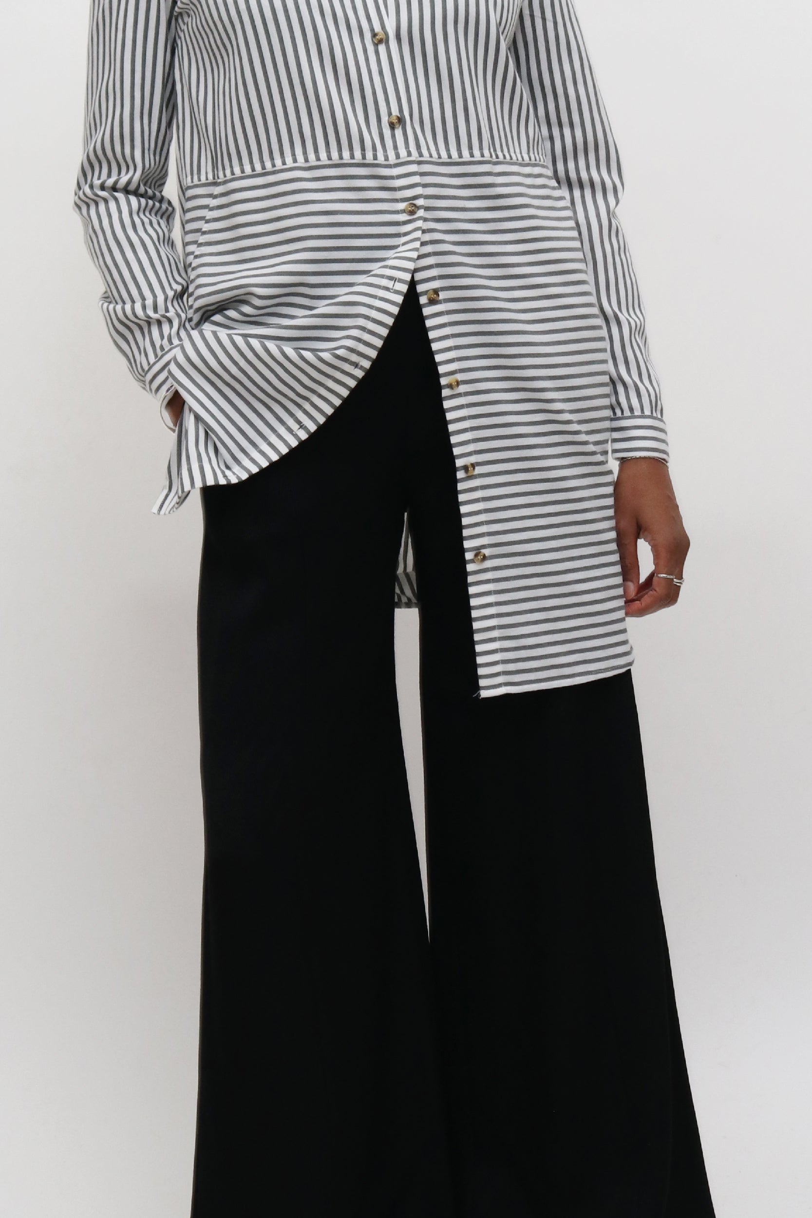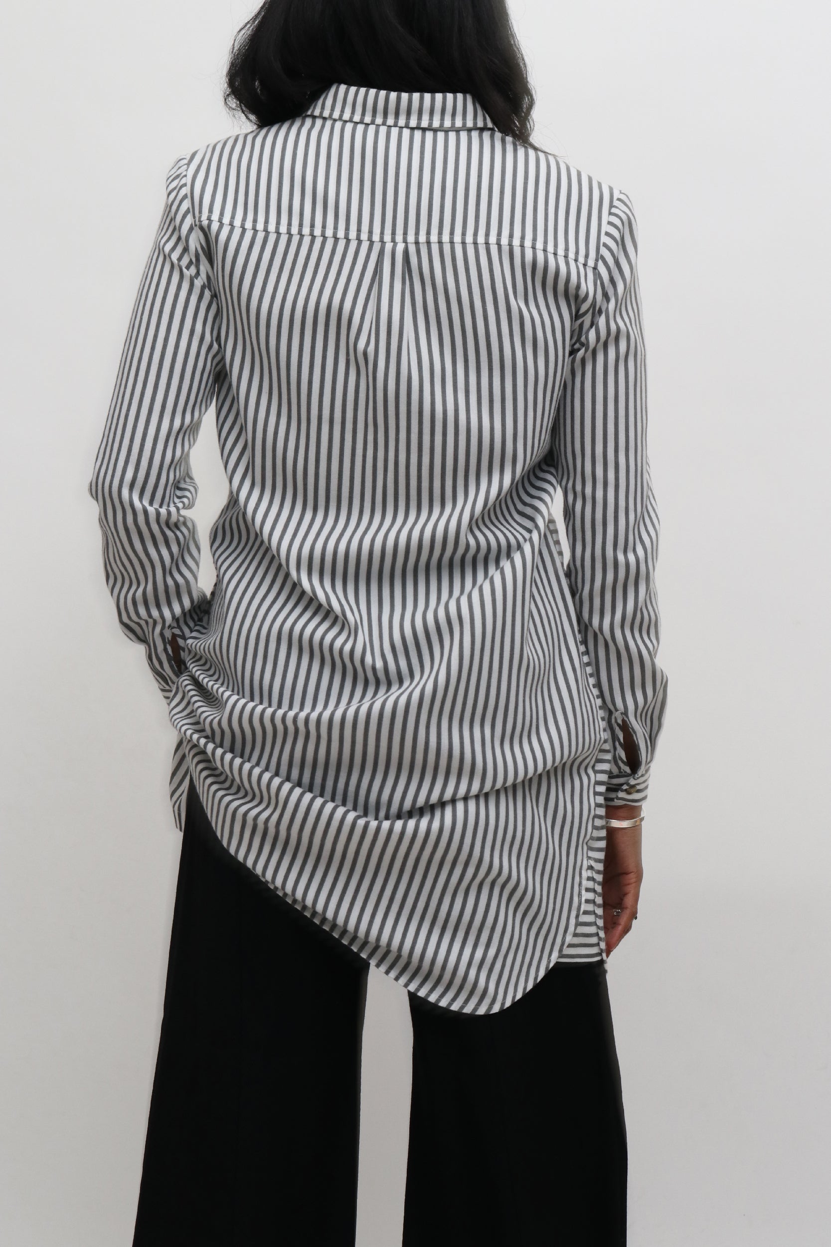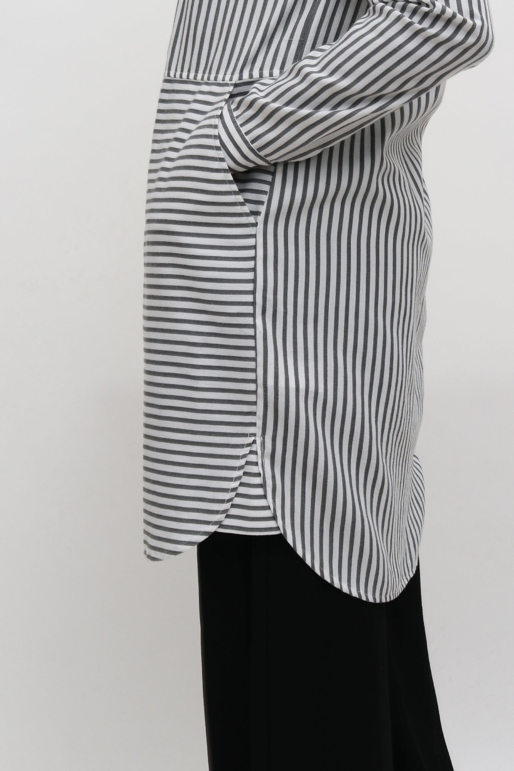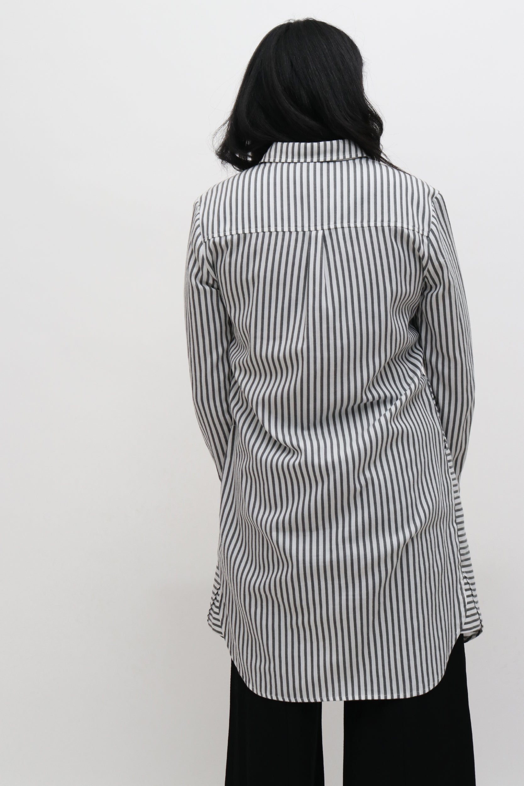This shirt is an update on a classic striped shirt, with a striking horizontal and vertical stripe pattern. We love the elevated design details such as the longline silhouette and additional side gussets which add a luxury touch. An easy everyday shirt which will double up perfectly to throw over swimwear come summer.