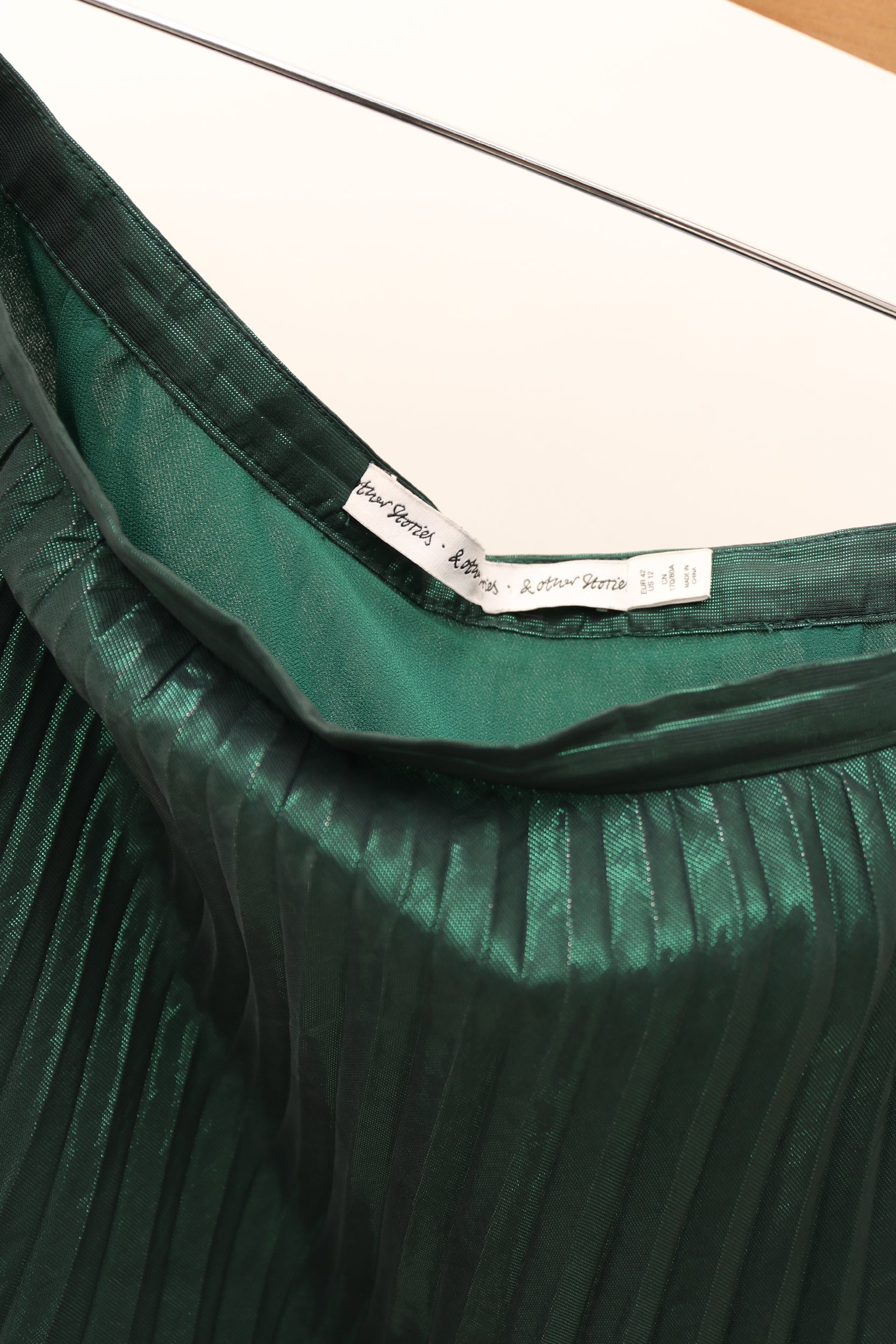 This Other Stories midi skirt in a festive emerald green is fabricated in semi-sheer shimmer sun-ray pleats, featuring zipper at side seam. A timeless shape with a party twist.