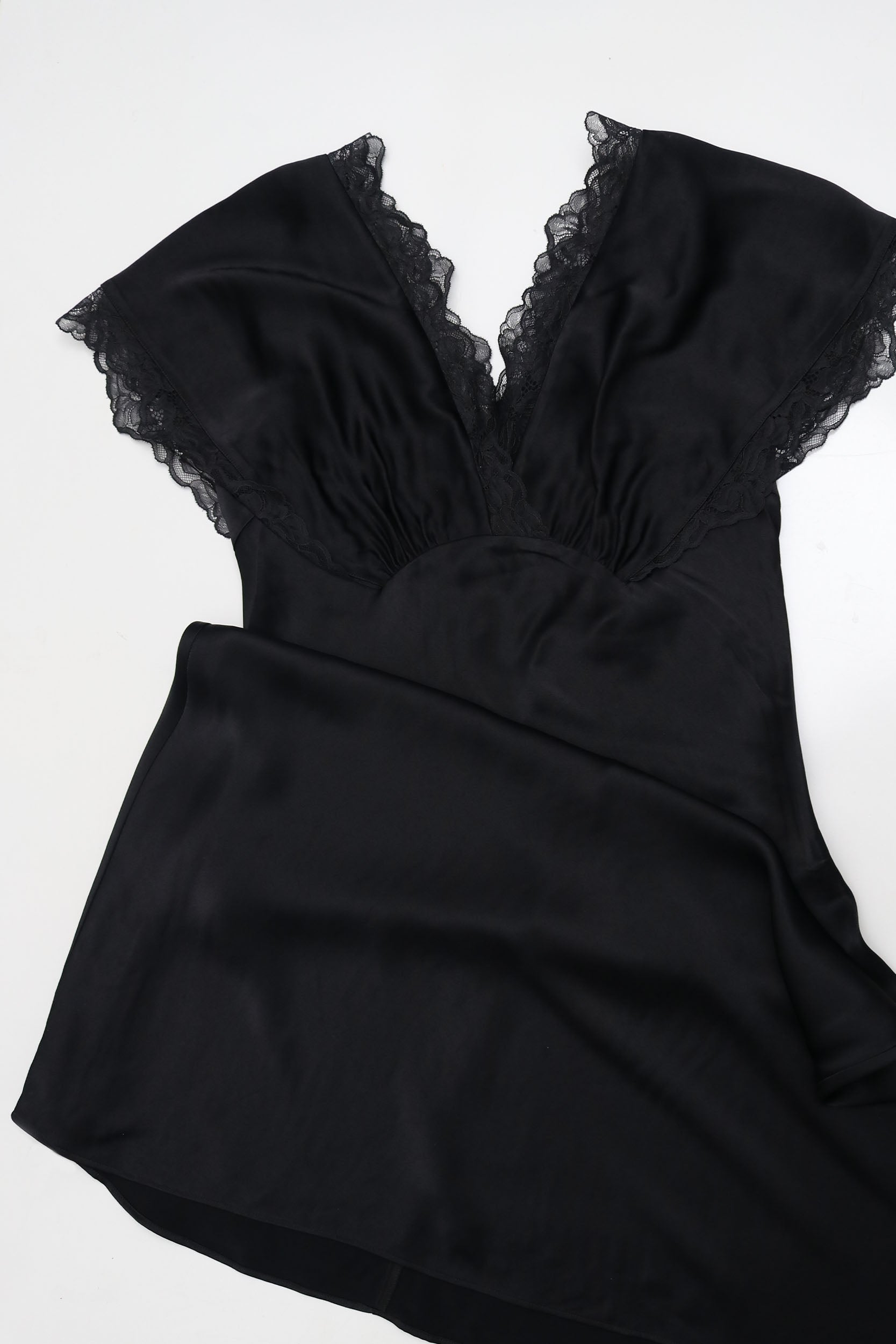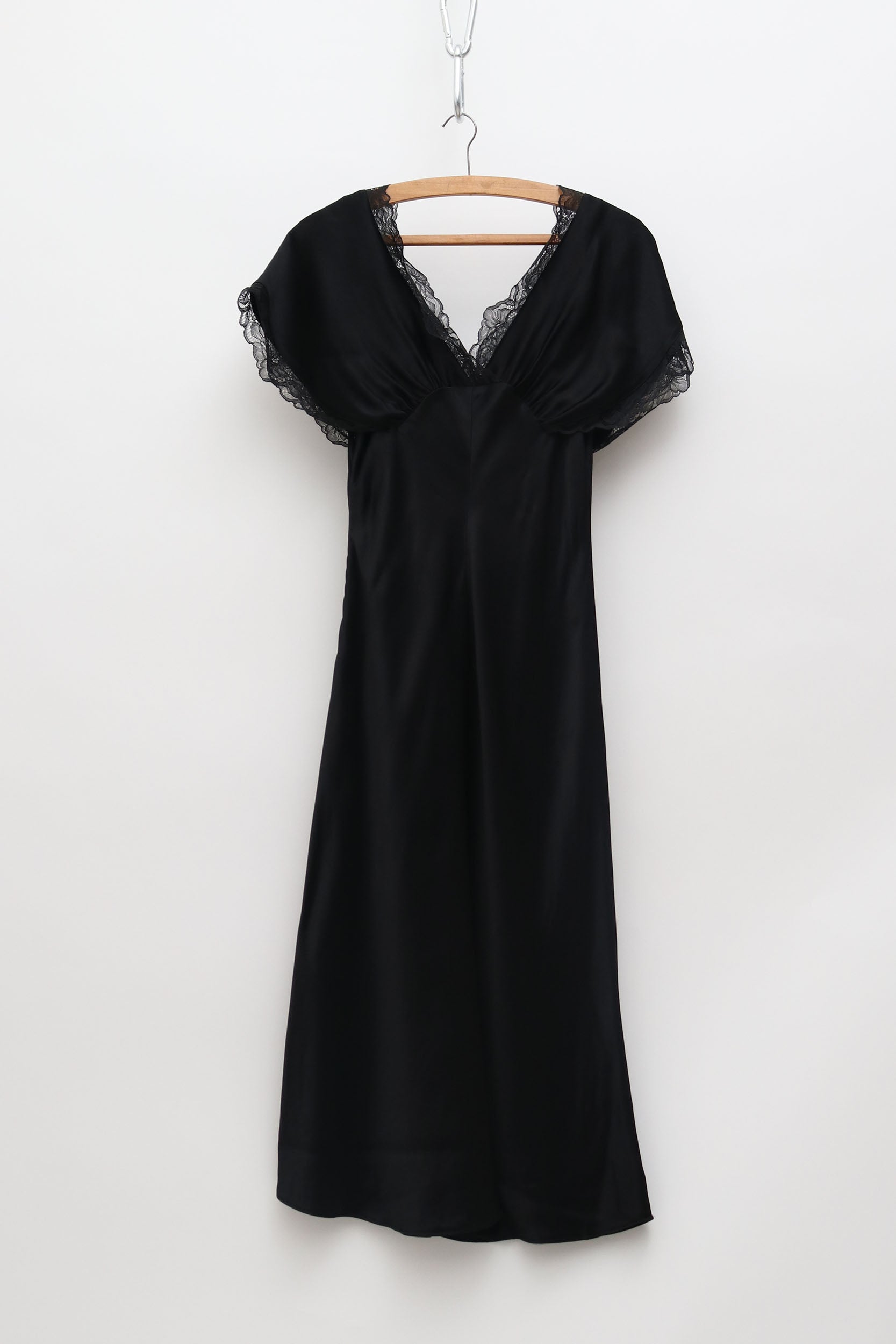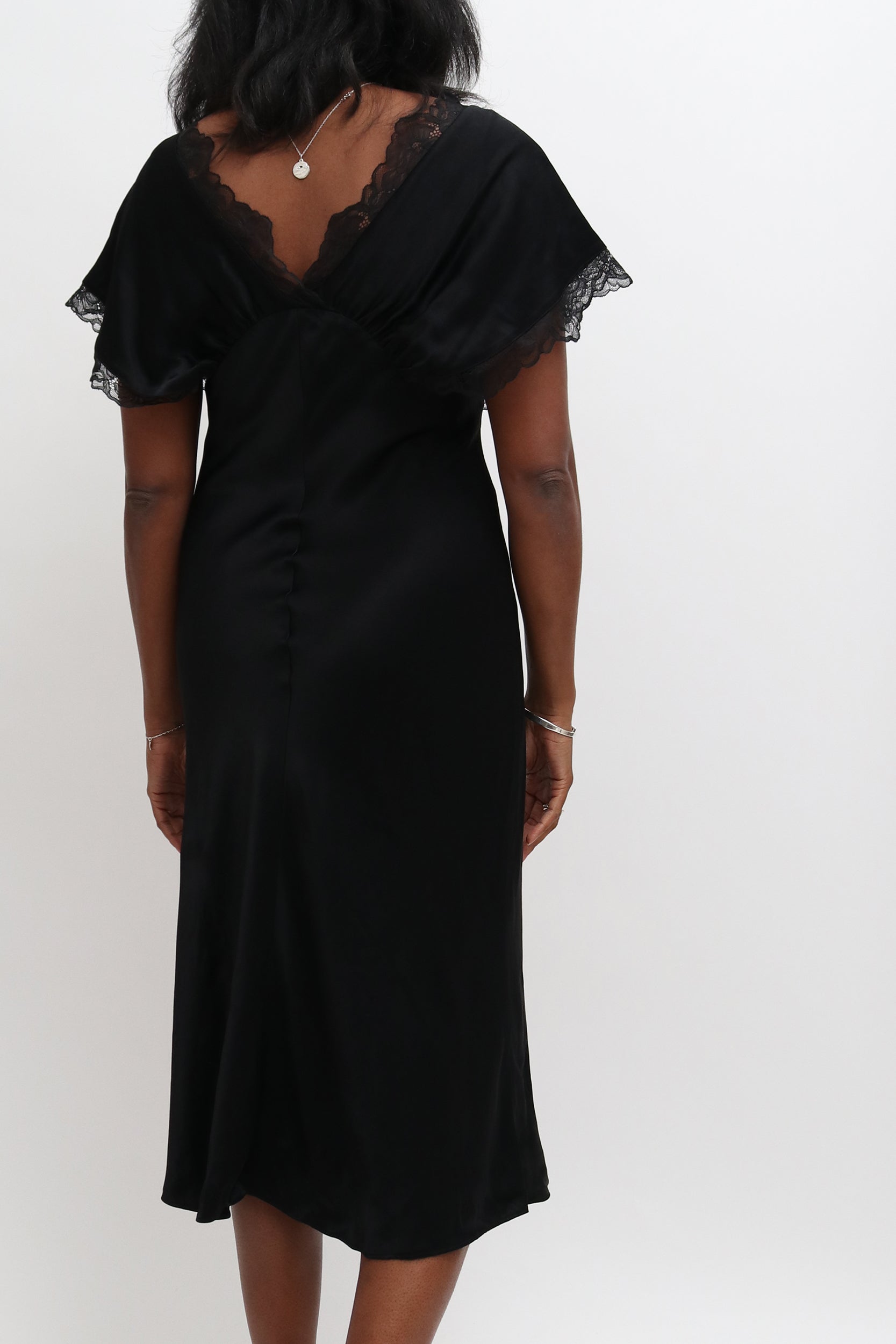 Black, bias cut midi length slip dress with beautiful lace trimmed gathered top. The Sleeves can gather onto shoulder to show a bit more skin, or naturally drape over the shoulder like a cap sleeve.