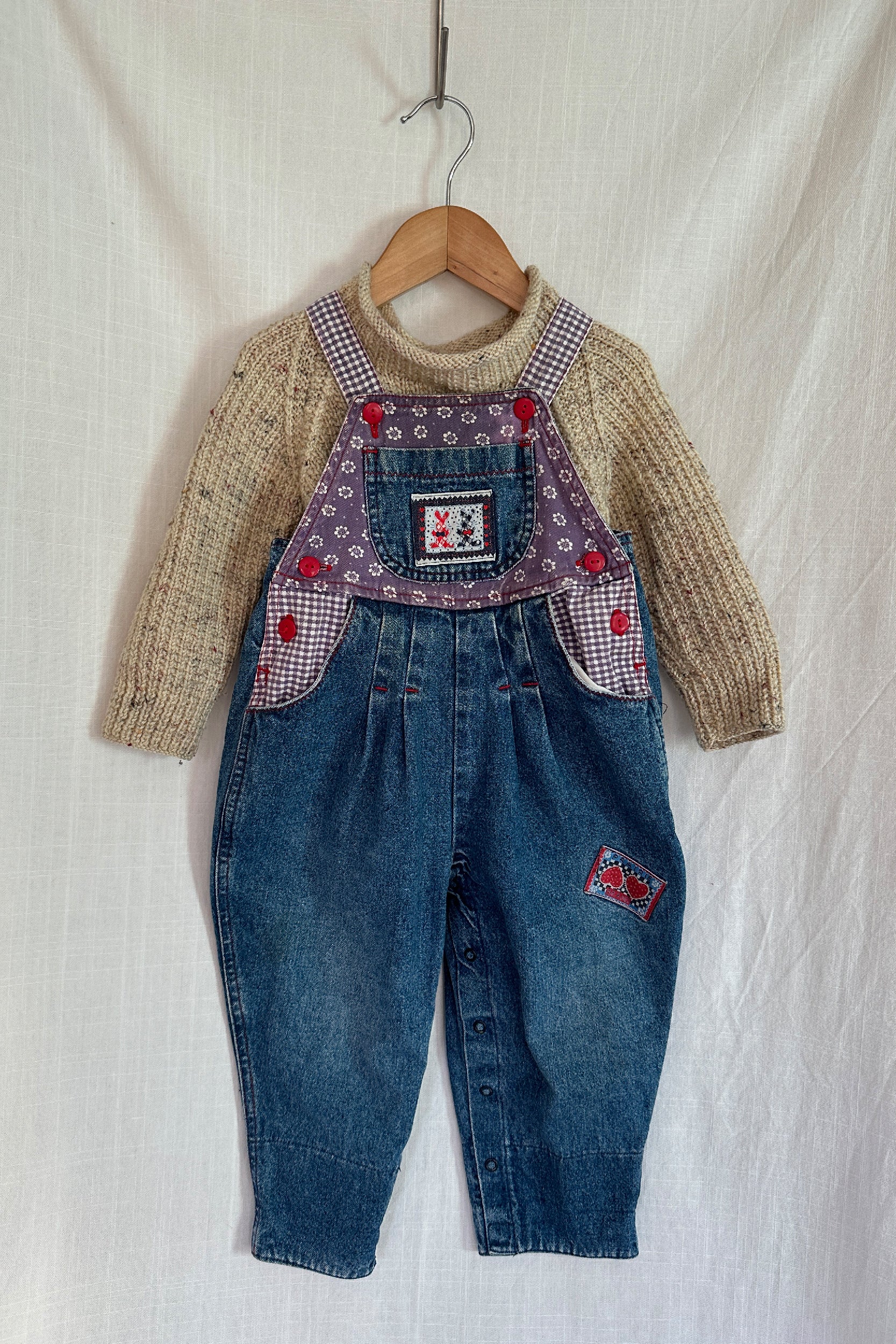 90s Vintage St. Micheal Dungarees in a cool indigo wash. Amazing bubble-leg silhouette accentuated by pleat detail on waist. We adore the retro patches, and contrast purple-tone floral and gingham details. The straps feature 3 adjustment points, and legs can be unrolled so the garment will fit for longer. Snap inseam for easy nappy-changes.