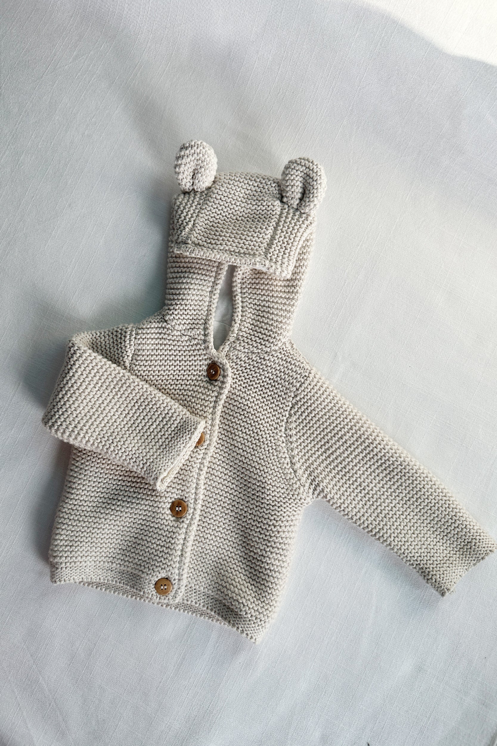 This fully-lined, cotton knitted hoodie features wooden buttons and bear earss on the hood. A super cosy style.
