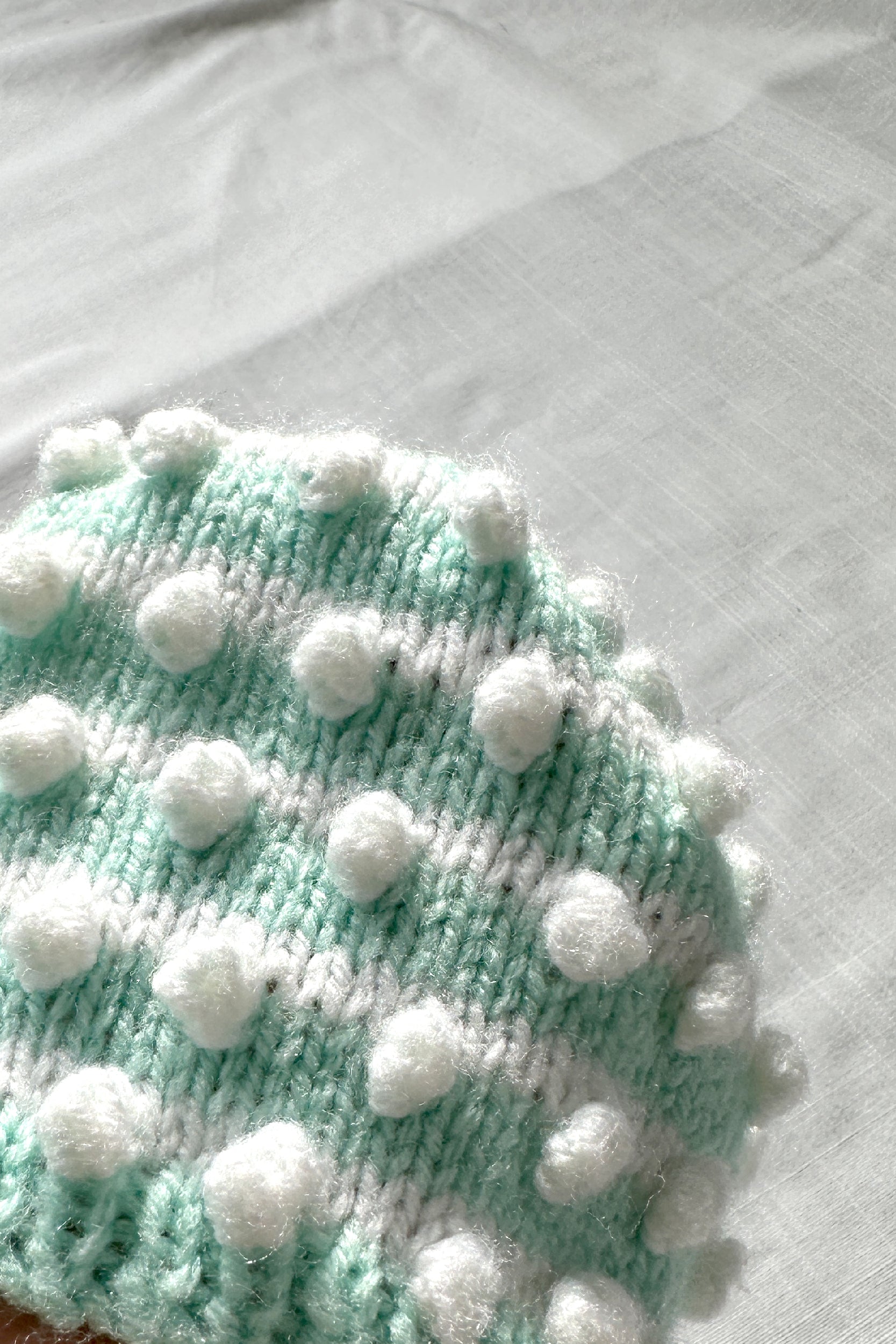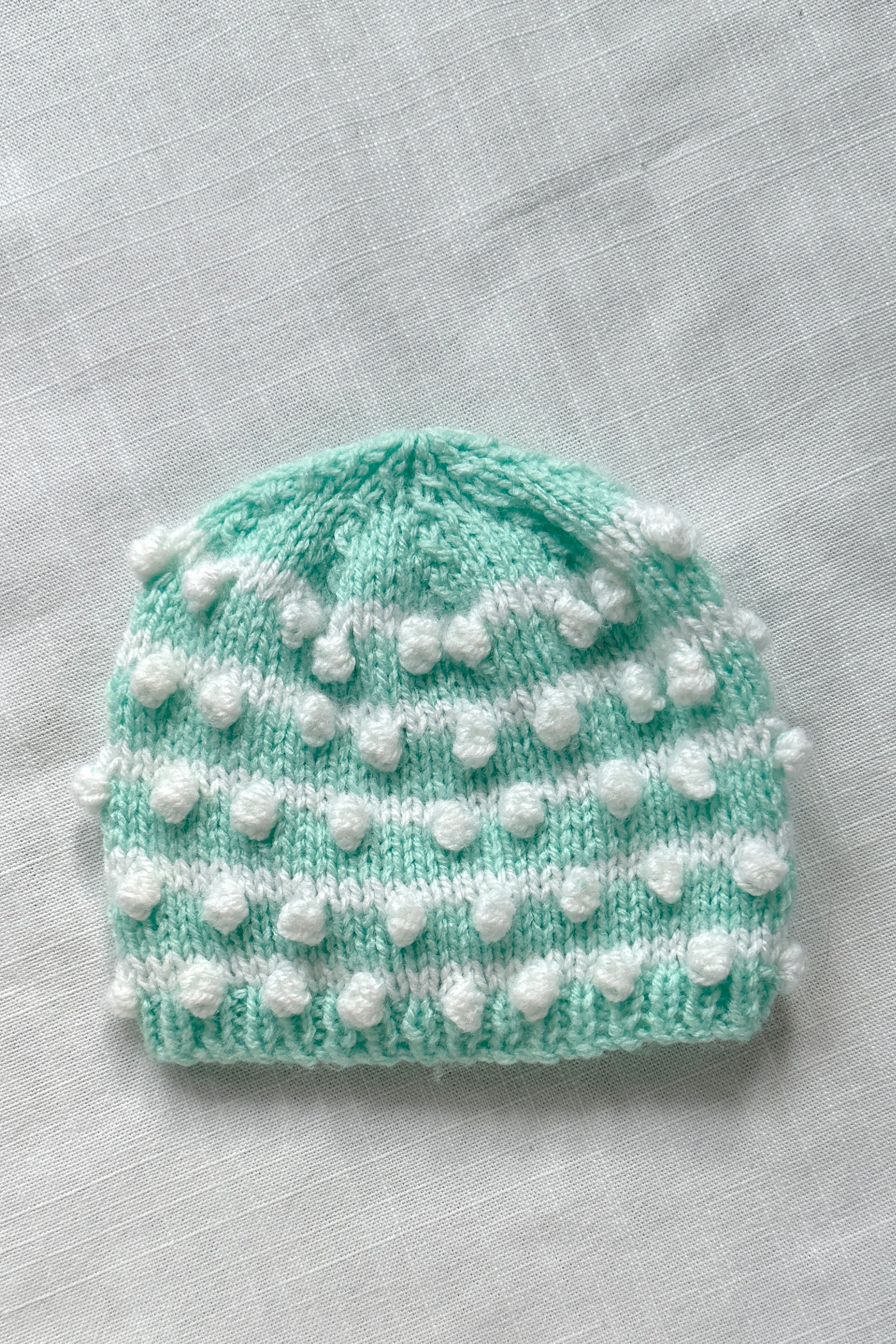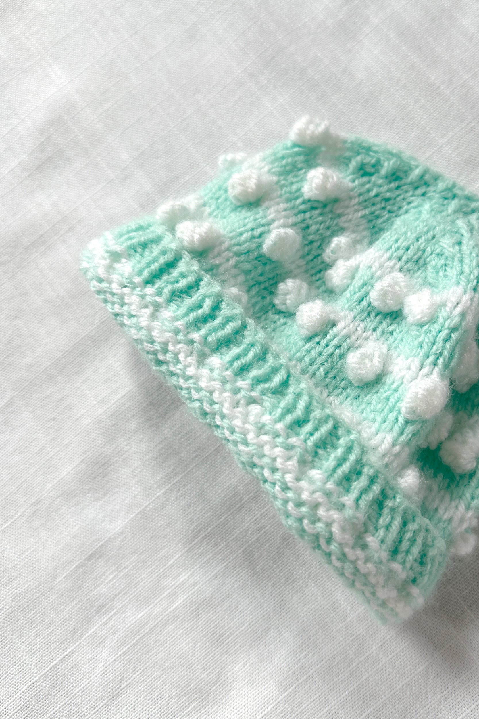 Beautiful hand-knitted mint green beanie with white bobble knit detailing. We love this rolled up to fit smaller heads, or unrolled as your little one grows.