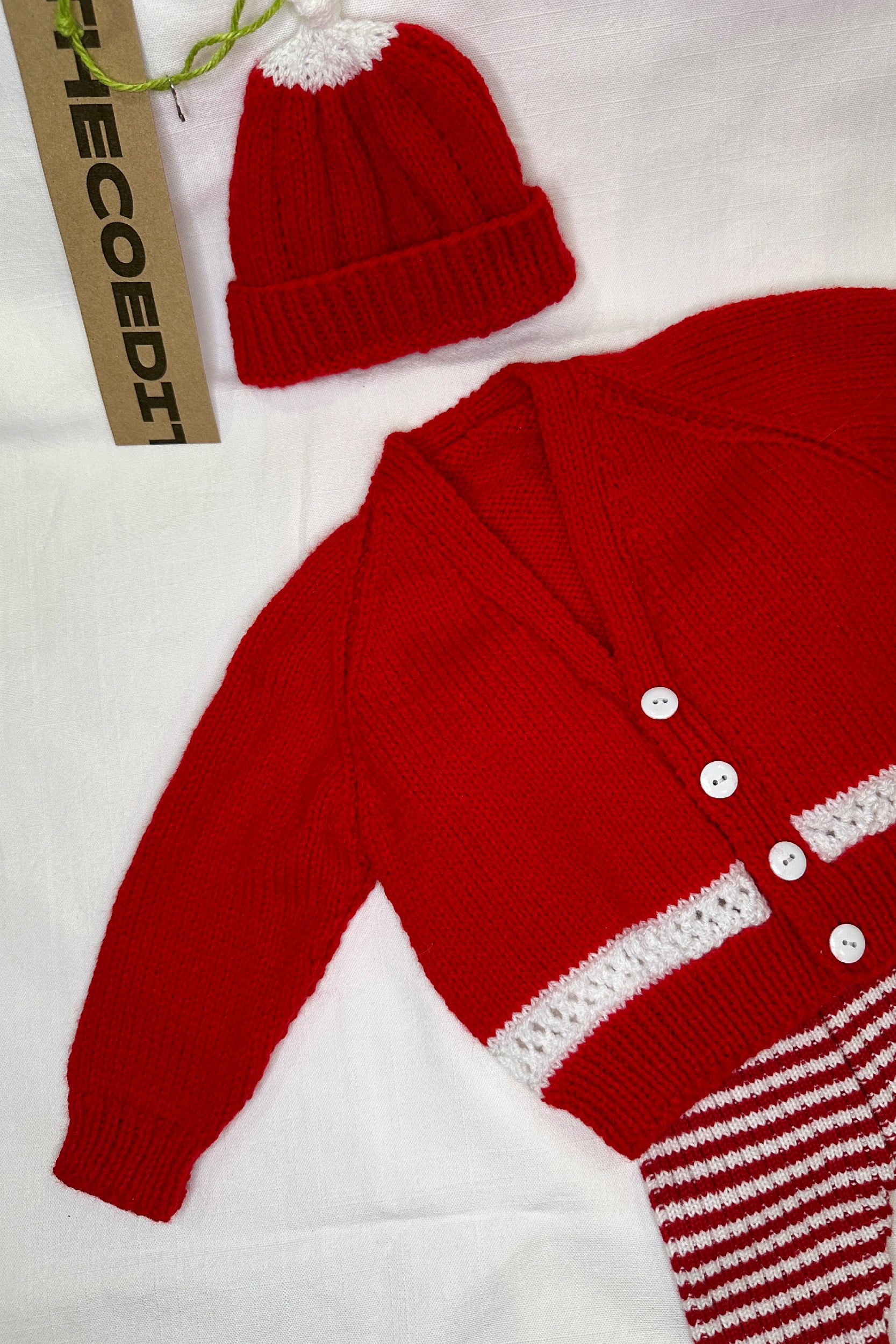 MINI: HAND-KNITTED RED AND WHITE CARDIGAN WITH BEANIE