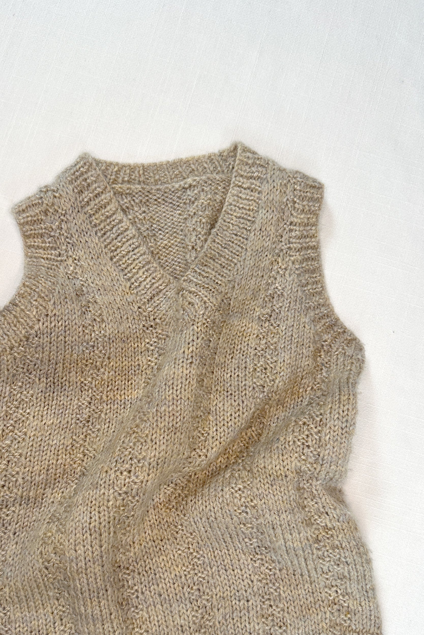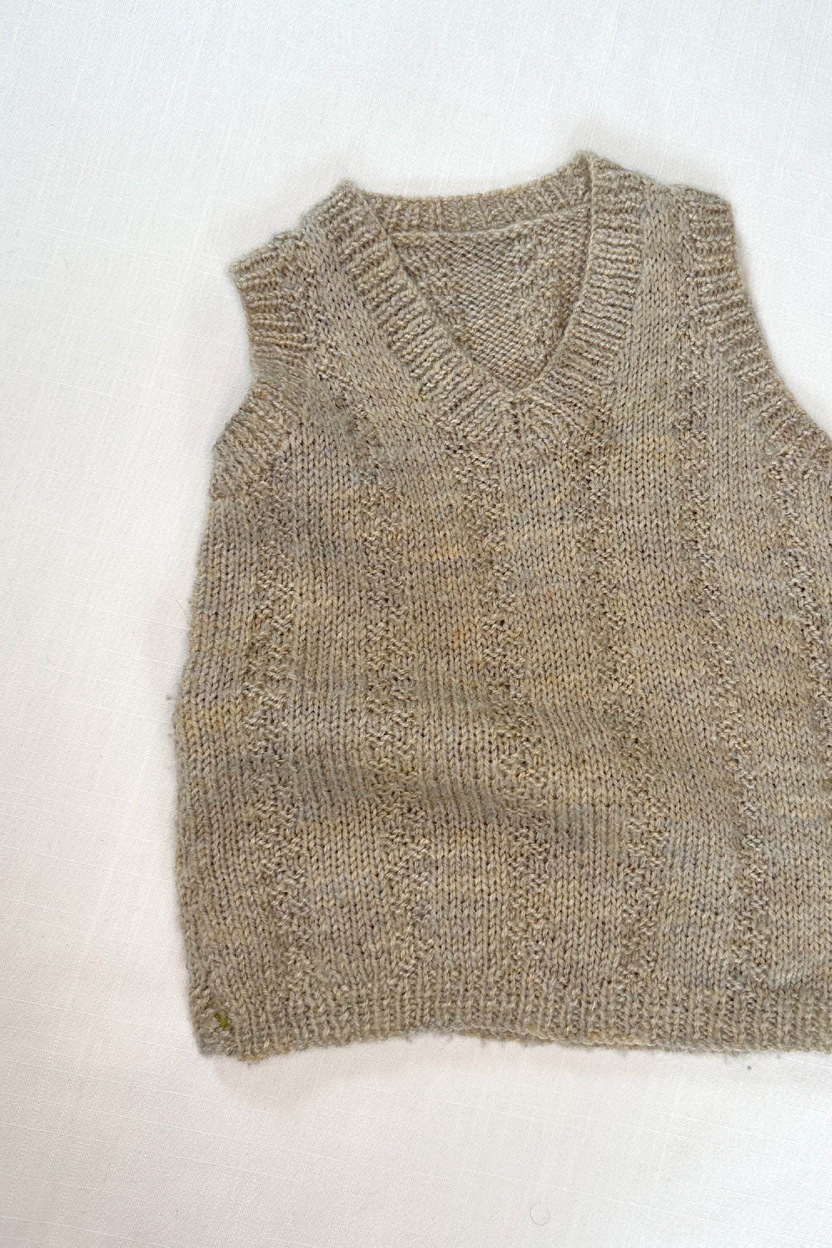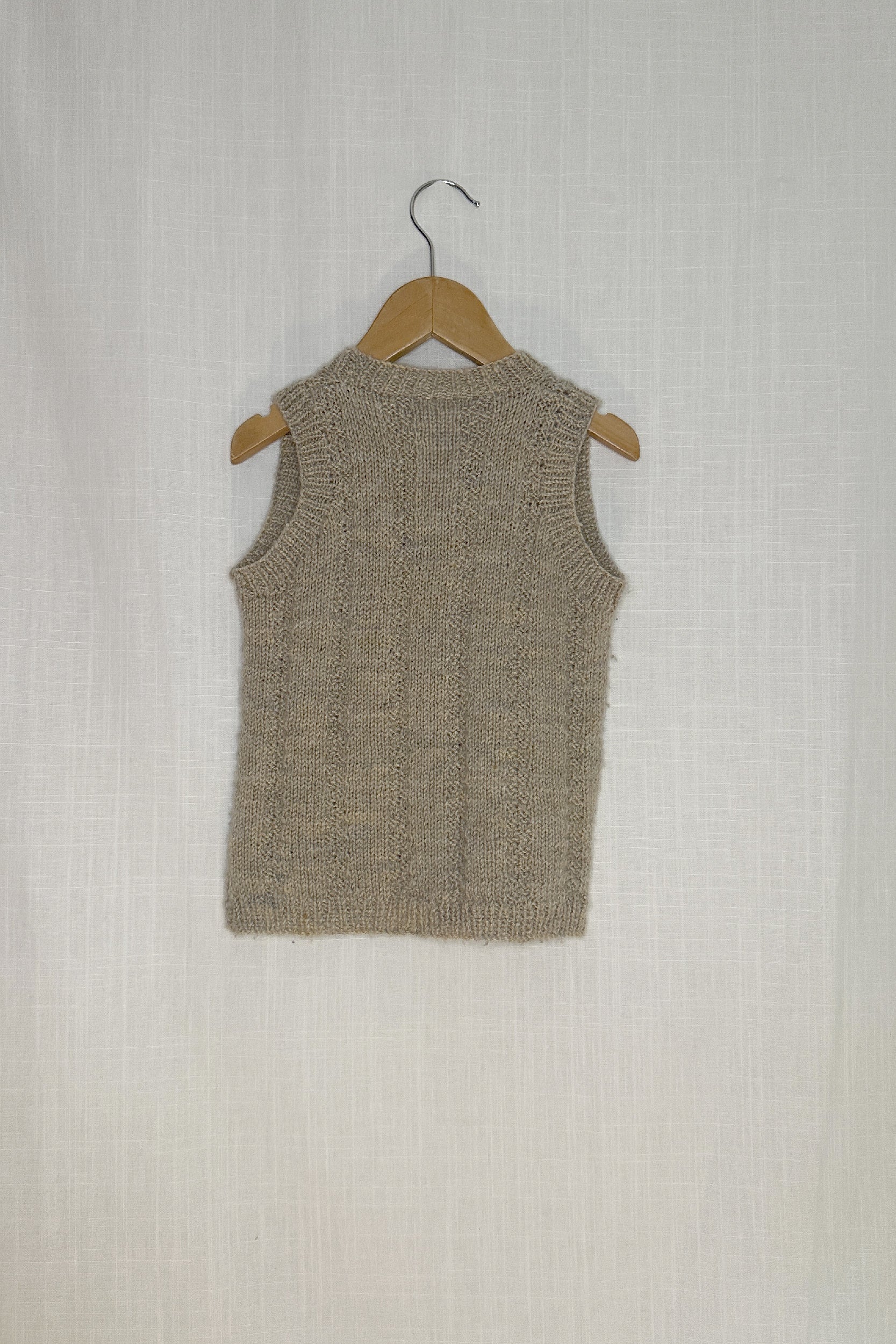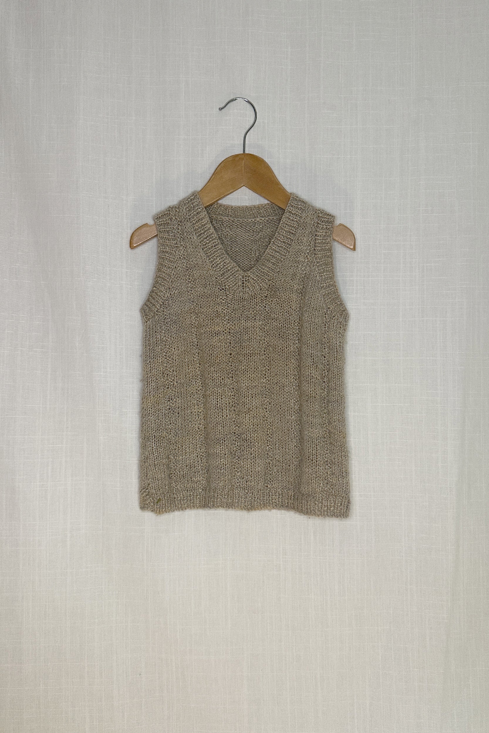 Marl-beige hand-knitted sweater vest. Ribbed-knit trim on V-neck, armhole and hem.