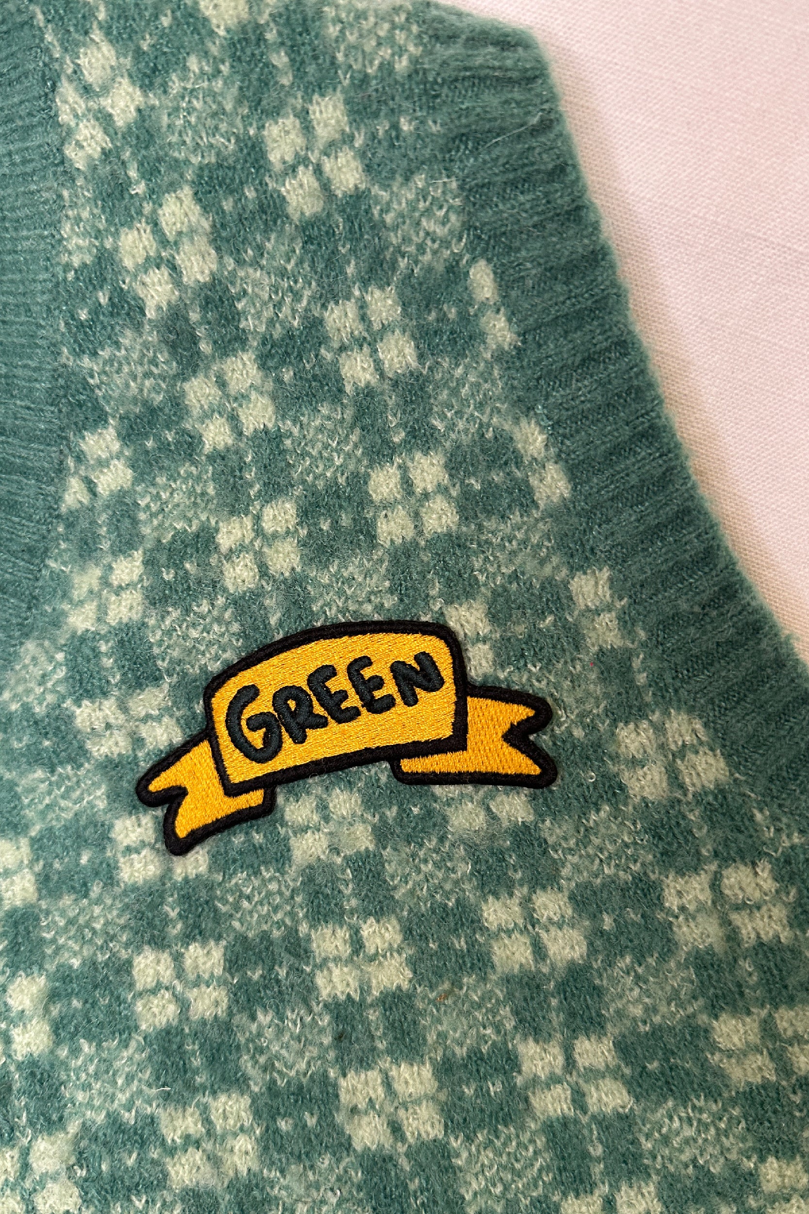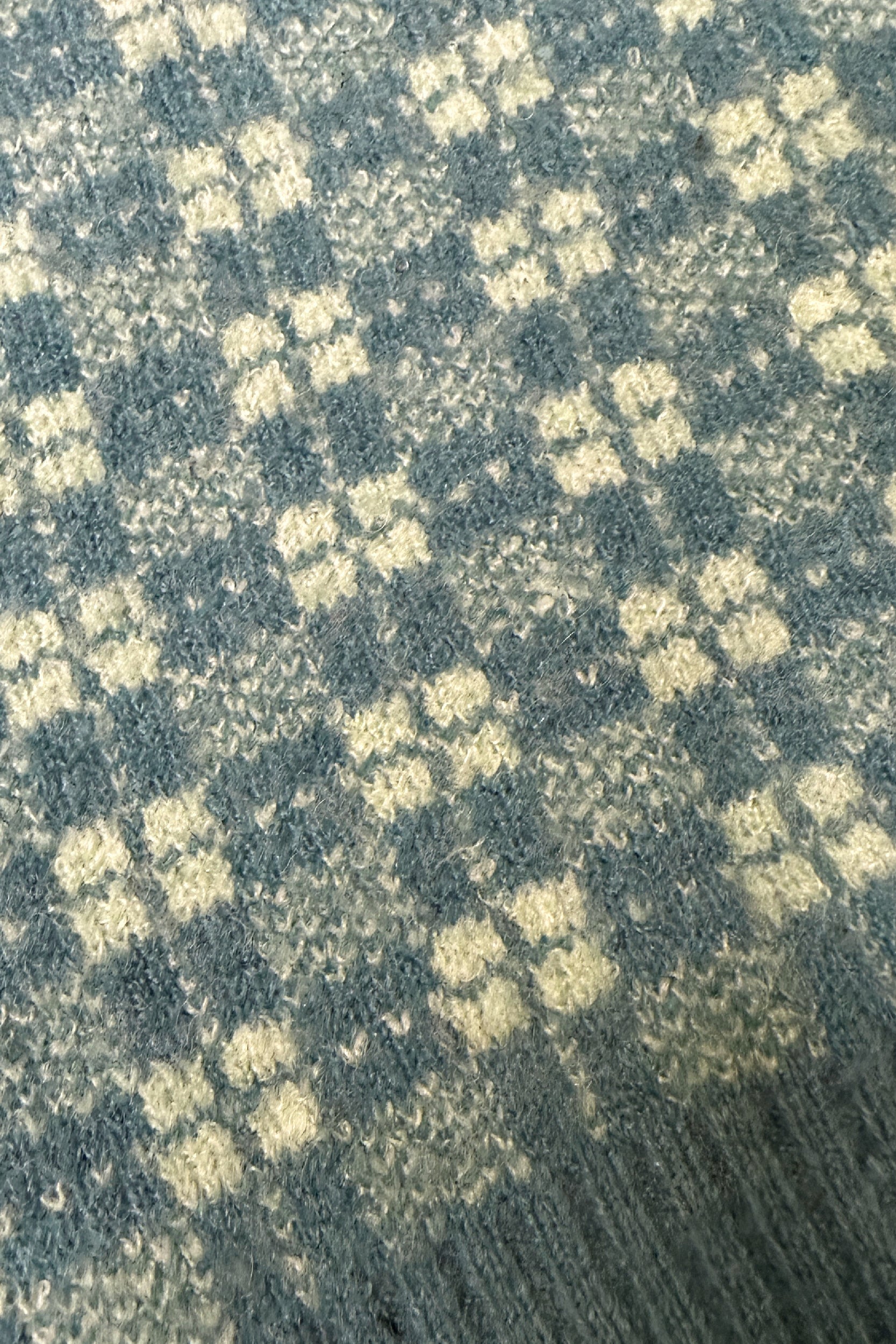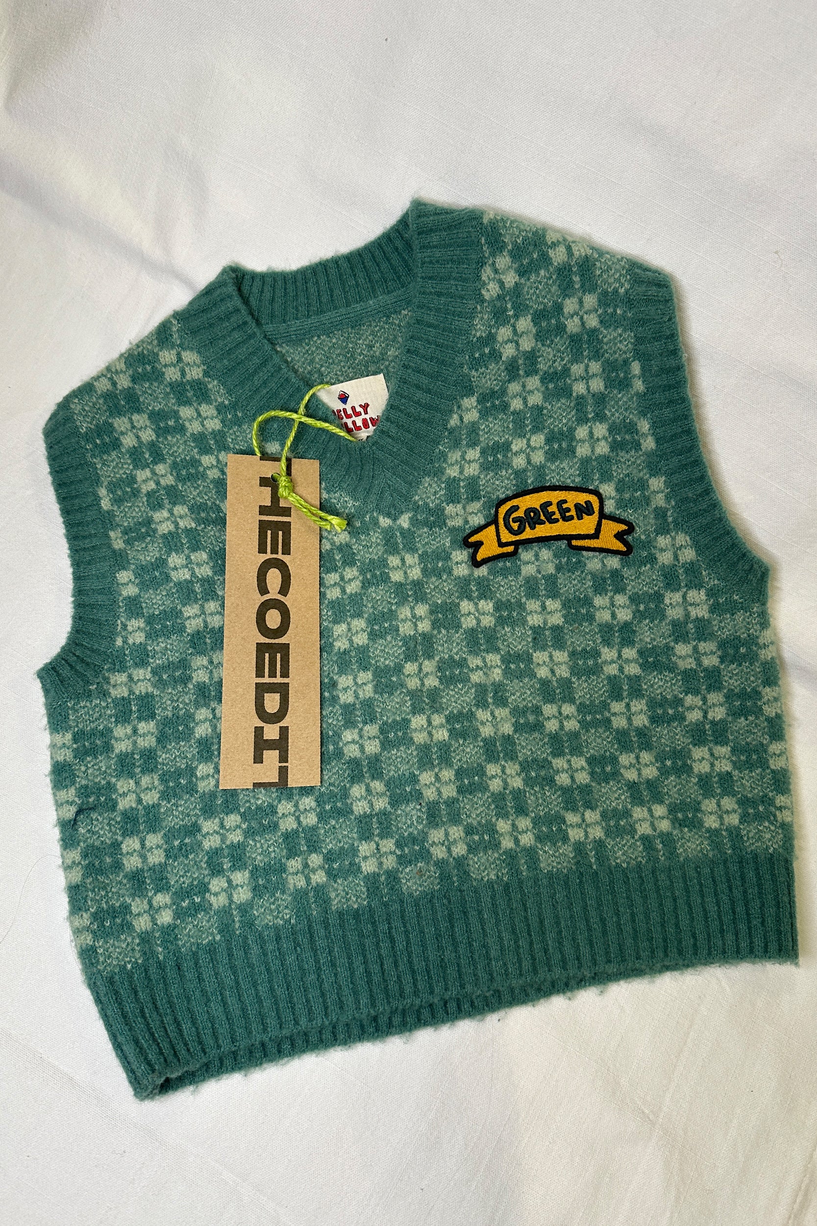 Sought-after, Jelly Mallow 'GREEN' Knit. Two-tone, jacquard check knitted sweater vest is a boxy, over-sized fit with v-neck and rib knit trim throughout.