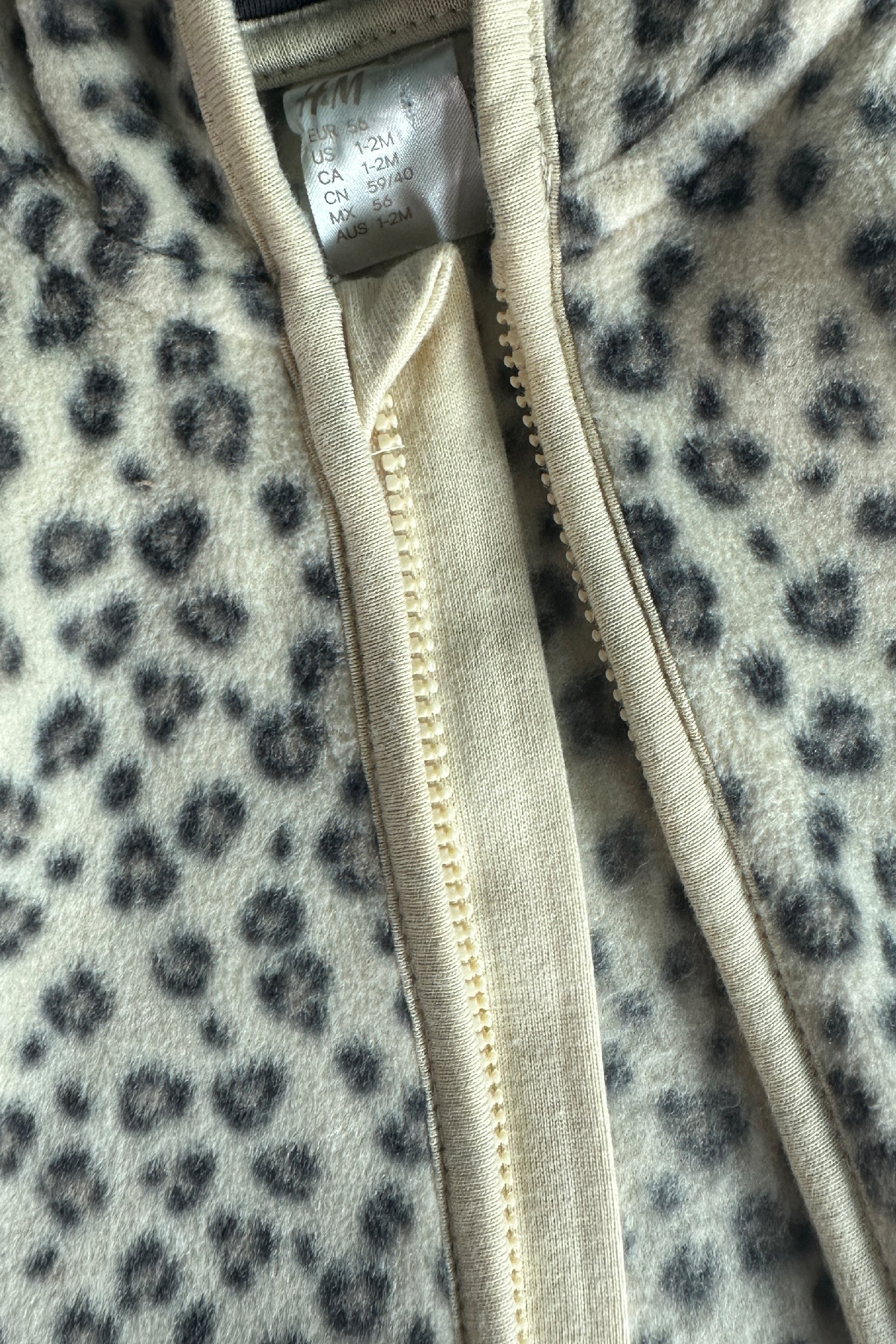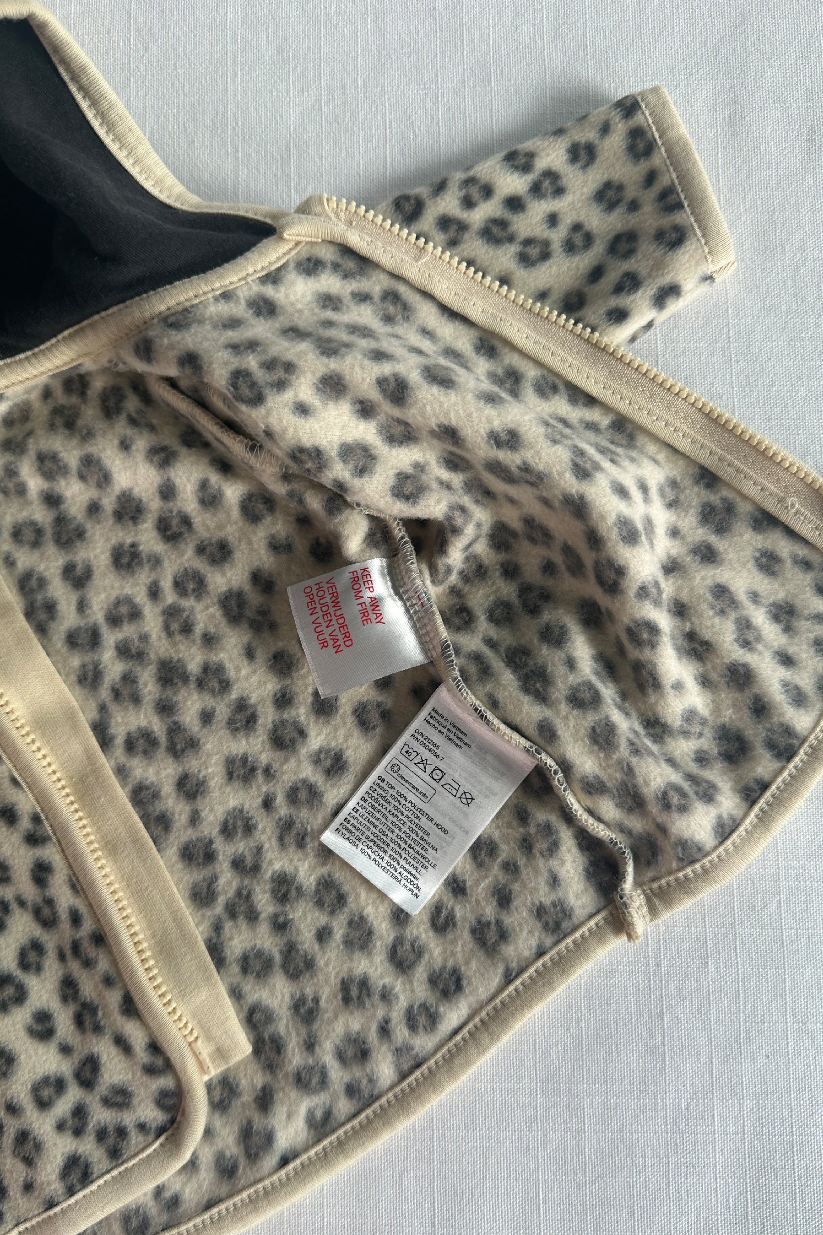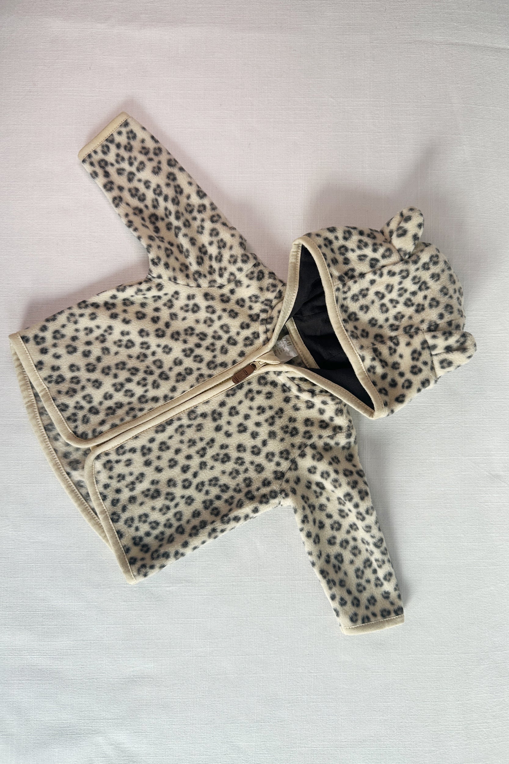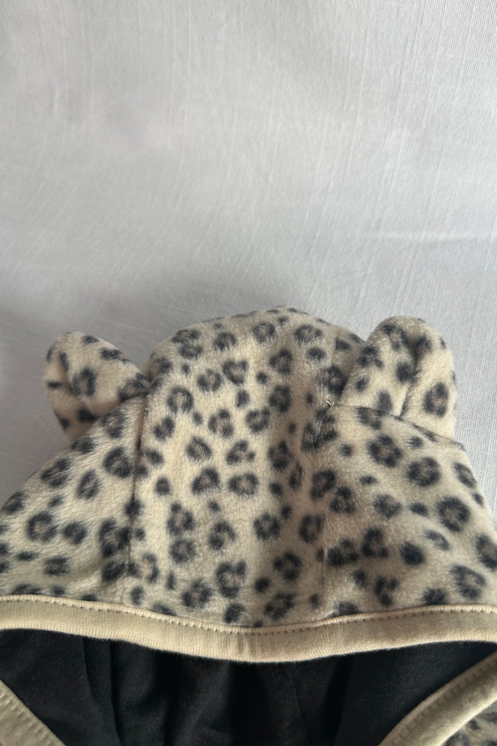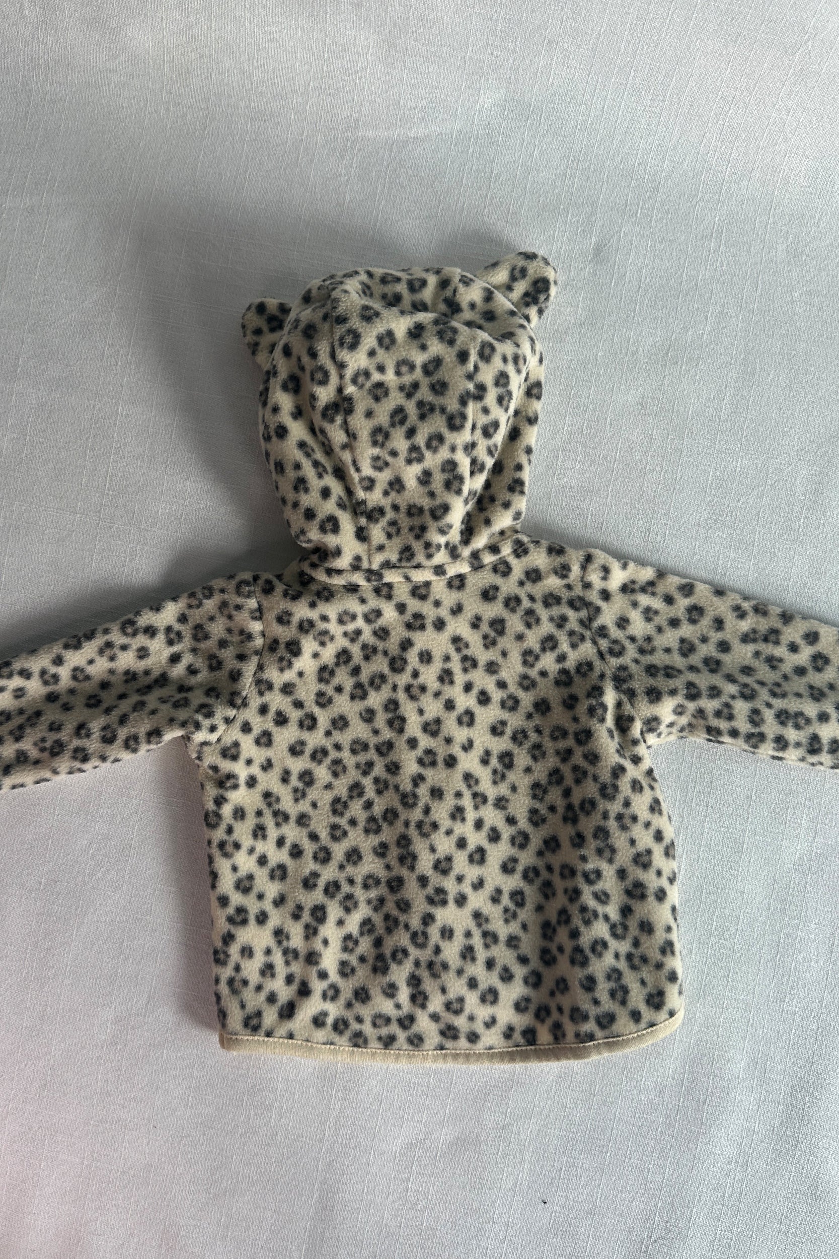 Leopard print hooded fleece jacket, featuring zip front, little bear ears on the hood and contrast jersey trim throughout.