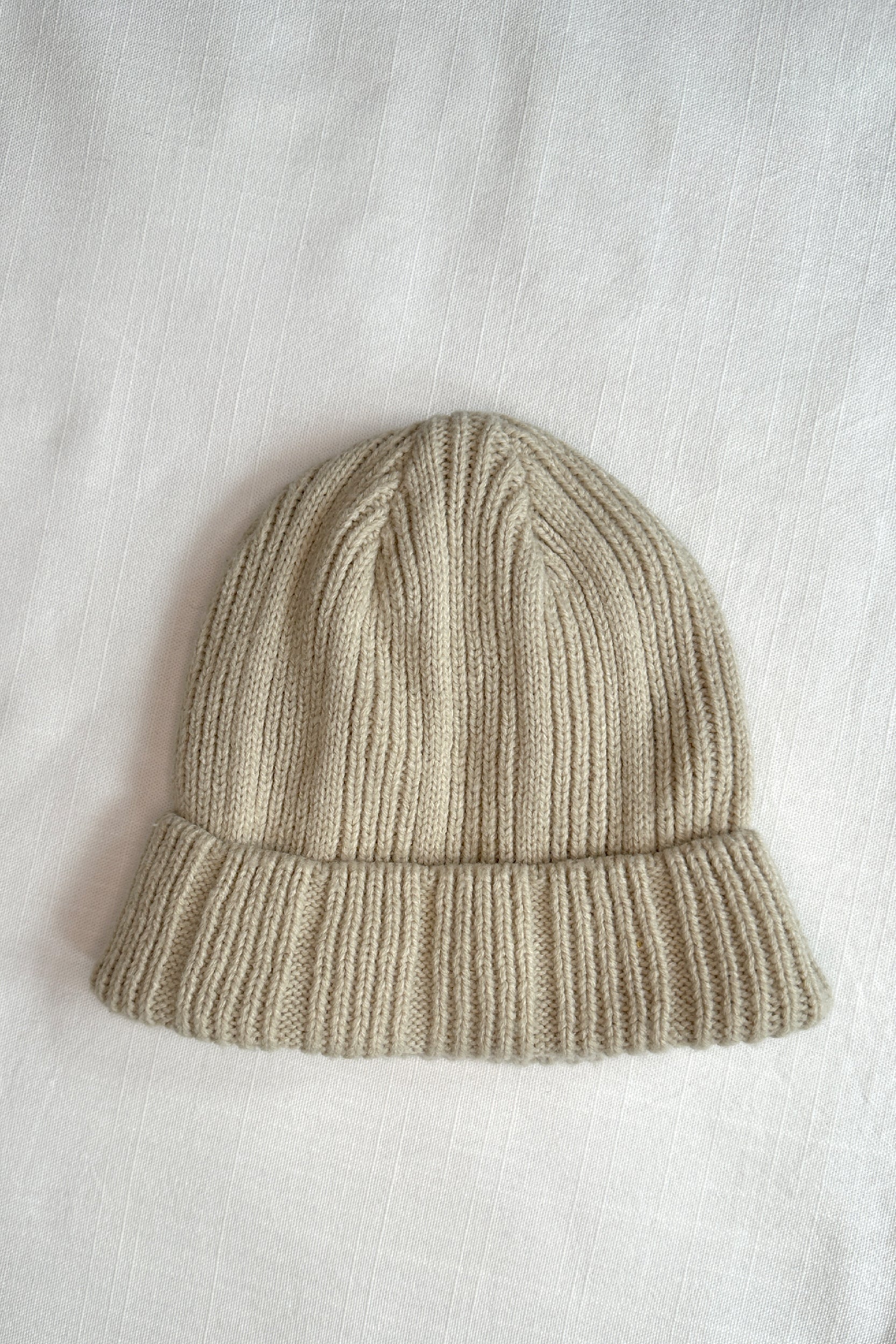 Neutral beige-tone ribbed beanie, with turned-up hem and fully lined.