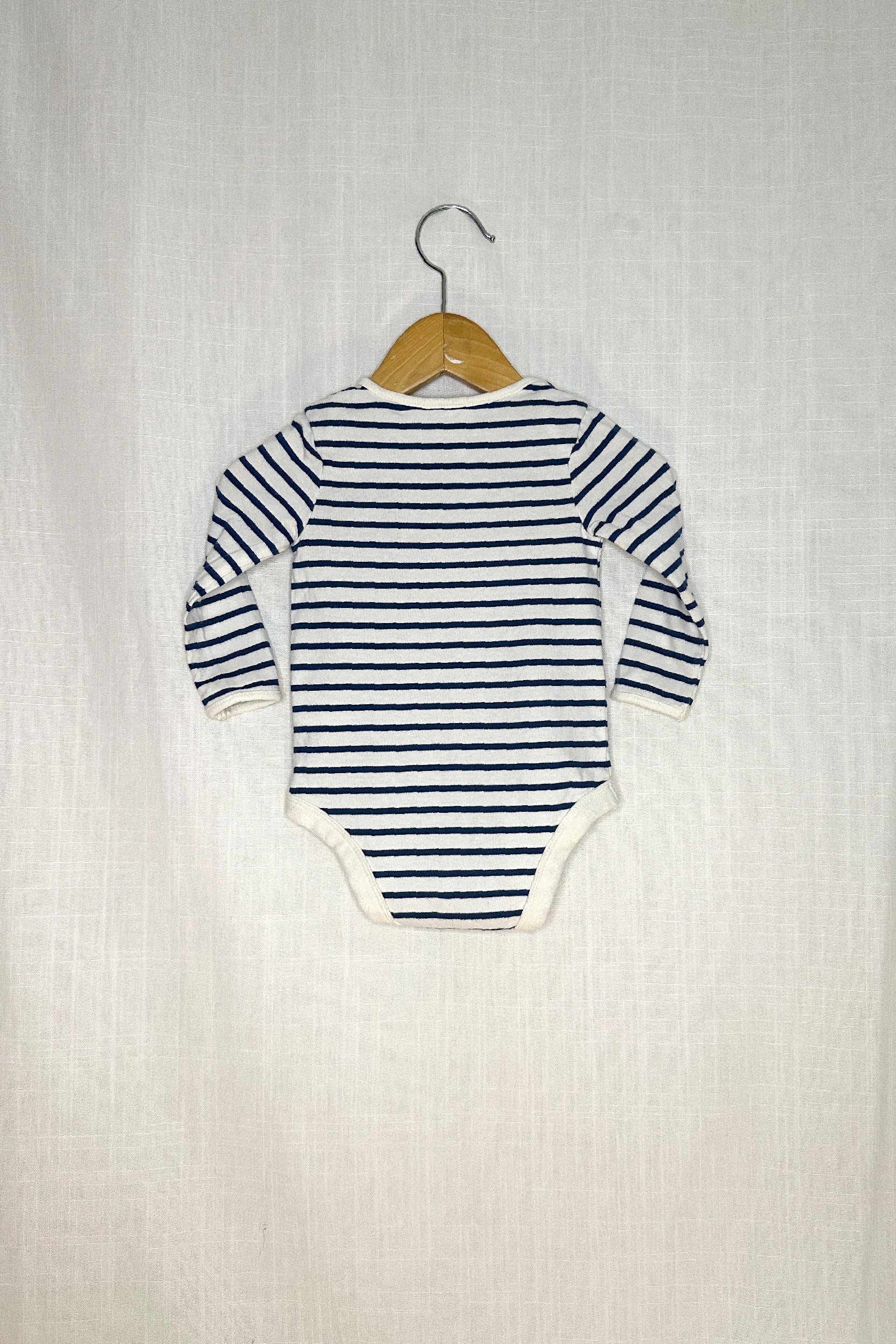 Fab everyday blue & white Breton-style baby-grow, with envelope neckline for easy-dressing.