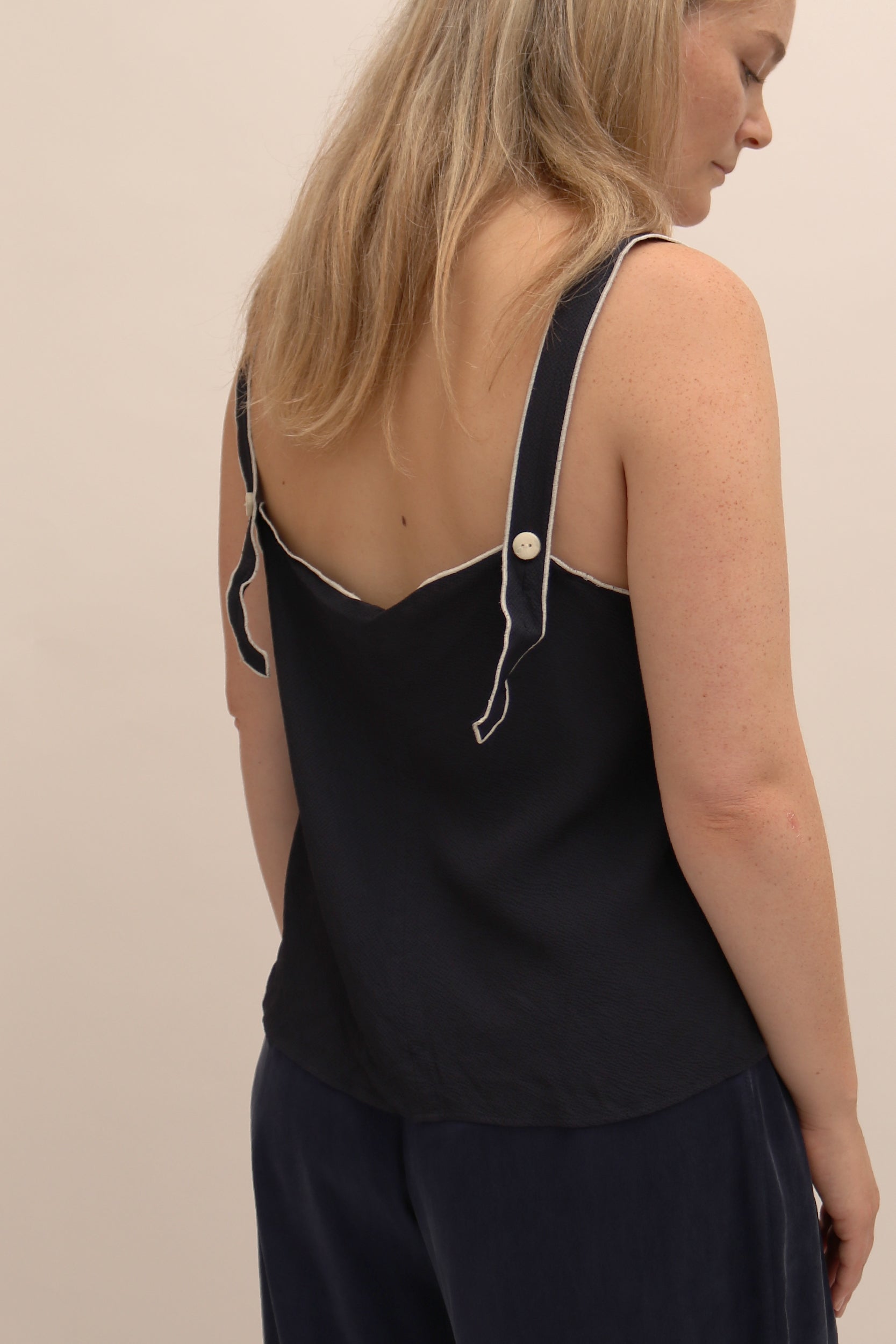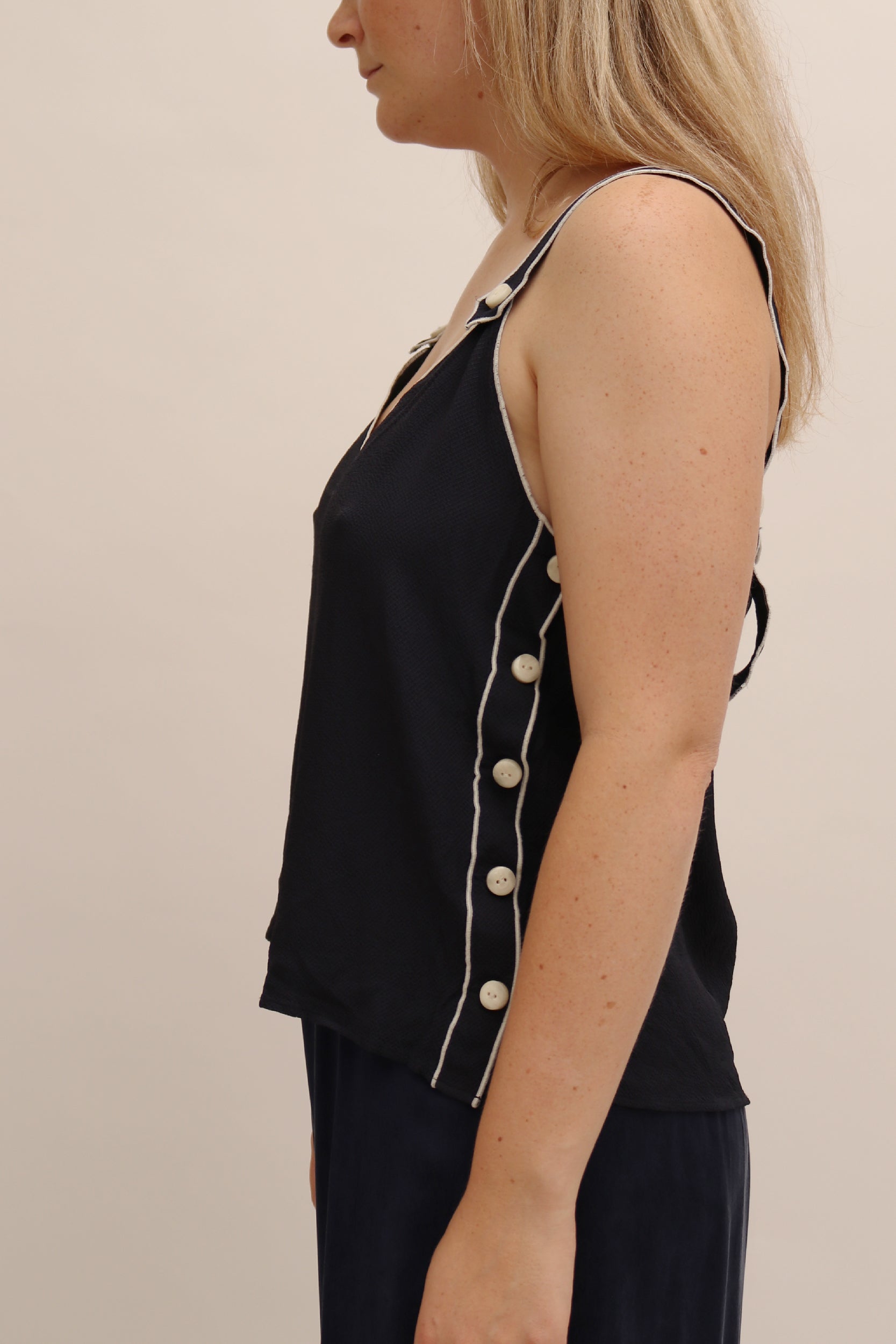 This navy tank, originally from Rag & Bone, is a truly versatile piece. Cut from a soft crepe material, it features striking details such as the button trim straps and contrast piping to create a unique piece that works styled for day or evening wear.