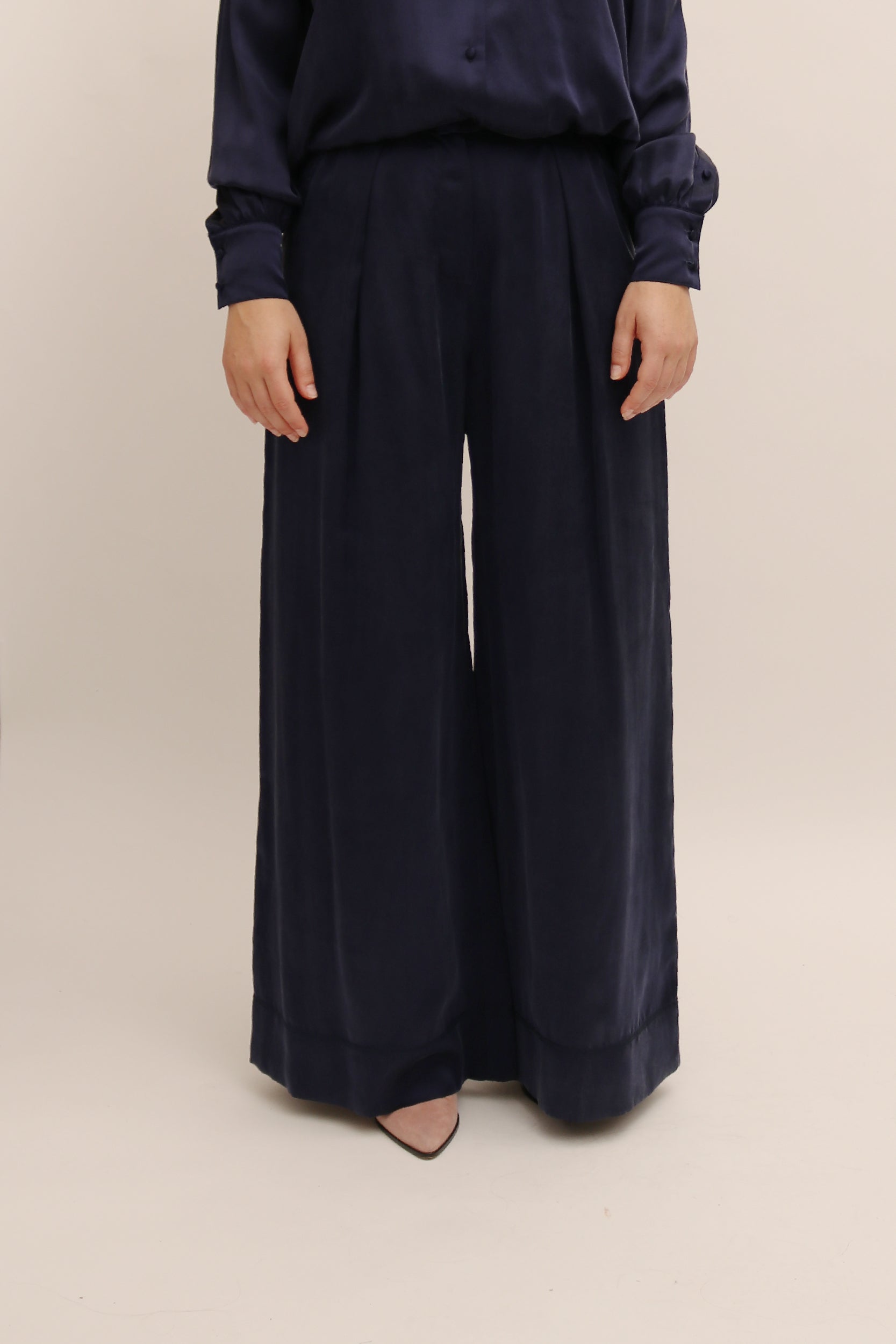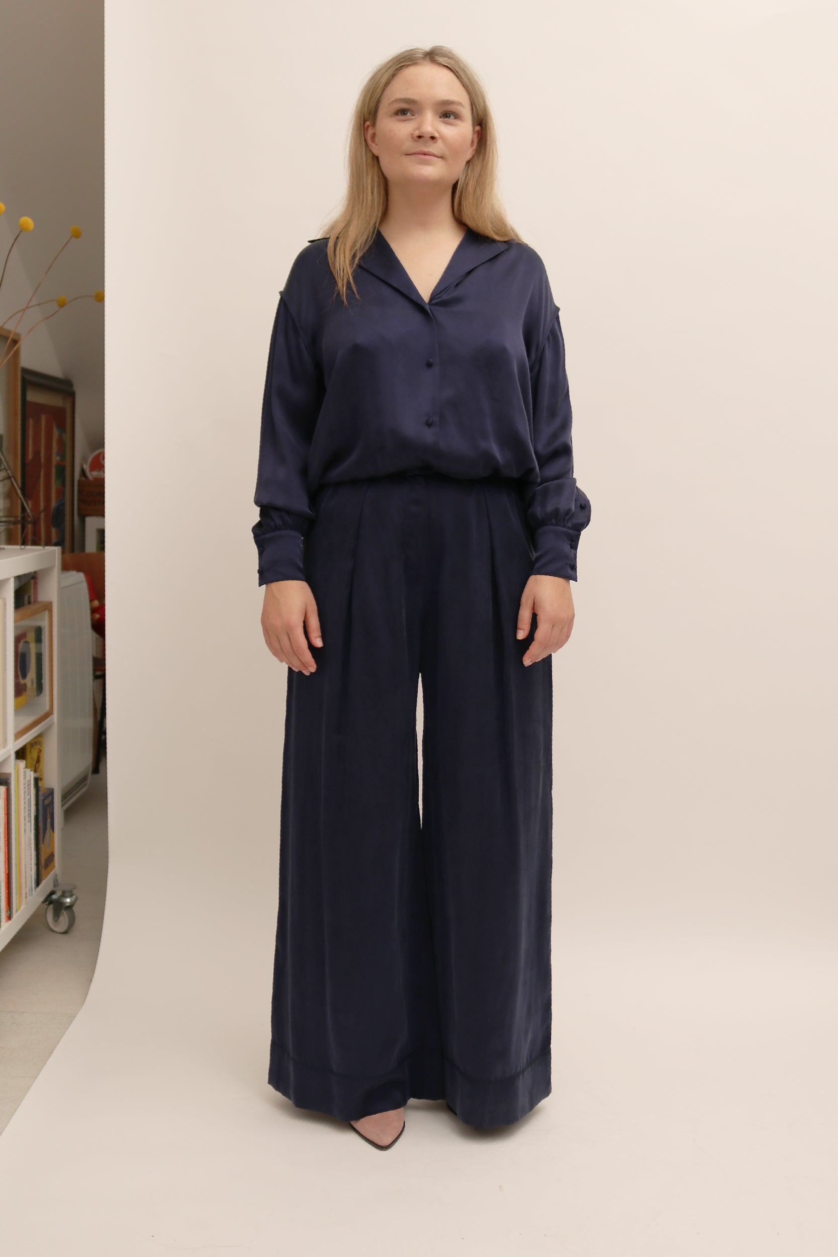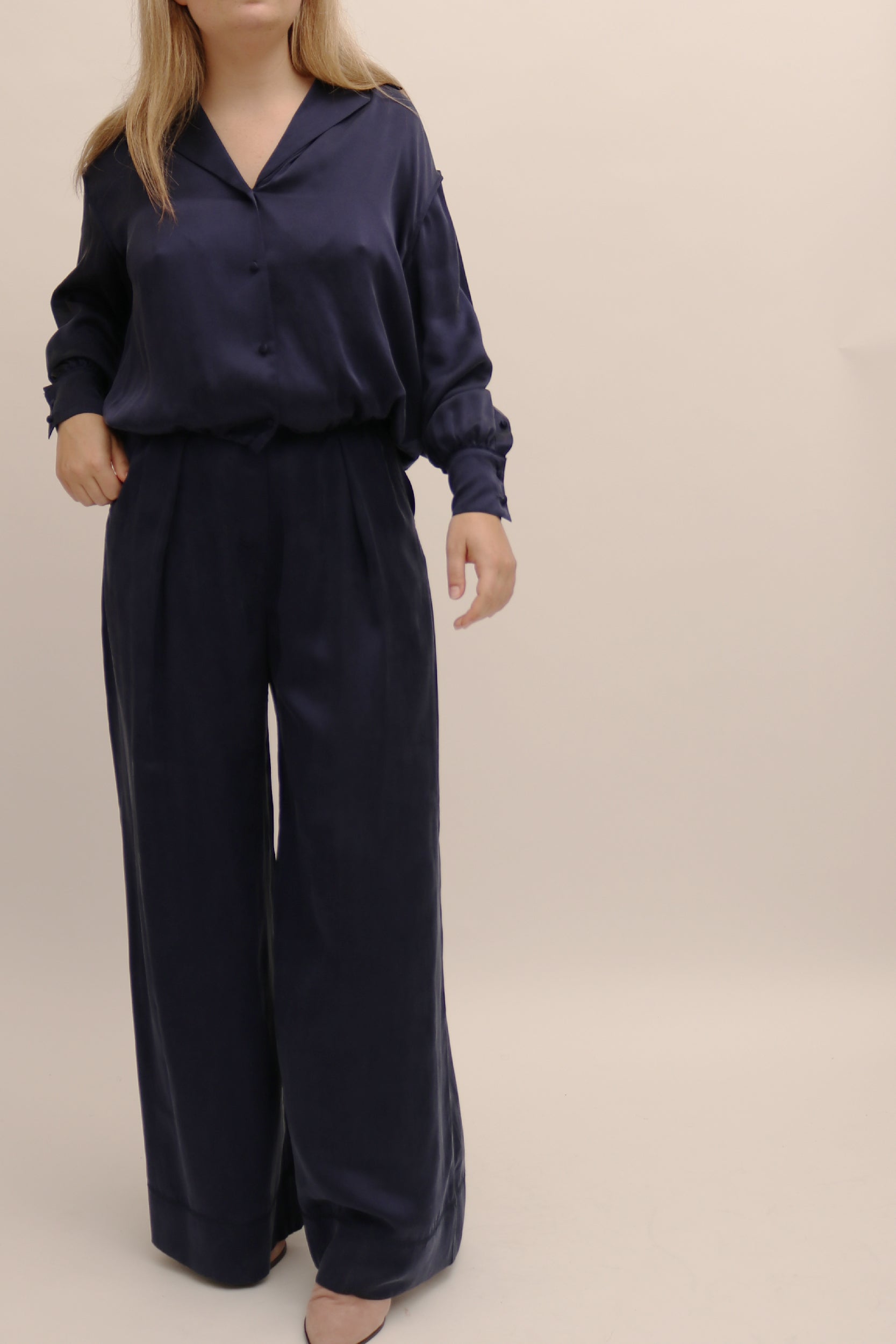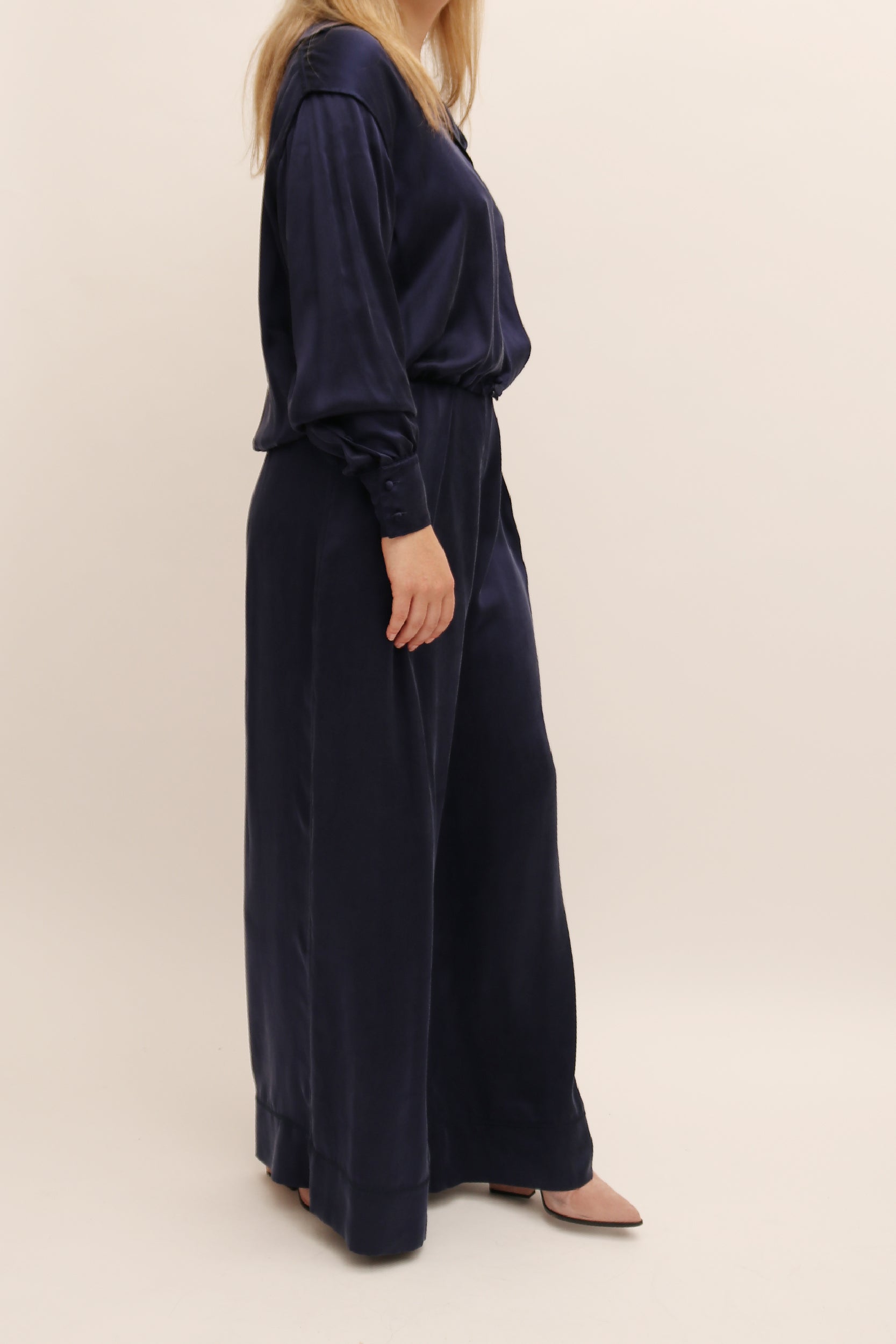 Steventai’s sandwash silk pyjama style co-ord can be worn together for an effortless look but are also equally as strong styled as separates. The trousers feature a high rise with structural pleats that add a fluidity to the wide leg shape and compliment the silk top that is slightly cropped and features a functional drawstring on either side for added versatility.