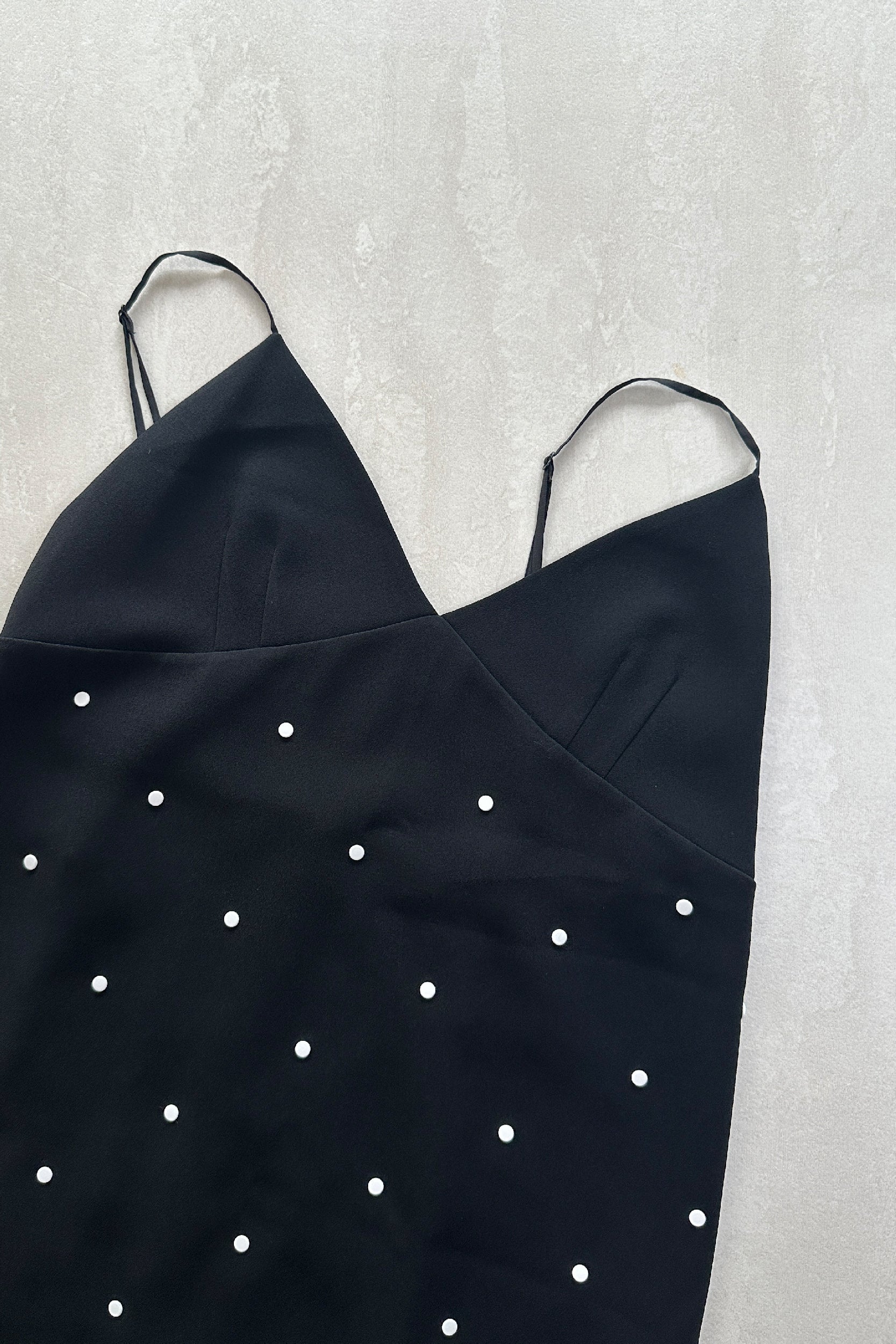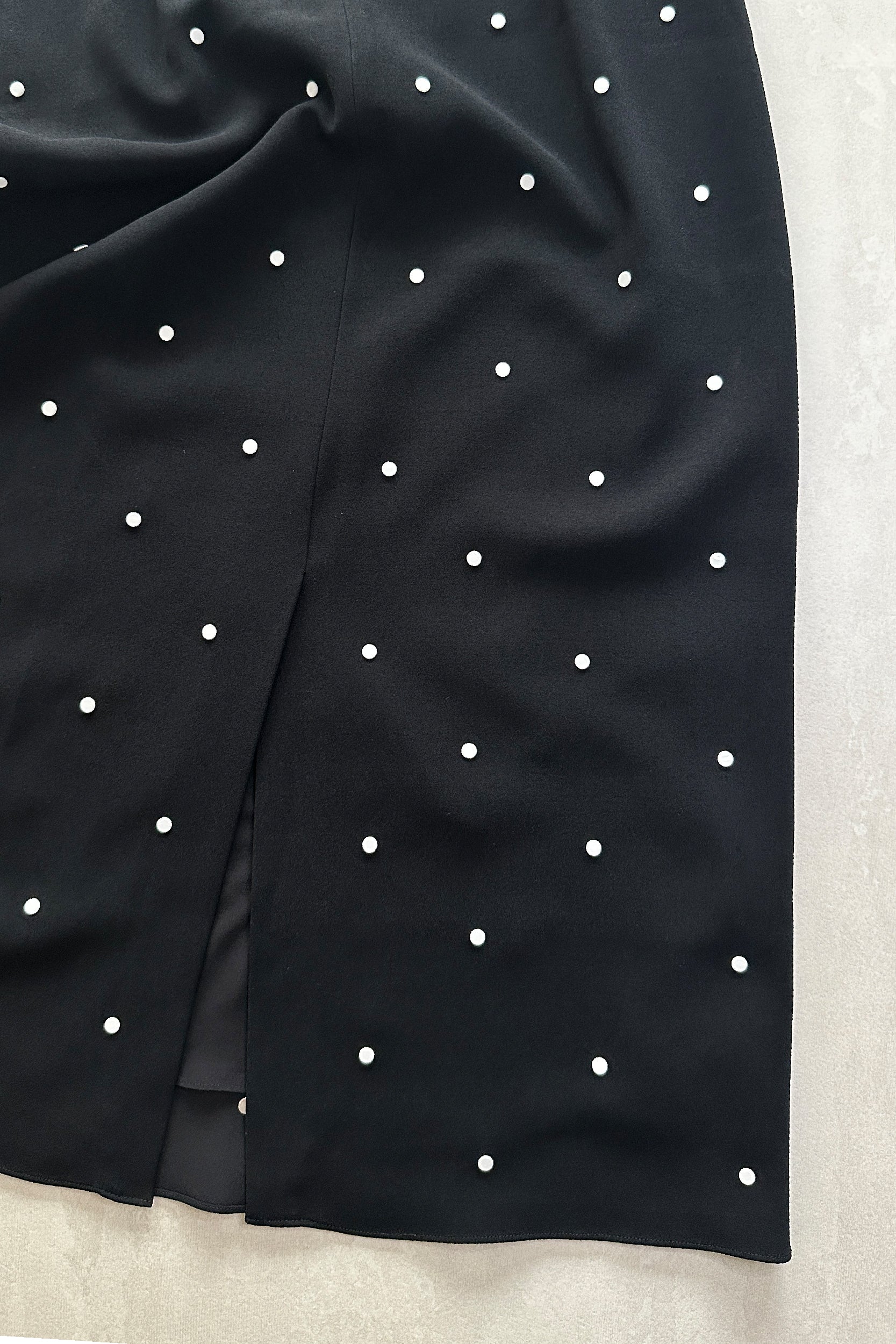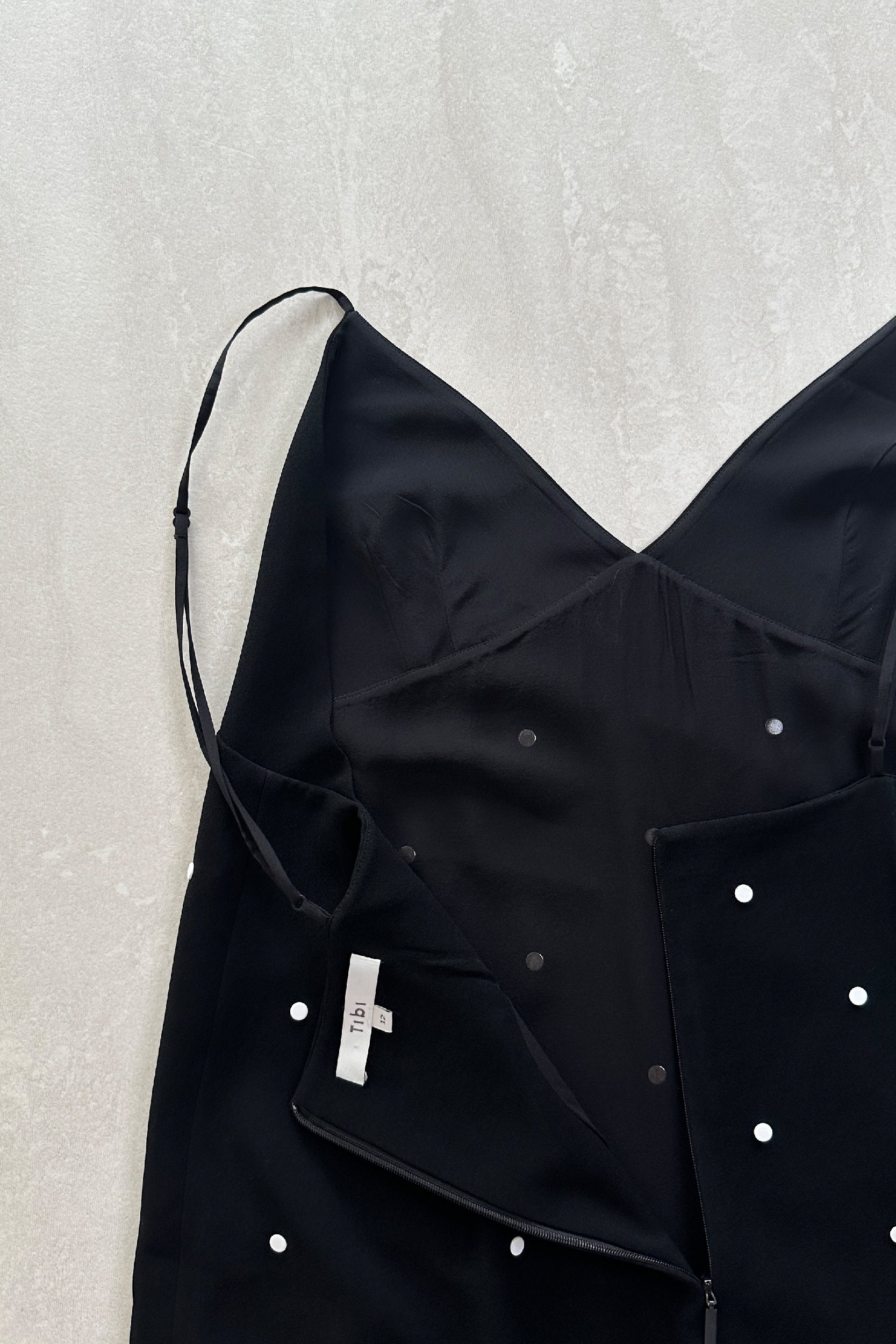 Pre-loved, midi length slip dress from ready-to-wear brand Tibi. The perfect day-to-night or laid-back occasion piece, this black slip is crafted in a mid-weight crepe with a slight stretch and is fully lined in silk. The dress features white flat studs throughout, creating a polka dot pattern, with a concealed zip fastening and back slit.