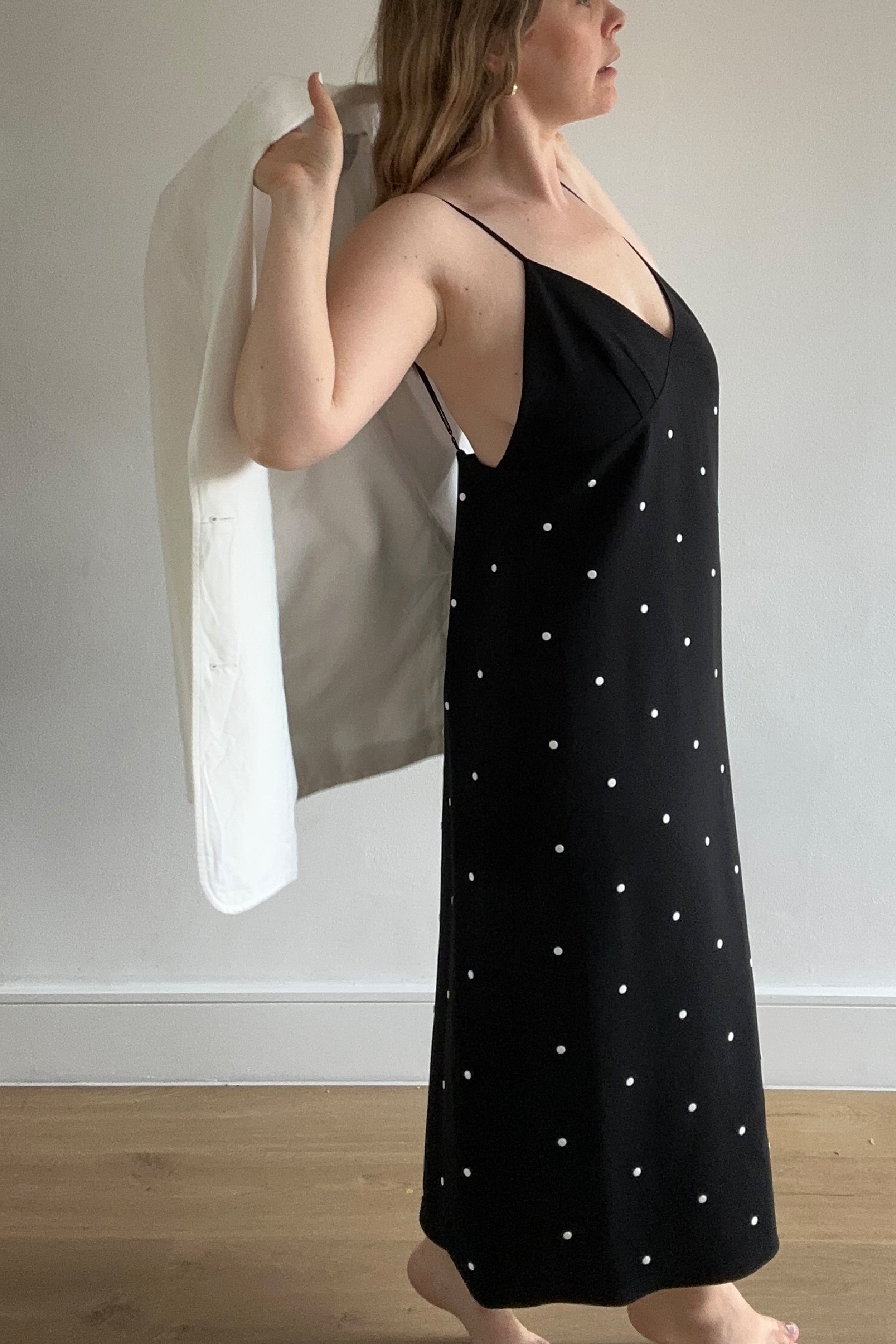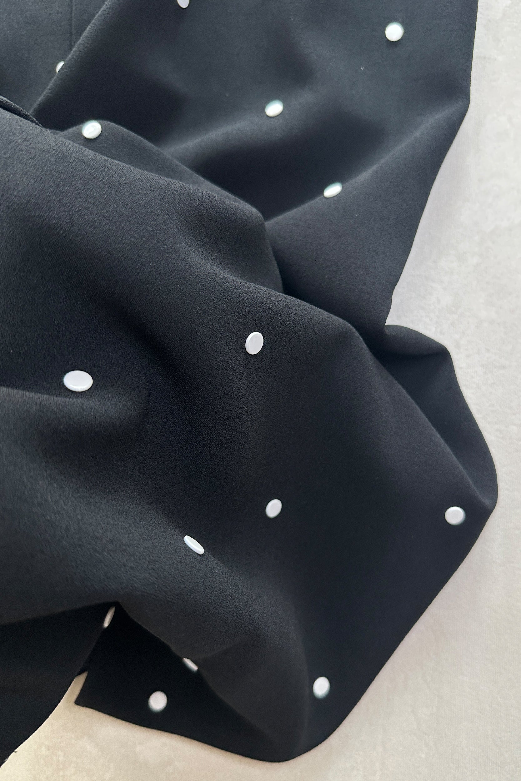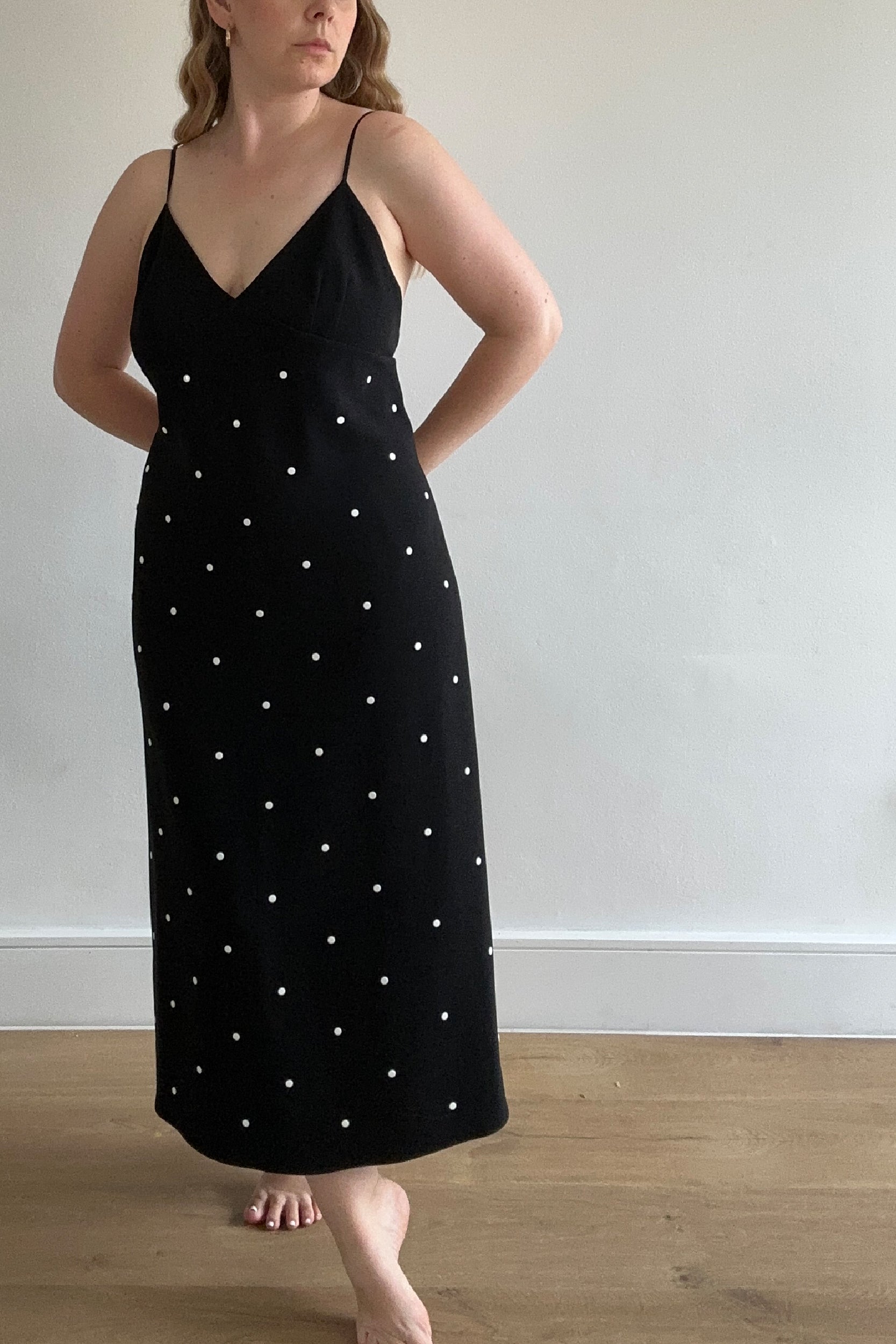 Pre-loved, midi length slip dress from ready-to-wear brand Tibi. The perfect day-to-night or laid-back occasion piece, this black slip is crafted in a mid-weight crepe with a slight stretch and is fully lined in silk. The dress features white flat studs throughout, creating a polka dot pattern, with a concealed zip fastening and back slit.
