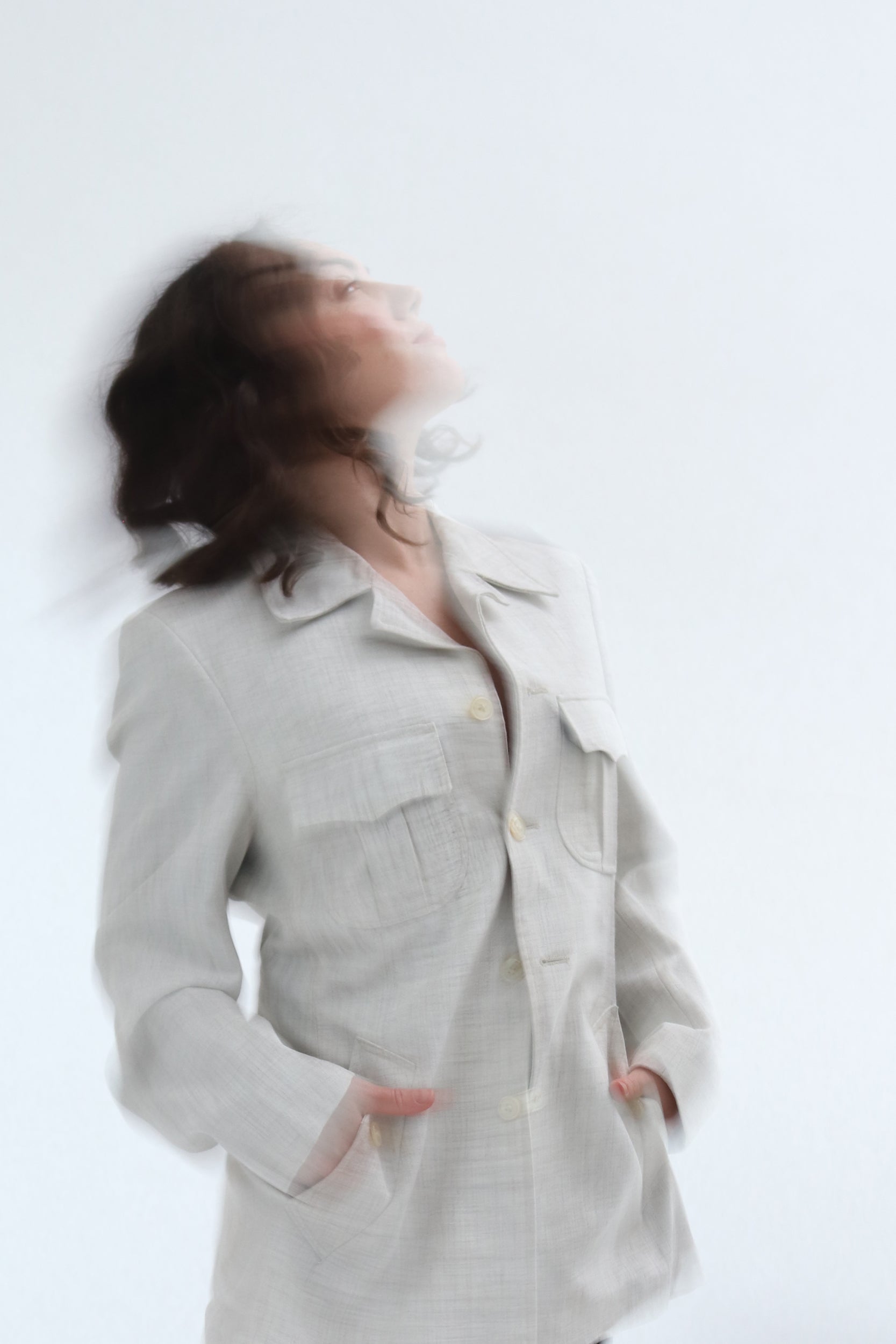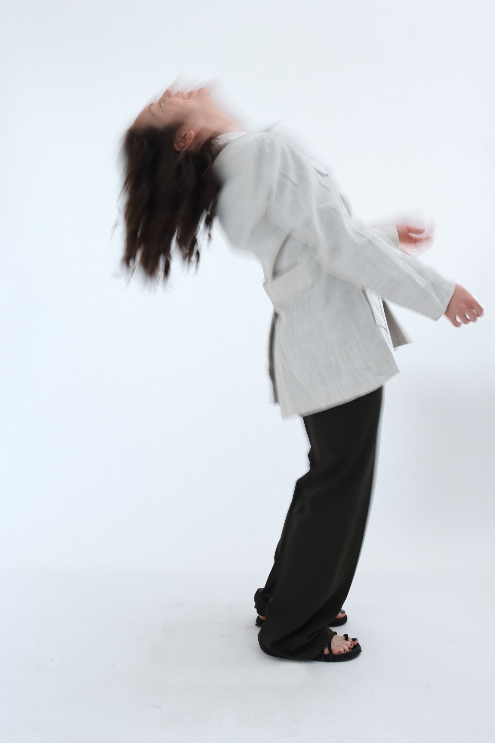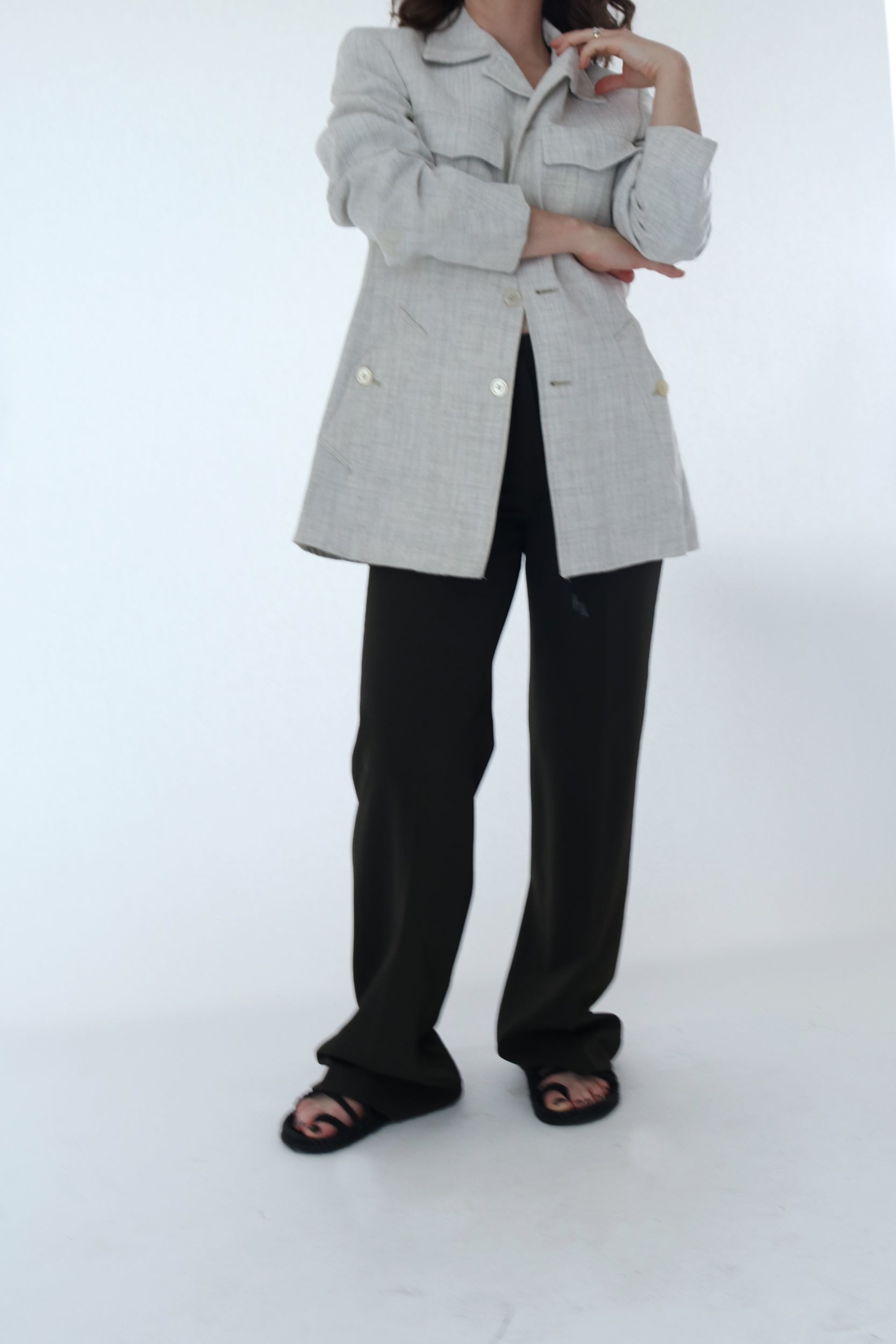 Style Notes: Styled here with khaki tailored trousers with tie detail