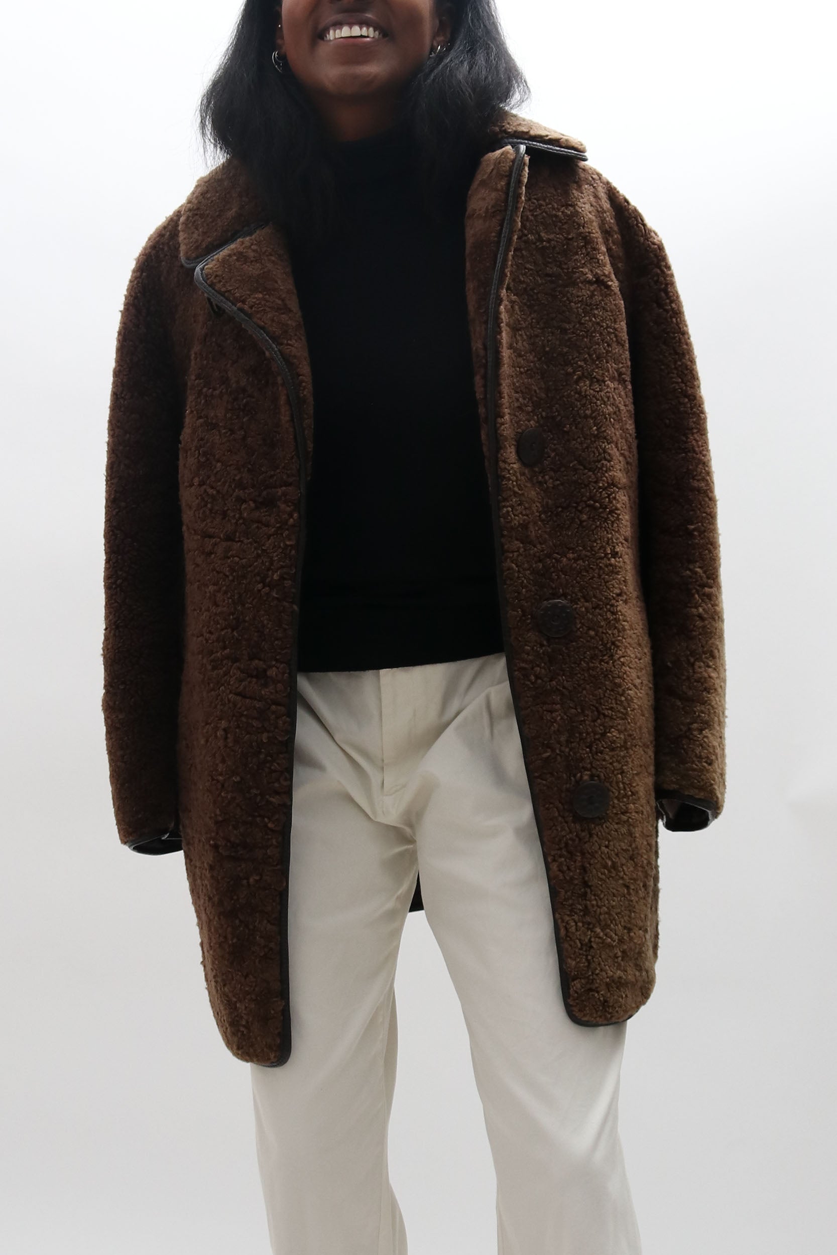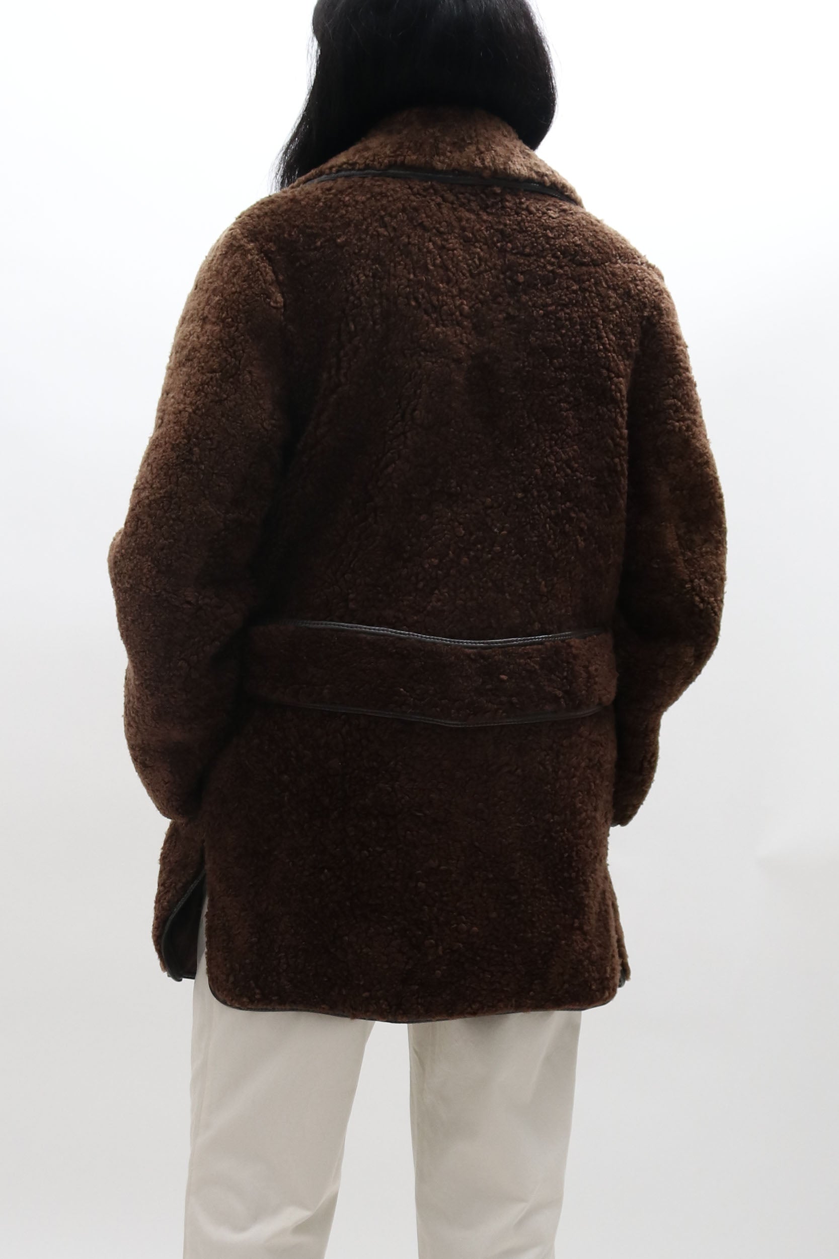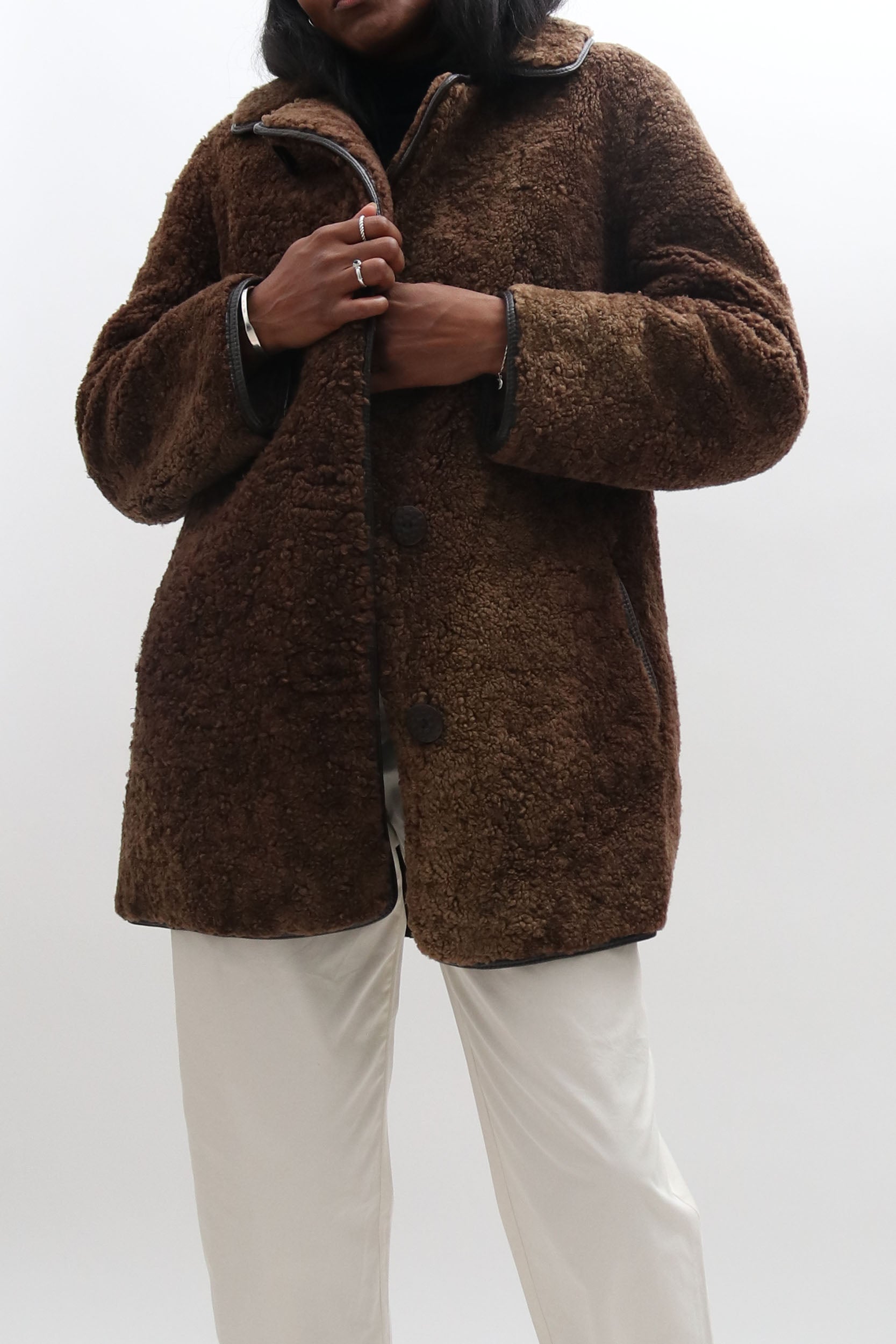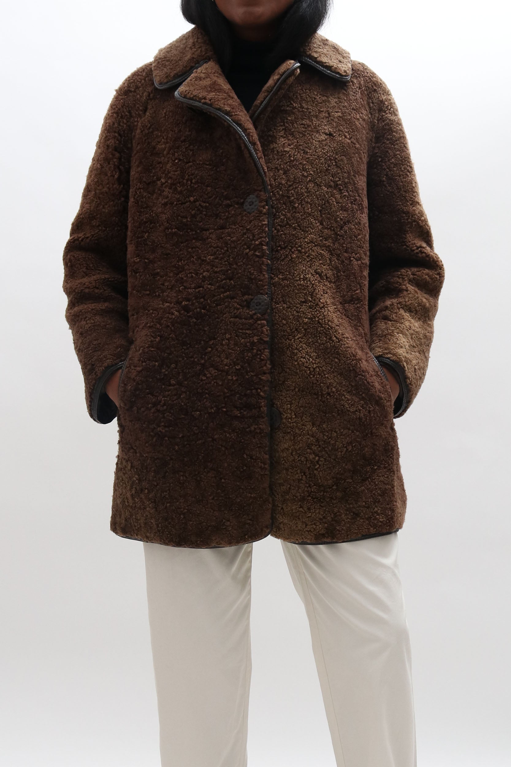 Beautiful chocolate brown shearling short coat, with leather trimmed edges.