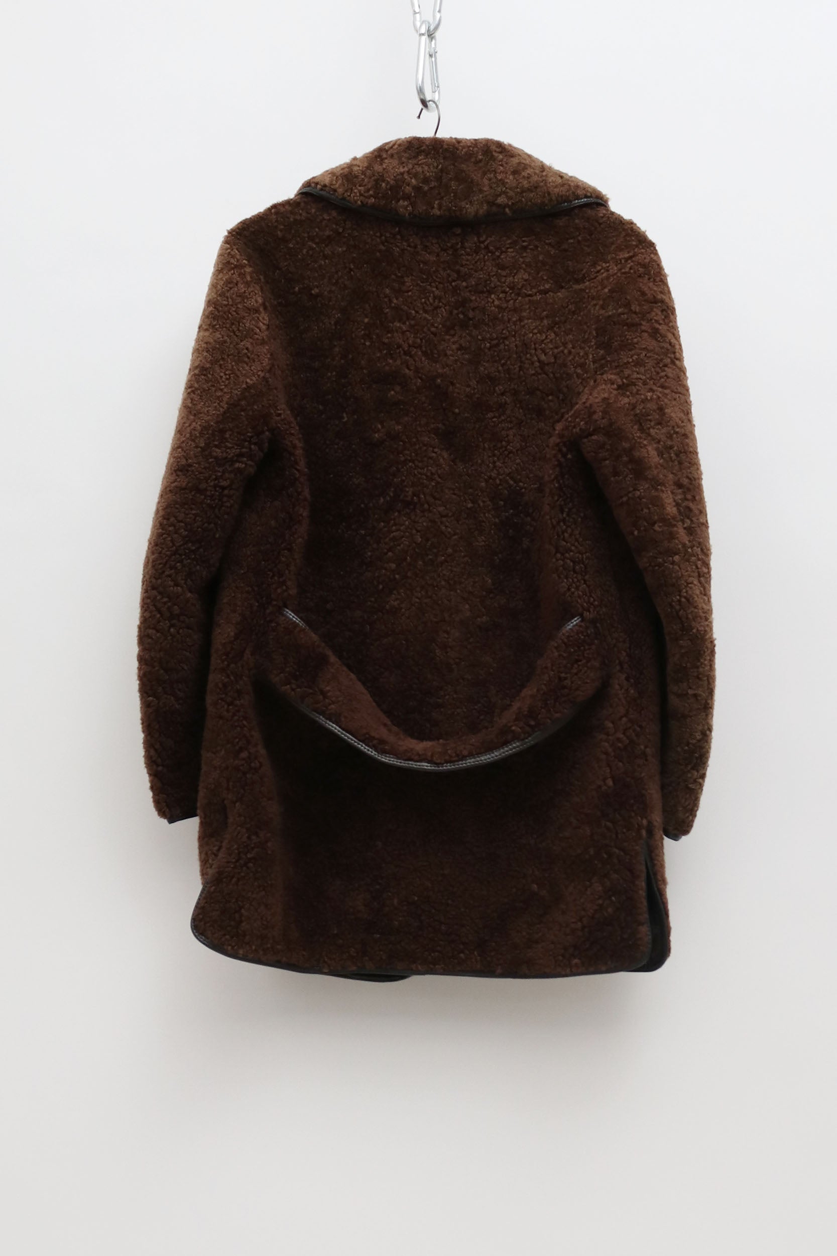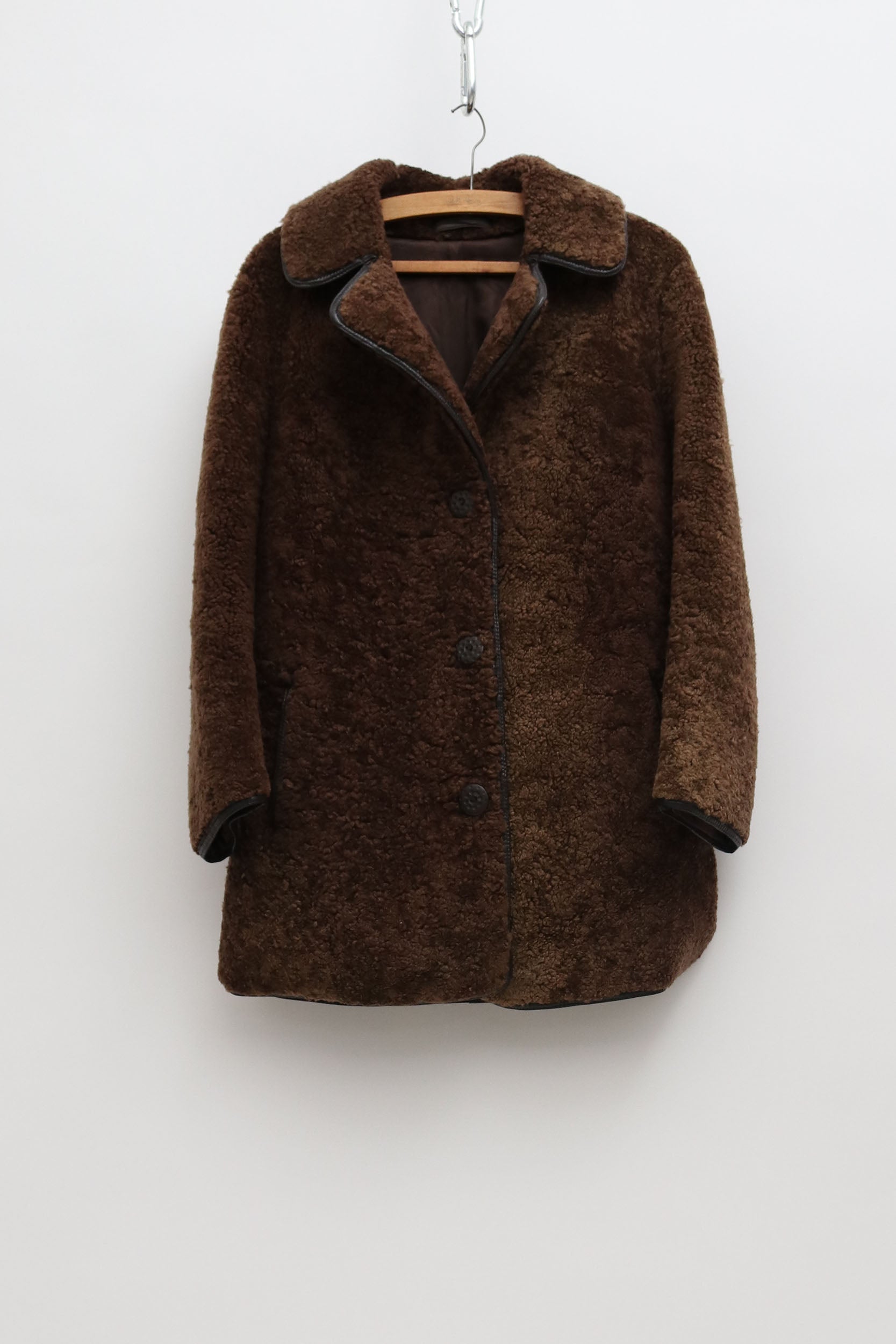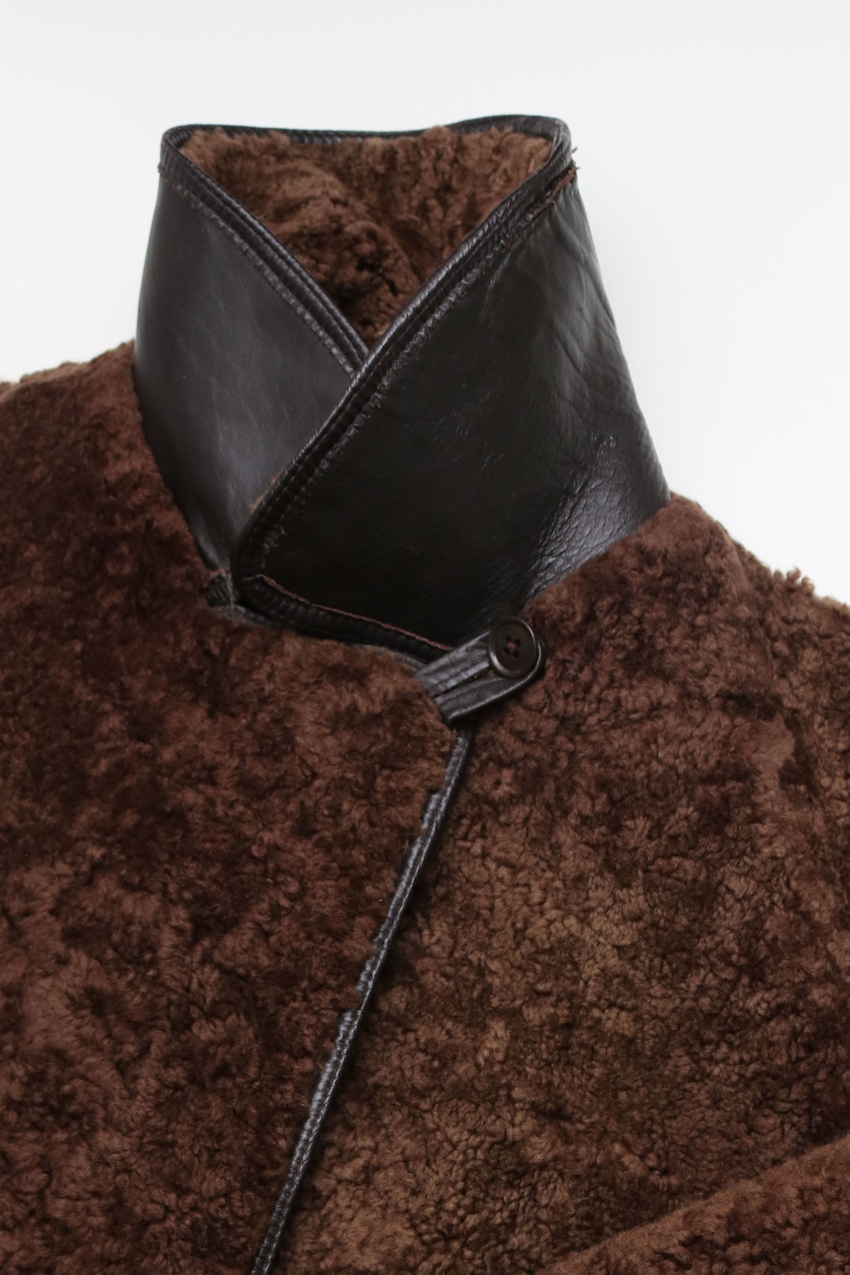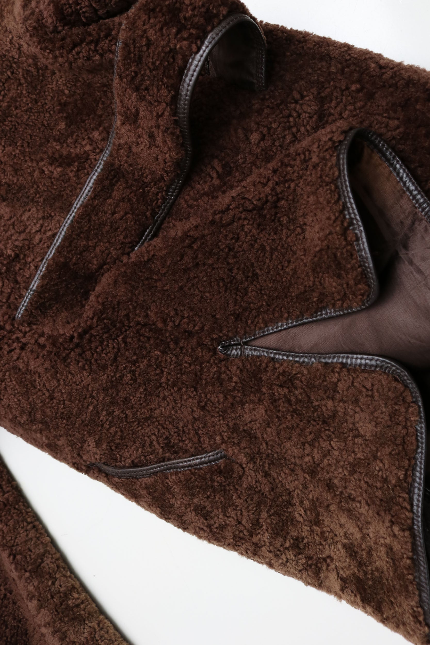 Beautiful chocolate brown shearling short coat, with leather trimmed edges.