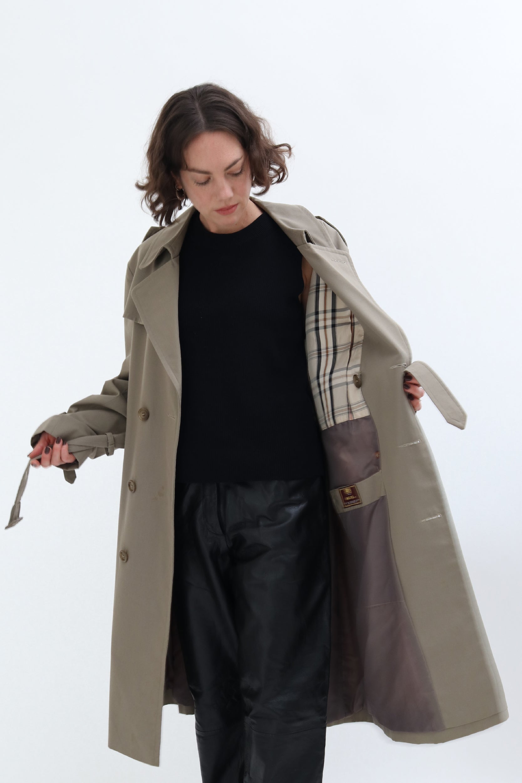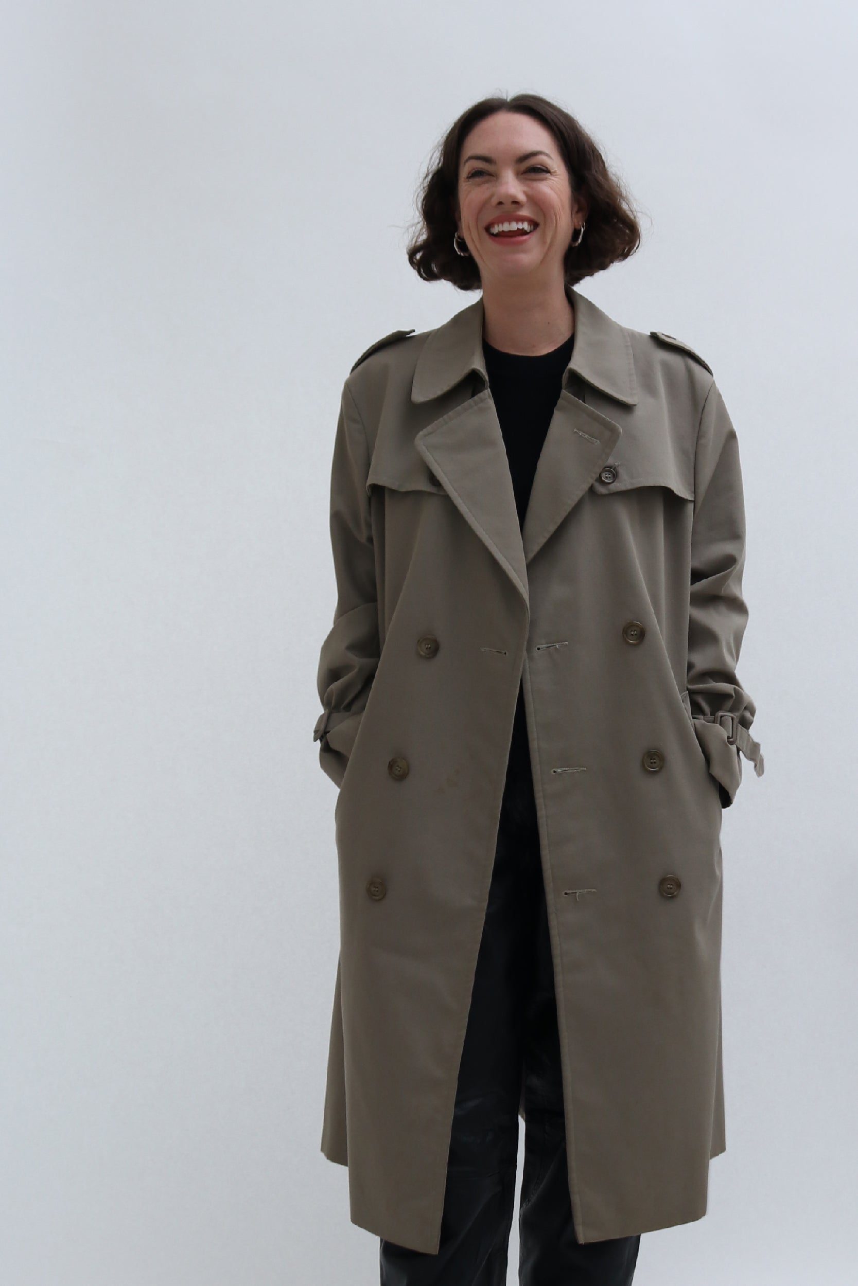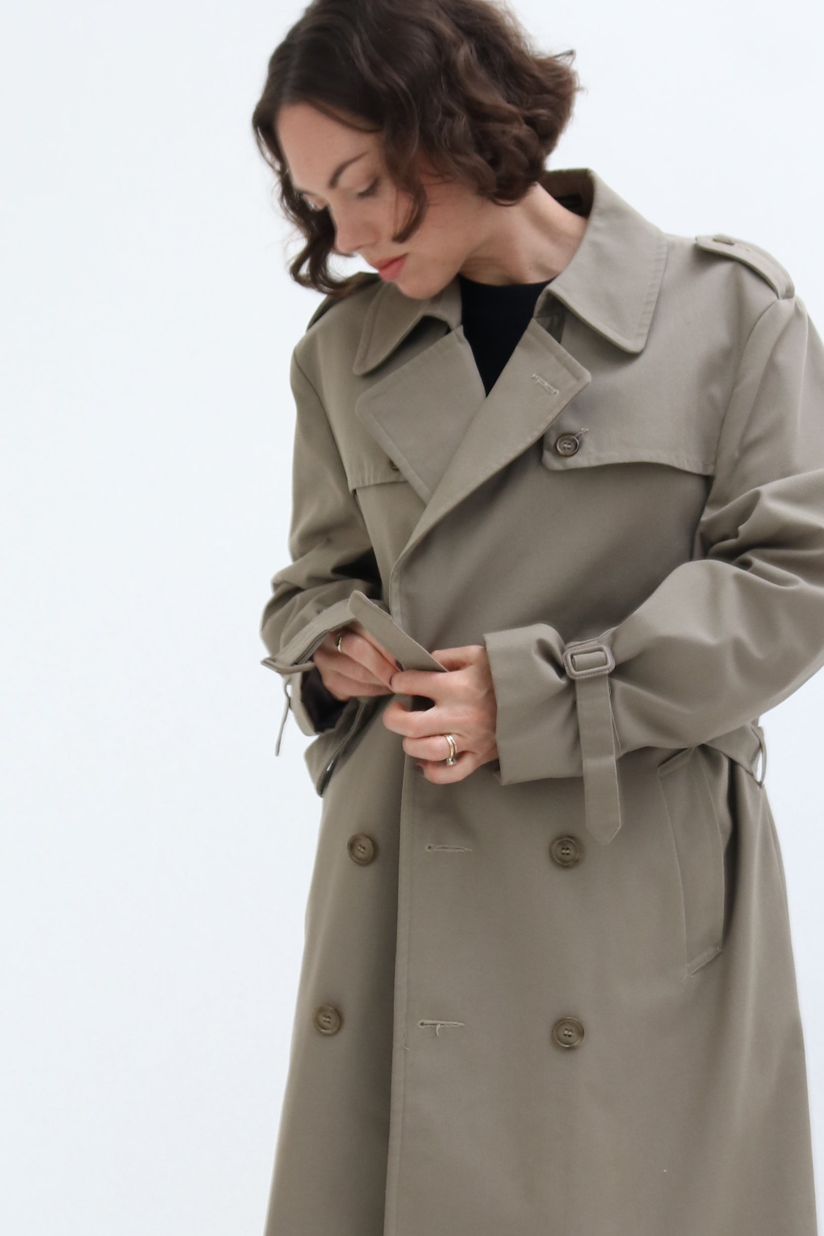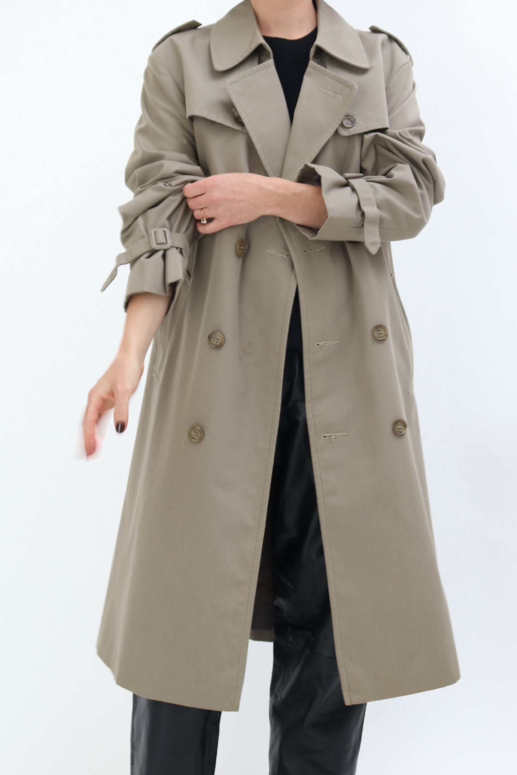 The ultimate transitional outerwear piece, this vintage trench is an update on a classic, in a gorgeous military khaki hue. A timeless piece, this trench is designed with luxury design features such as buckle cinch cuffs a classic double breasted front and is fully lined for added luxe.
