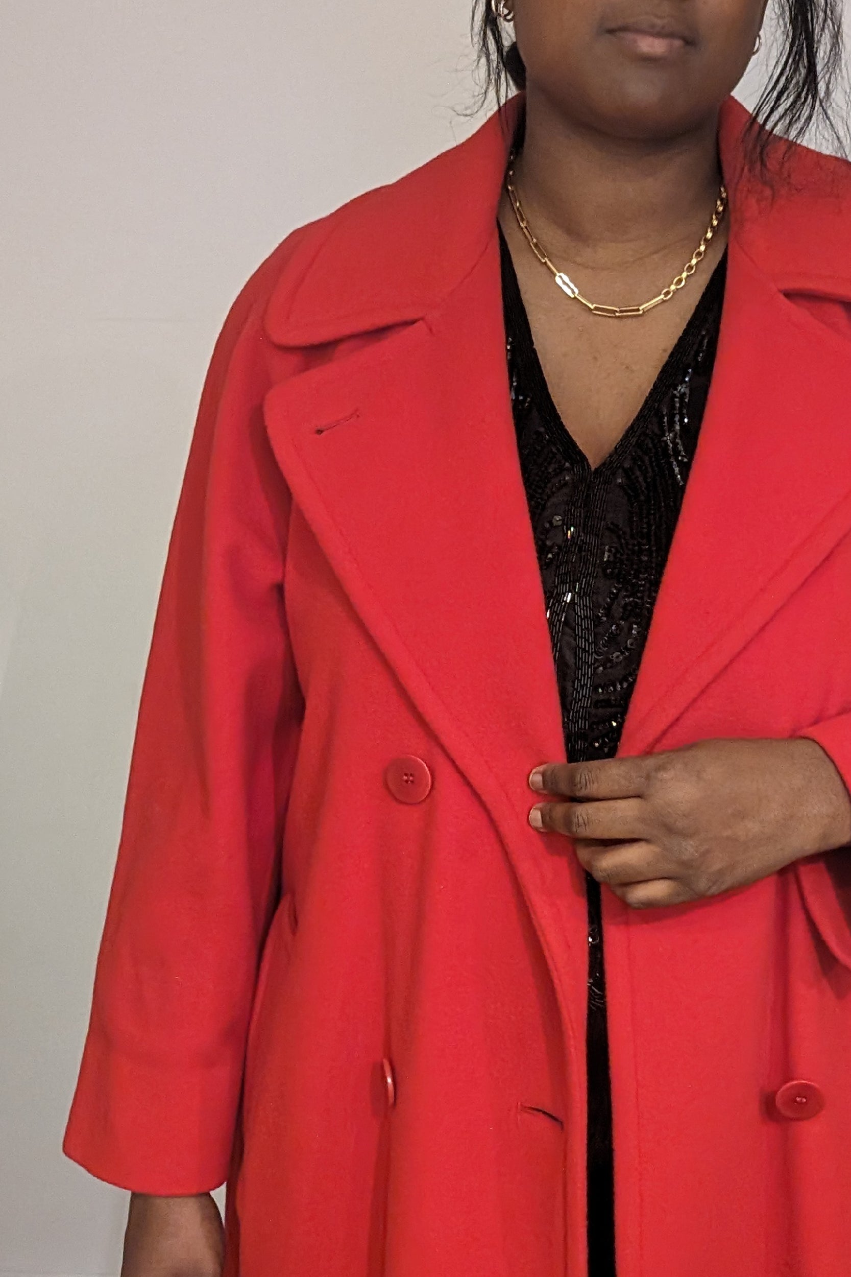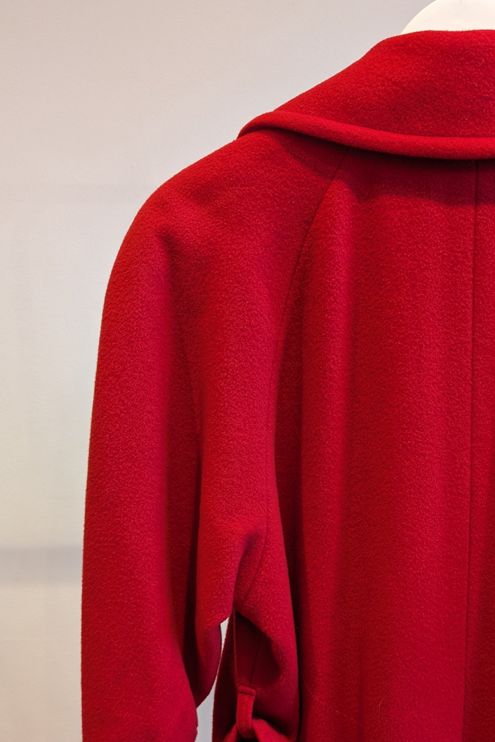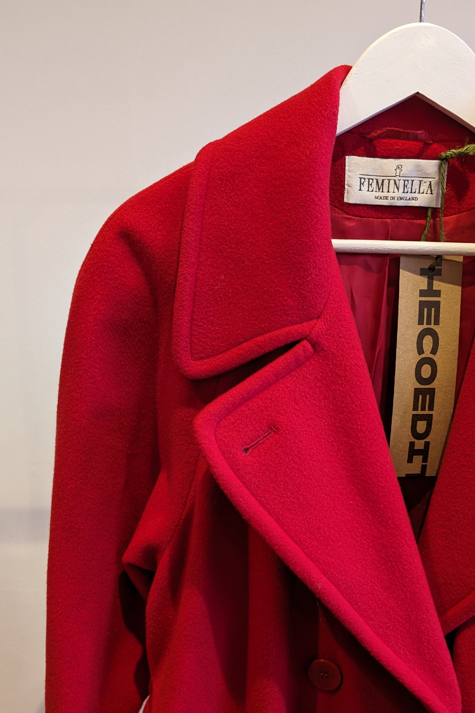 This vintage red coat is a timeless classic. Cut from a cashmere wool blend in a statement scarlet shade of red, it’s a beautiful tailored piece that has an effortlessly relaxed silhouette and considered design details.