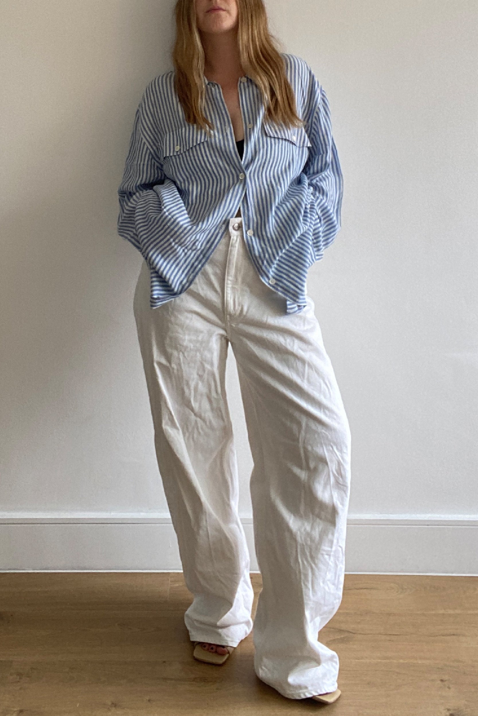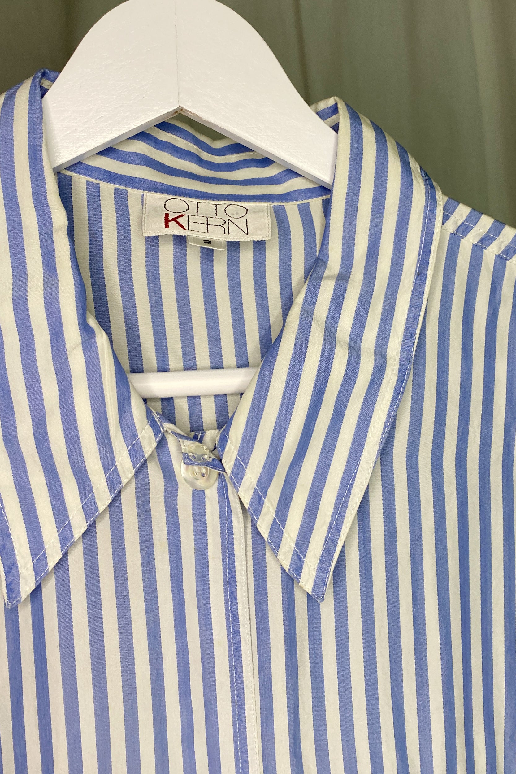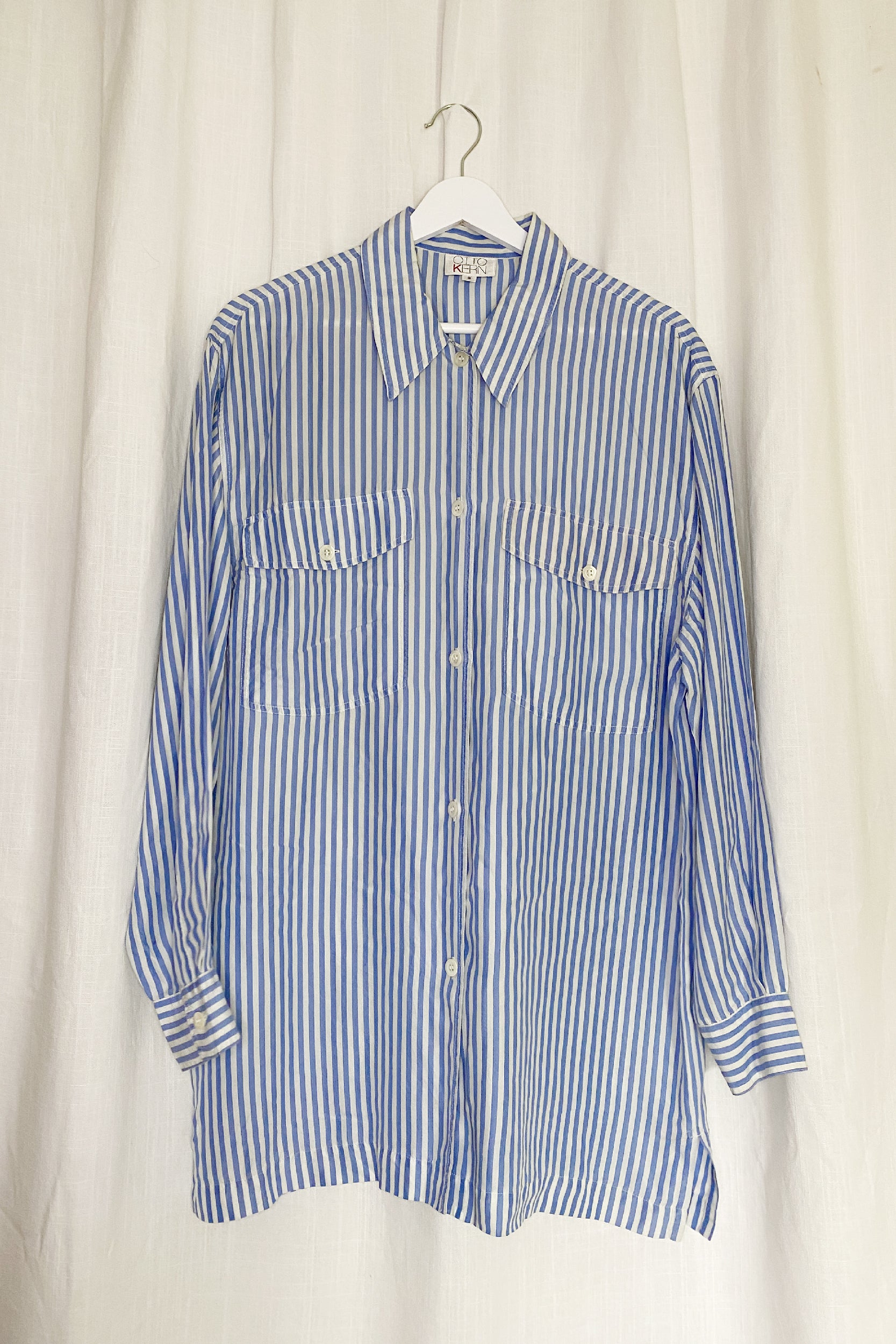 This vintage striped long sleeve shirt is a boxy, longline cut which drapes beautifully. The off-white and pale blue stripe makes it the perfect summer over-shirt, and we love the thought of throwing this on over a bikini. Features: Button cuffs and double patch pocket with button-down flap.