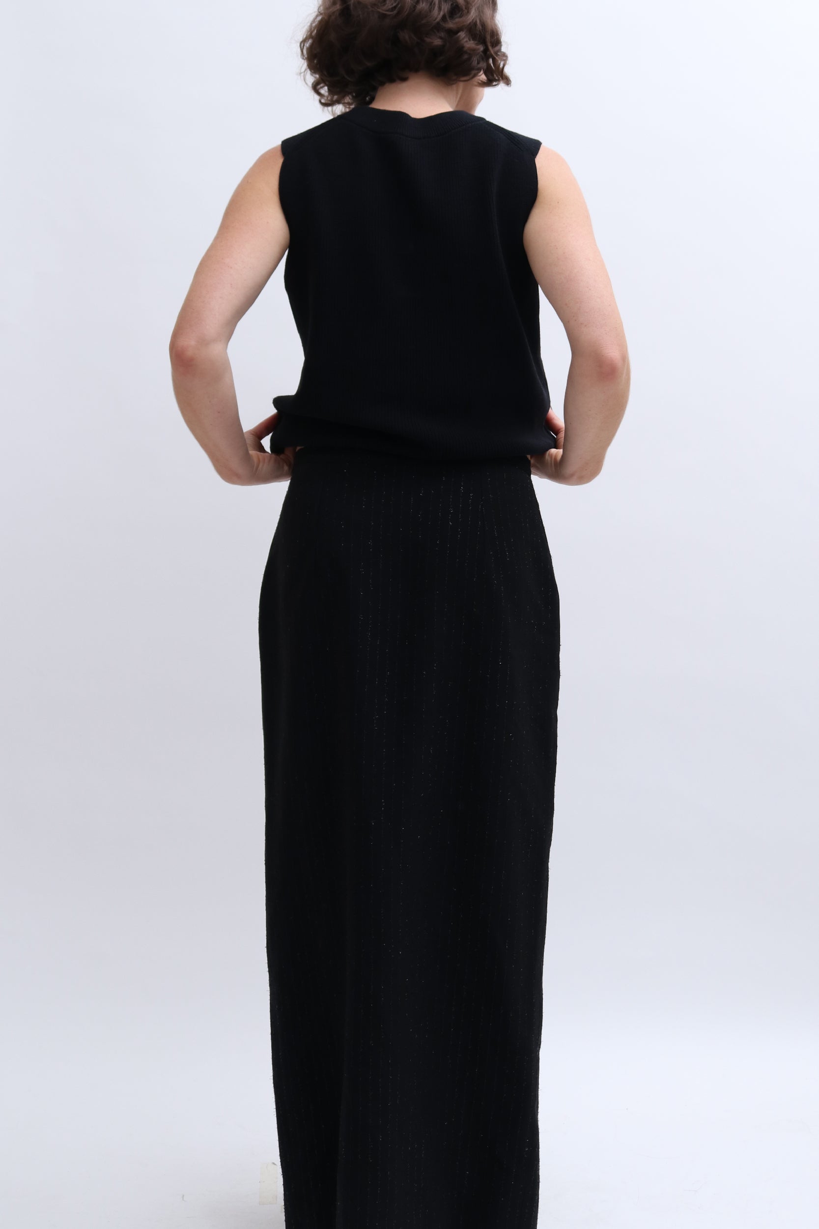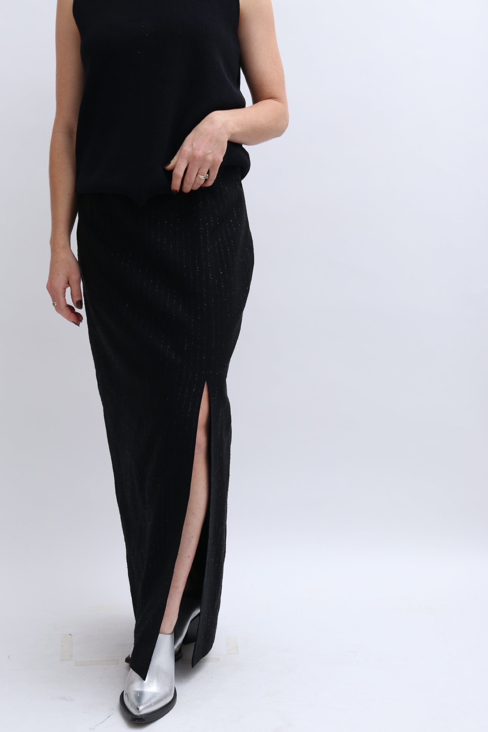 This vintage pencil skirt is a festive update on a classic, with a fun sparkle pinstripe embroidered onto the skirt. Expertly tailored for a cinched high waist, the fit creates an incredible silhouette enhanced by a front thigh split, making it an effortless piece that can be taken from day to night.