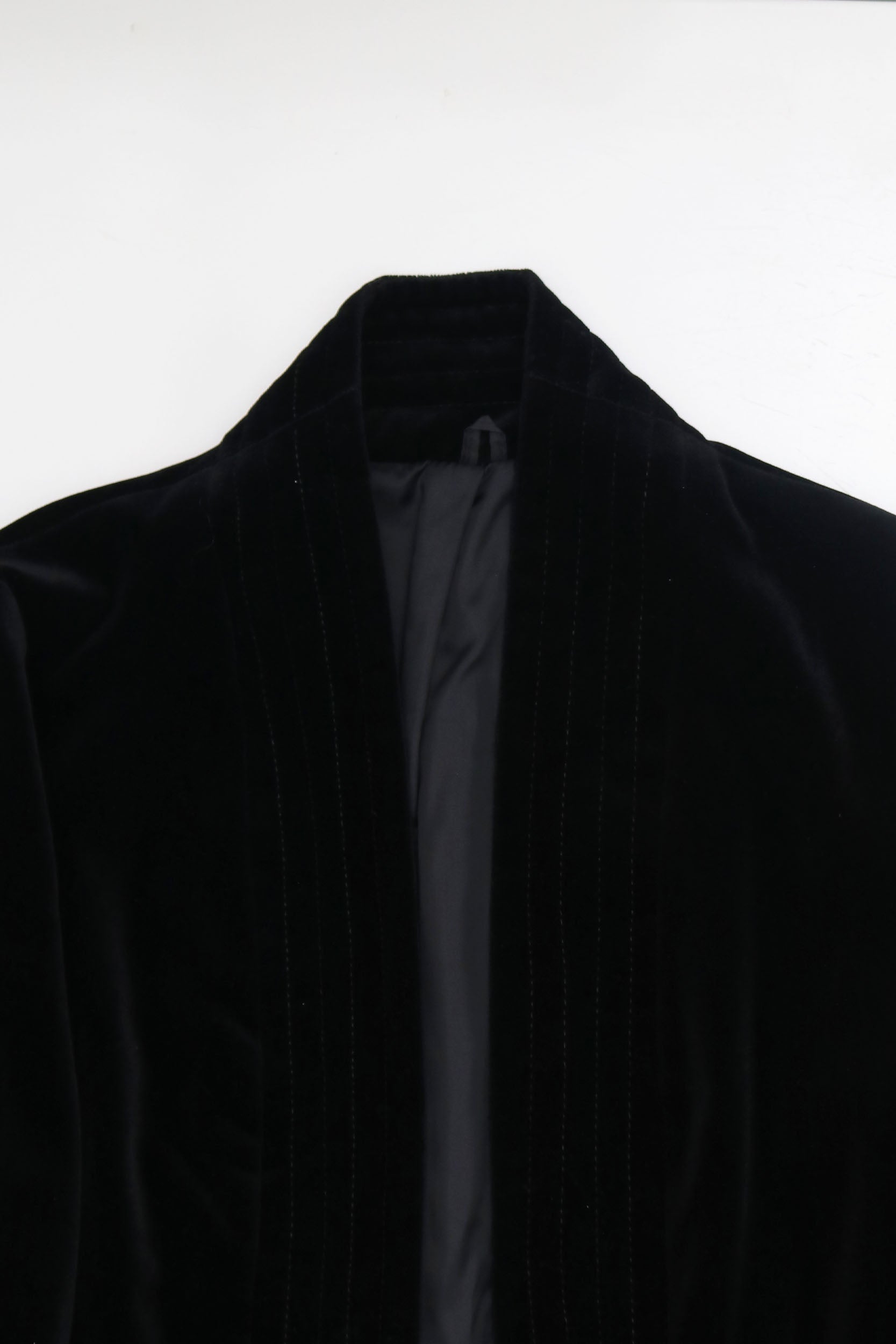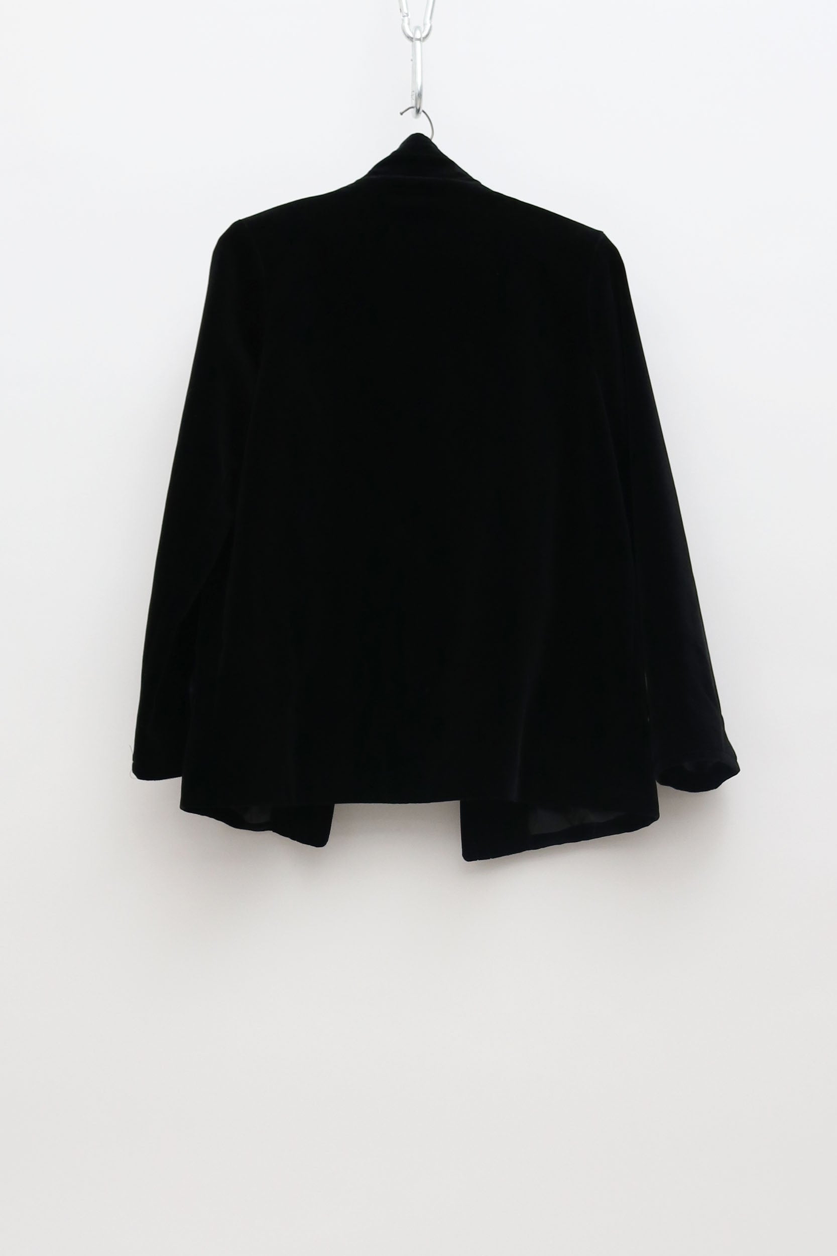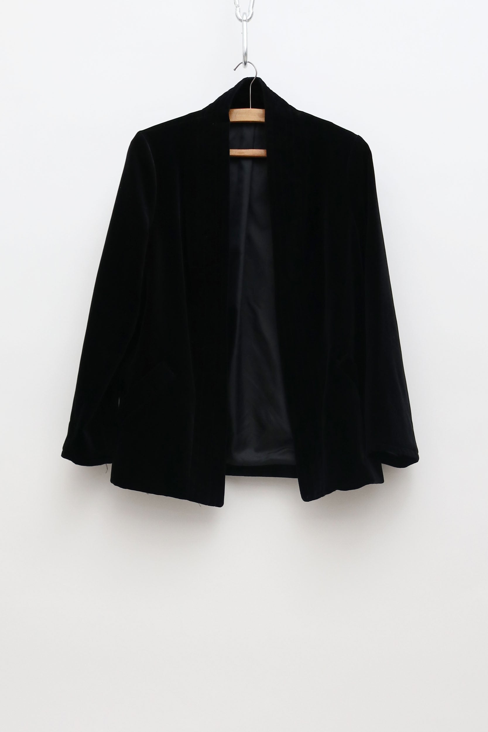 Black cotton velvet vintage blazer. Amazing relaxed silhouette, with no fastenings and welt pockets this is the perfect lounge—style festive piece.