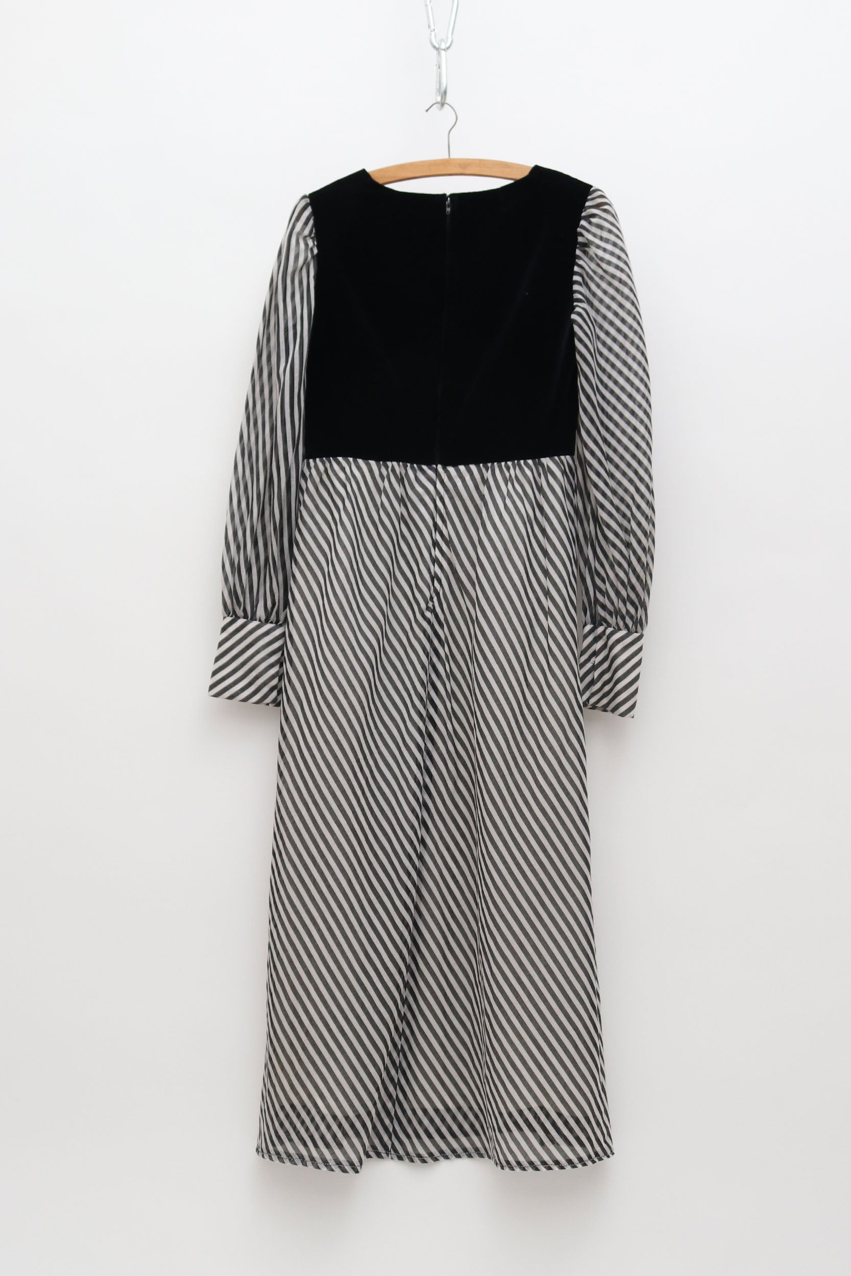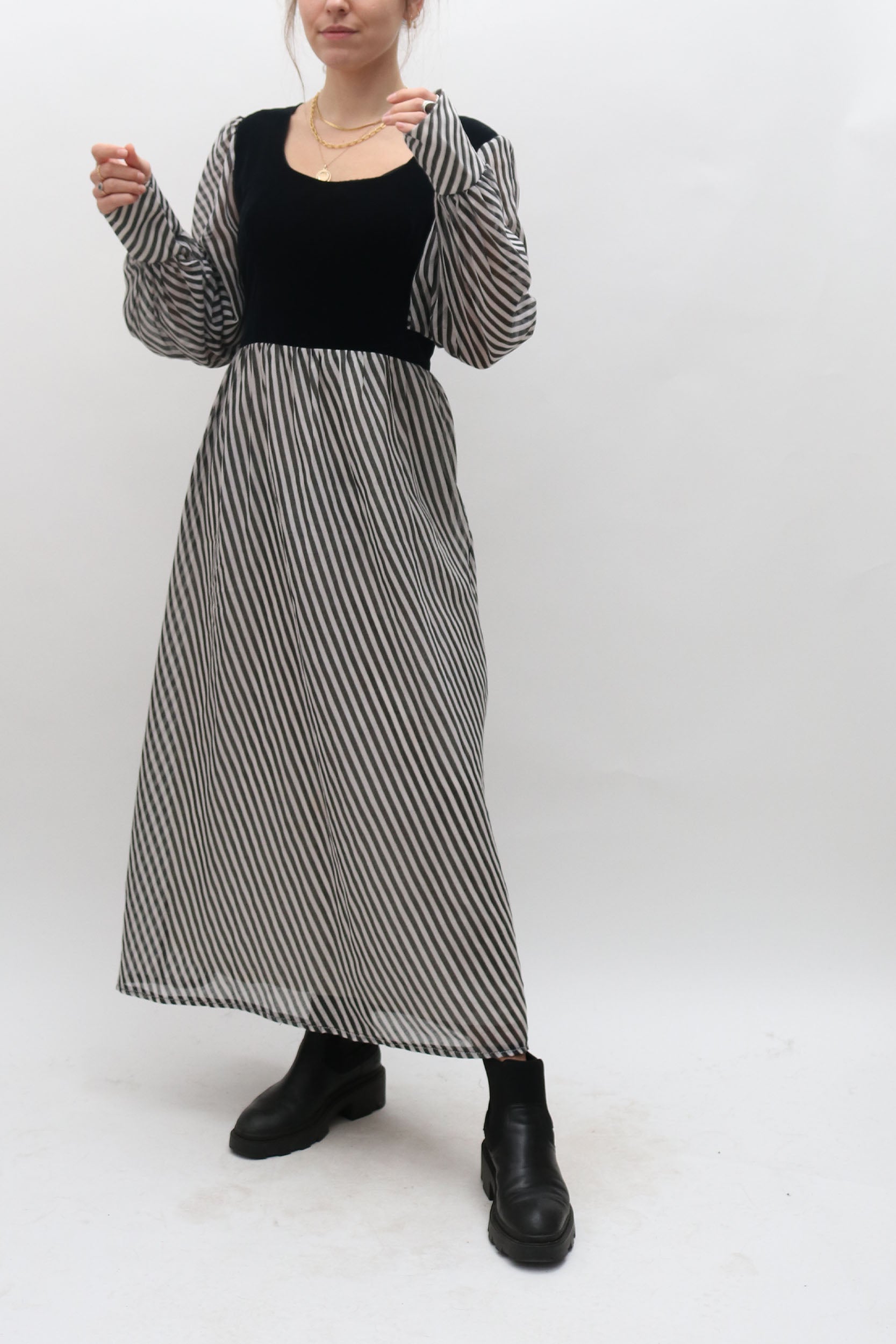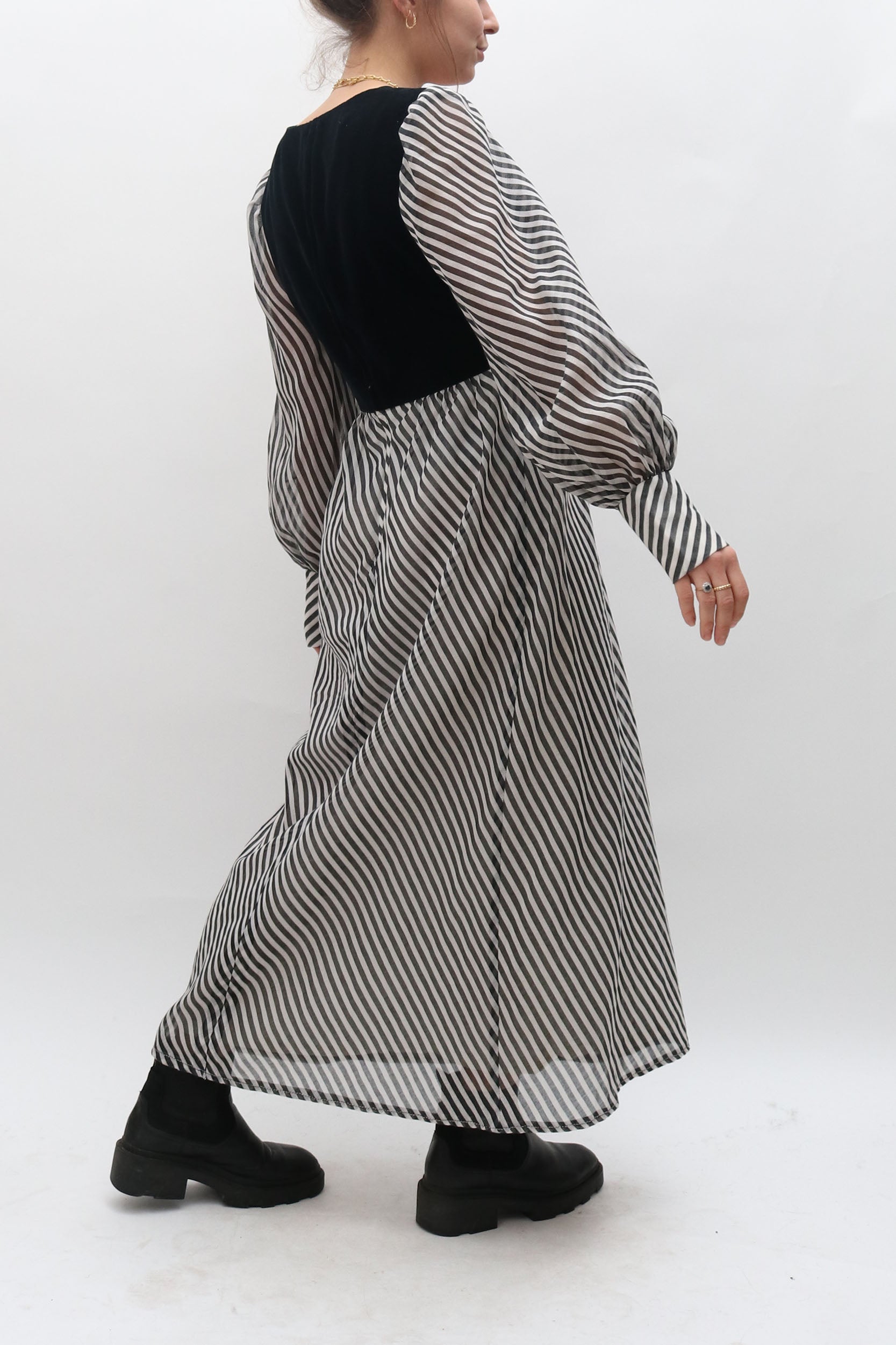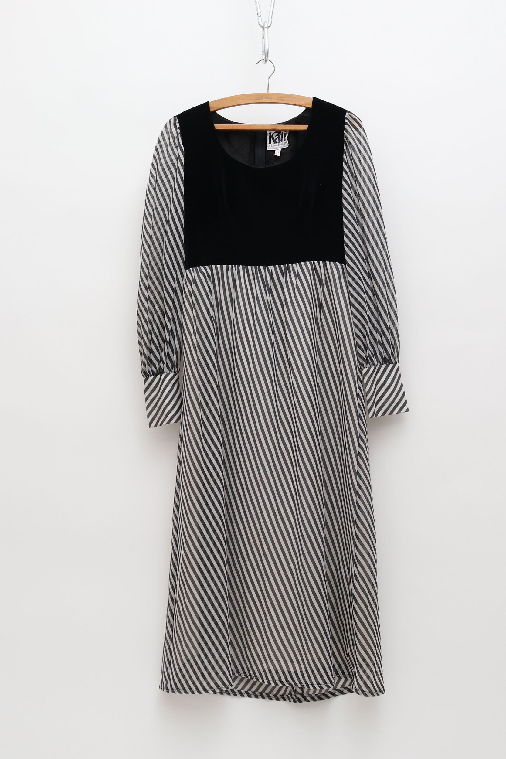 Black and white, puff sleeve vintage dress with velvet bodice. Beautiful quality, with stunning details such as the generous cuffs which emphasise the voluminous sleeves.