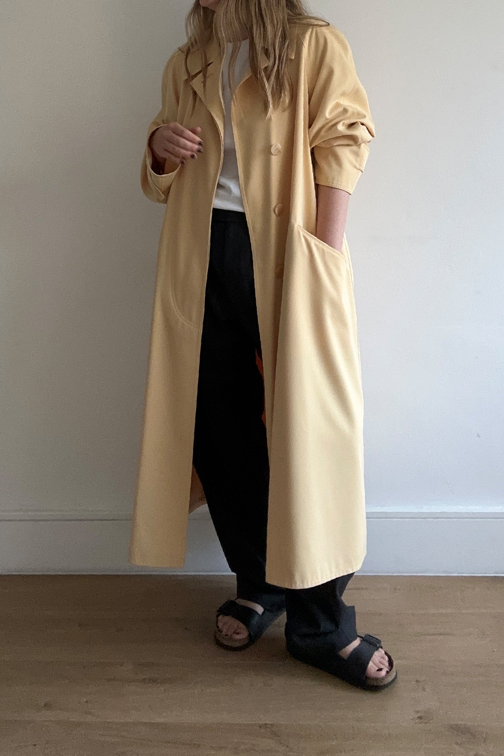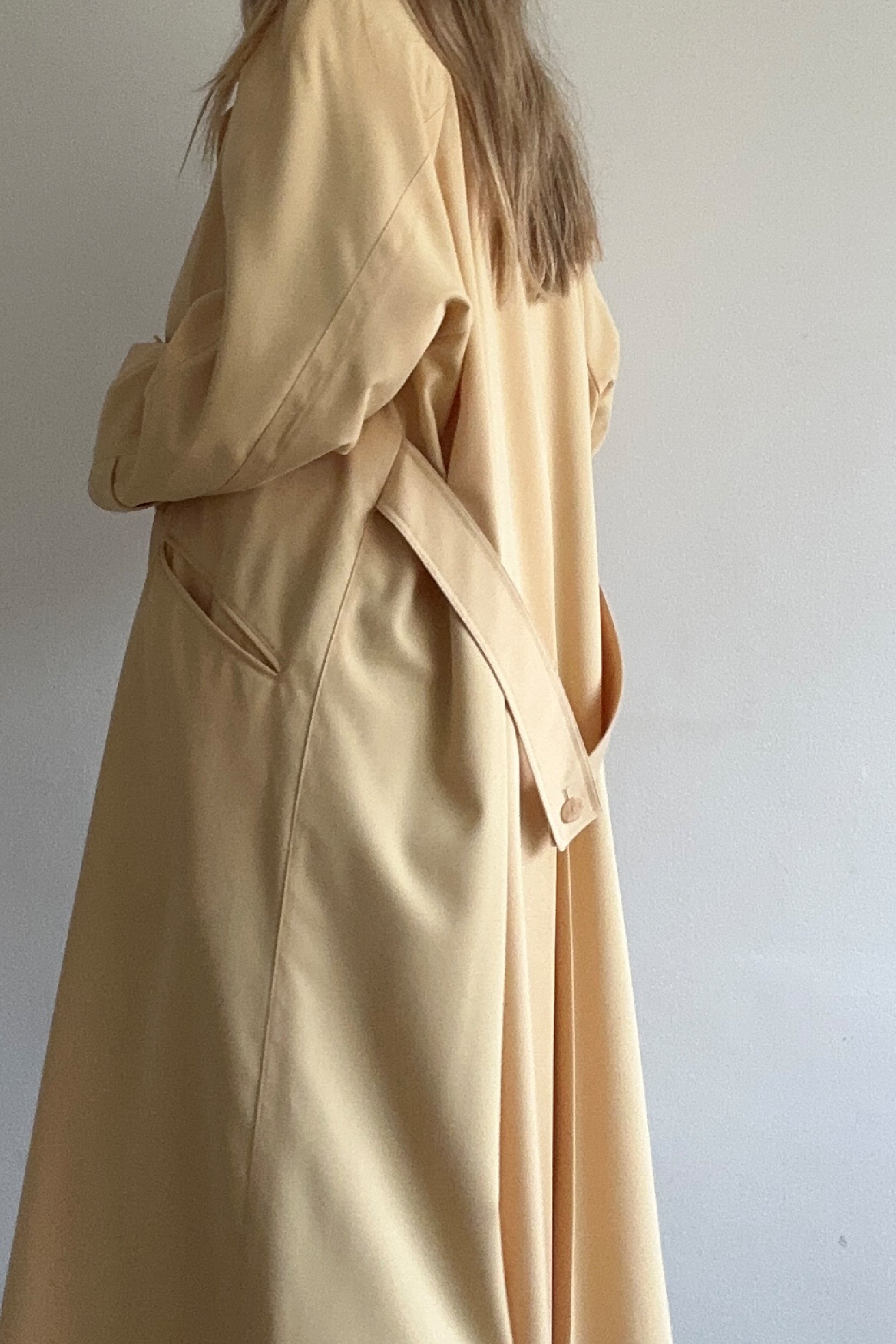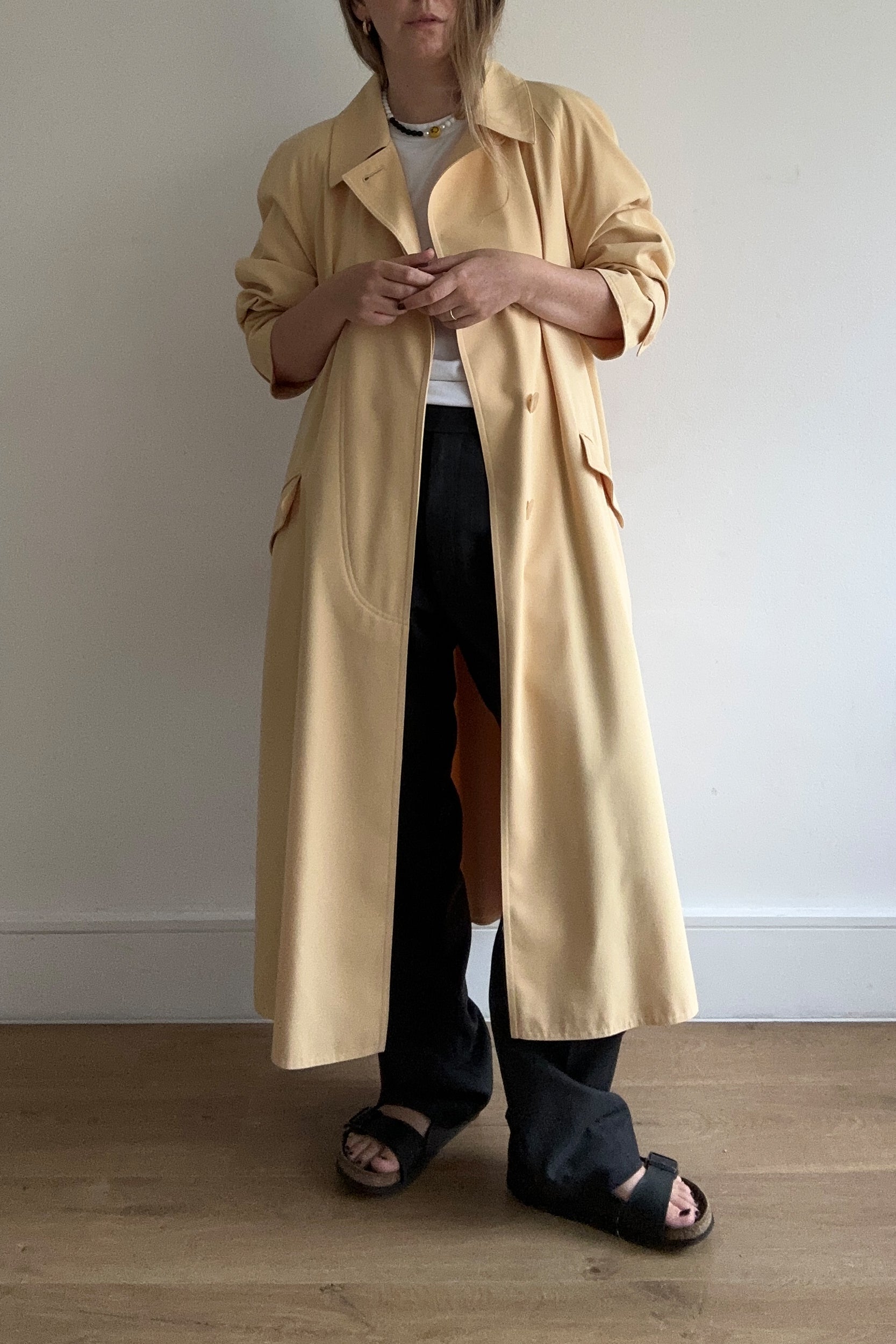This amazing vintage coat is cut with a raglan sleeve and a longline, swing silhouette. Crafted in the most perfect buttery yellow tone, the trench-style overcoat is fully lined and features a beautifully pleated back with dropped belt detail.